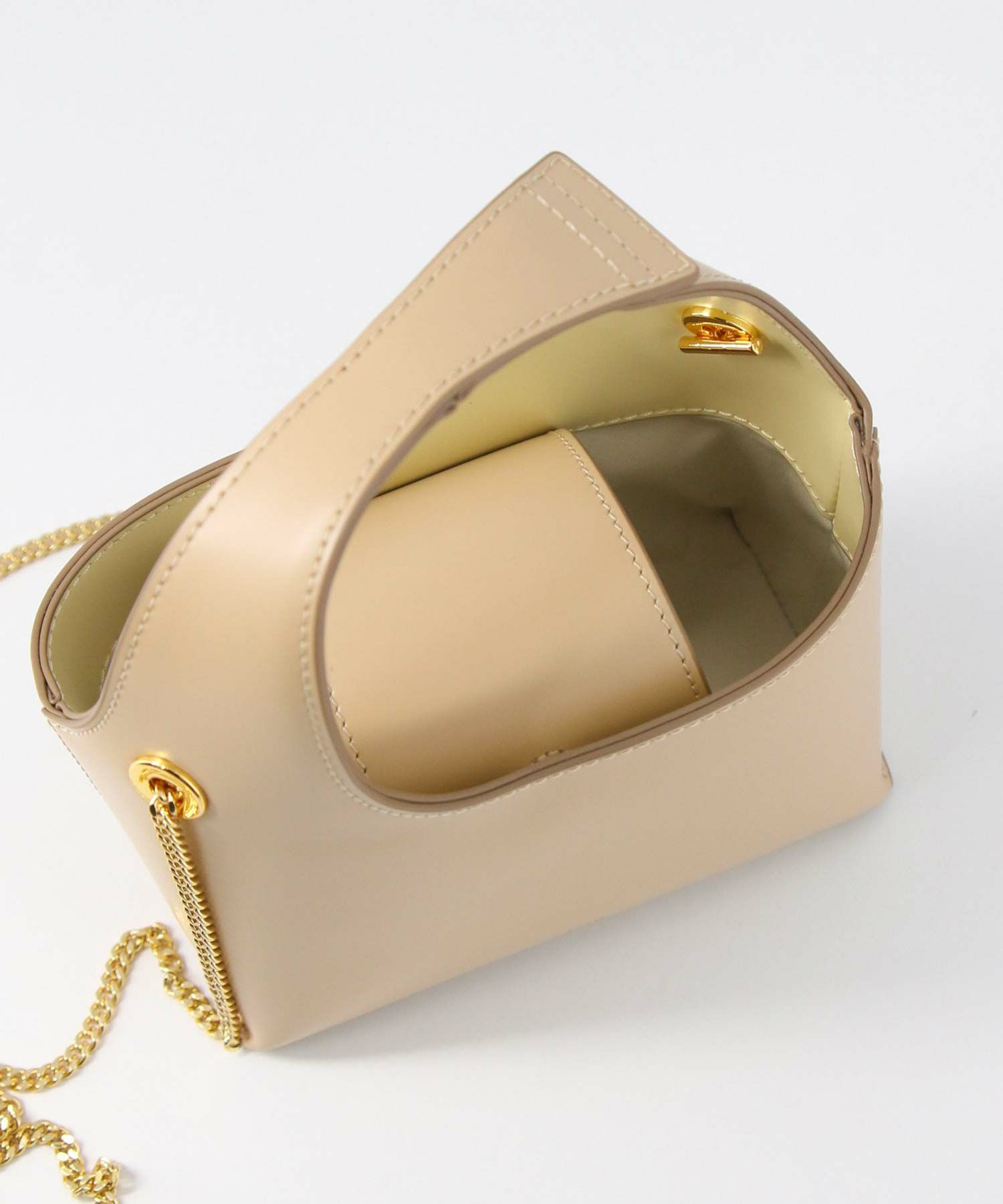 素材はやさしい光沢が印象的なガラス調の牛革を使用。表地と裏地をバイカラーにすることや、チェーンストラップで女性らしさをプラス。