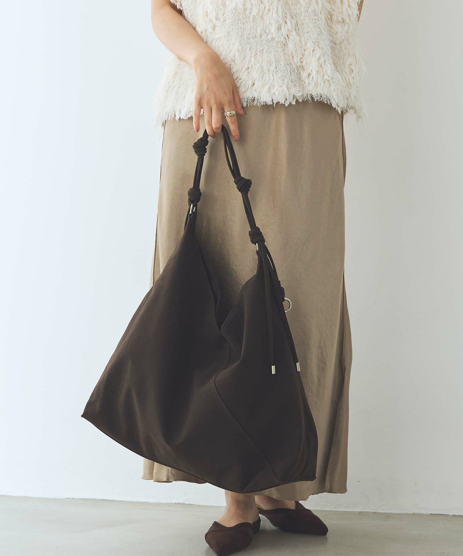 風合いのあるスウェードタッチ素材を使用し、トレンドを意識したデザイン。