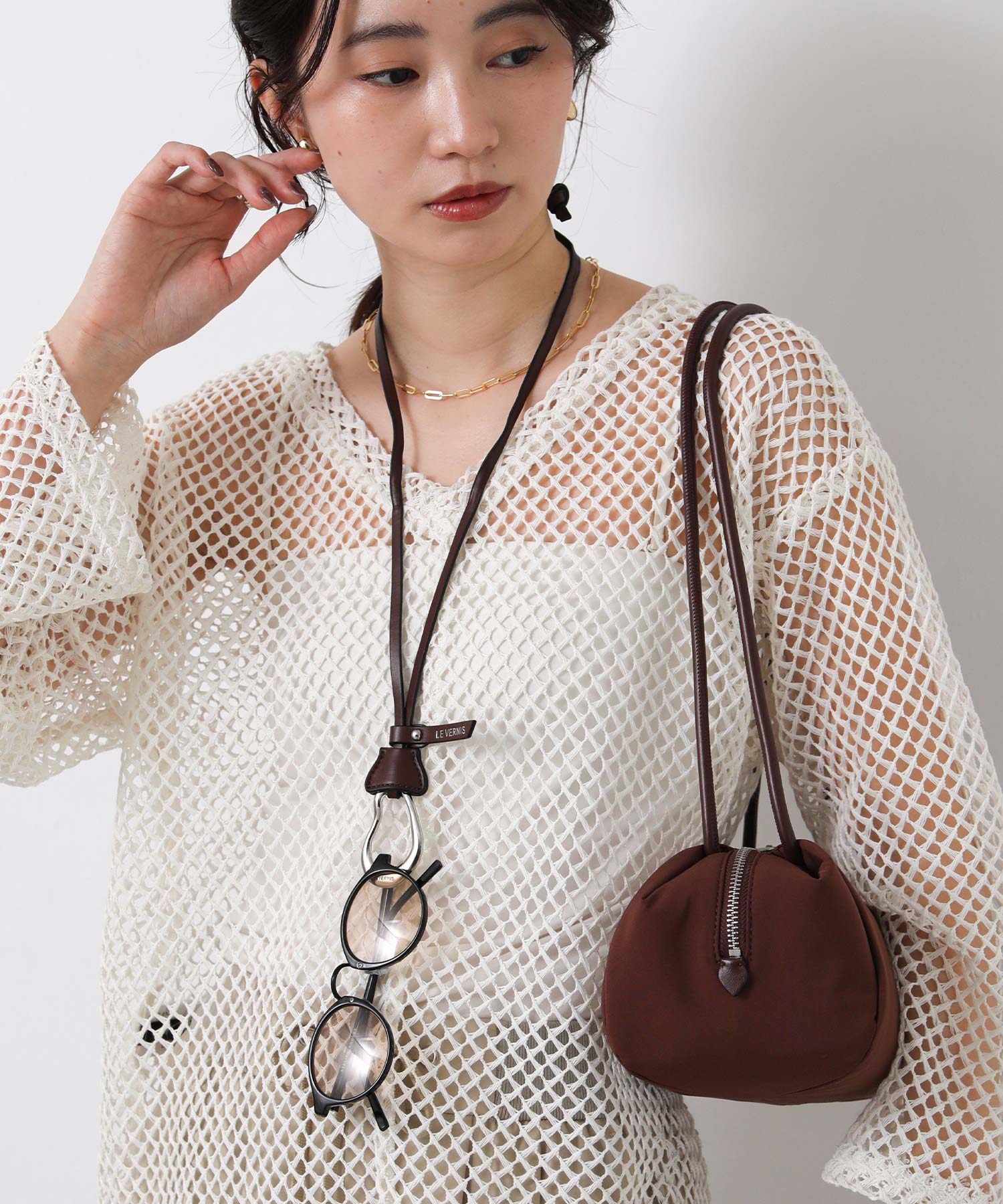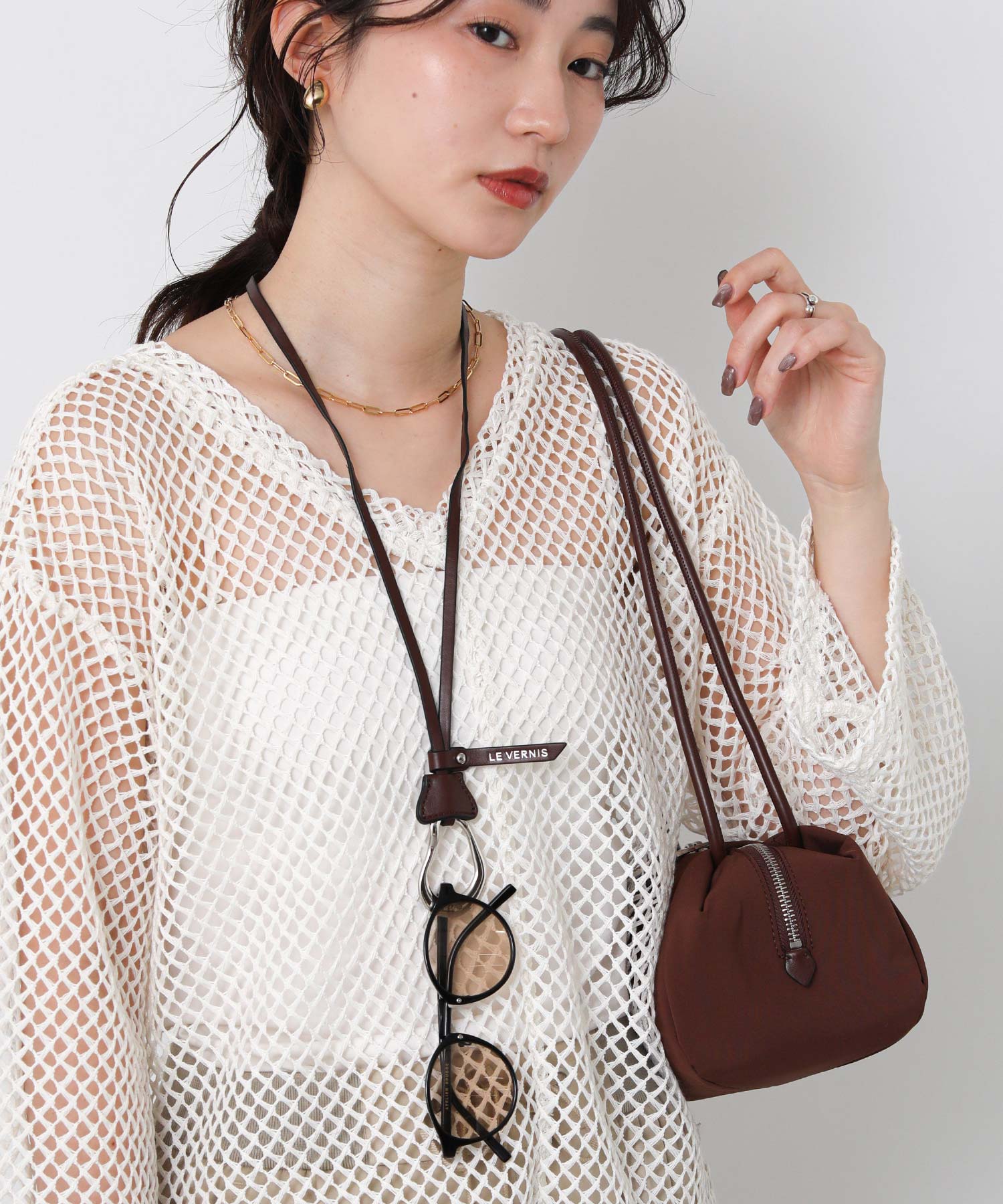 アクセントとなるPOIRE型チャームはストラップを長めにしているので、首からかけてサングラスホルダーとしても使用できます。