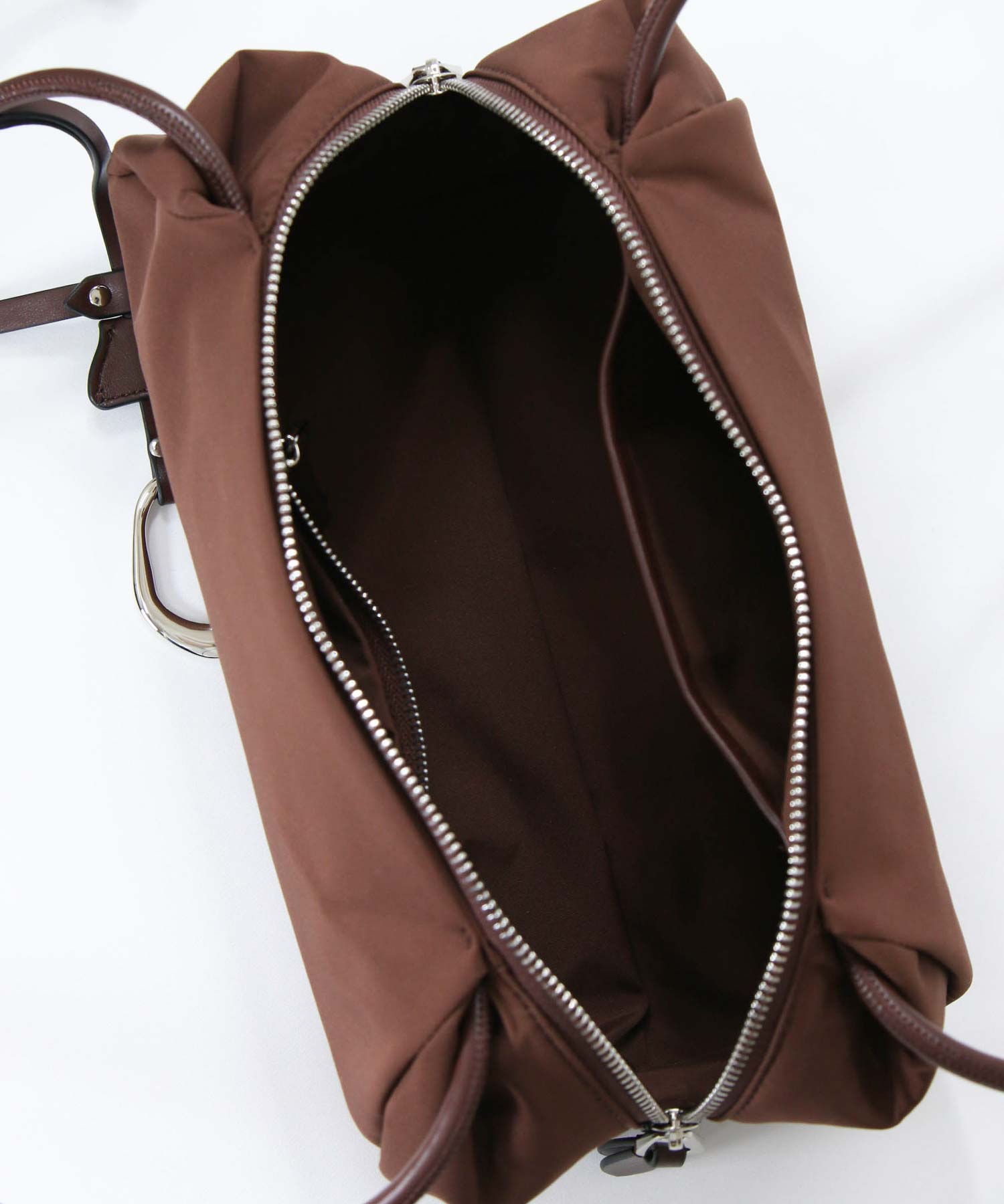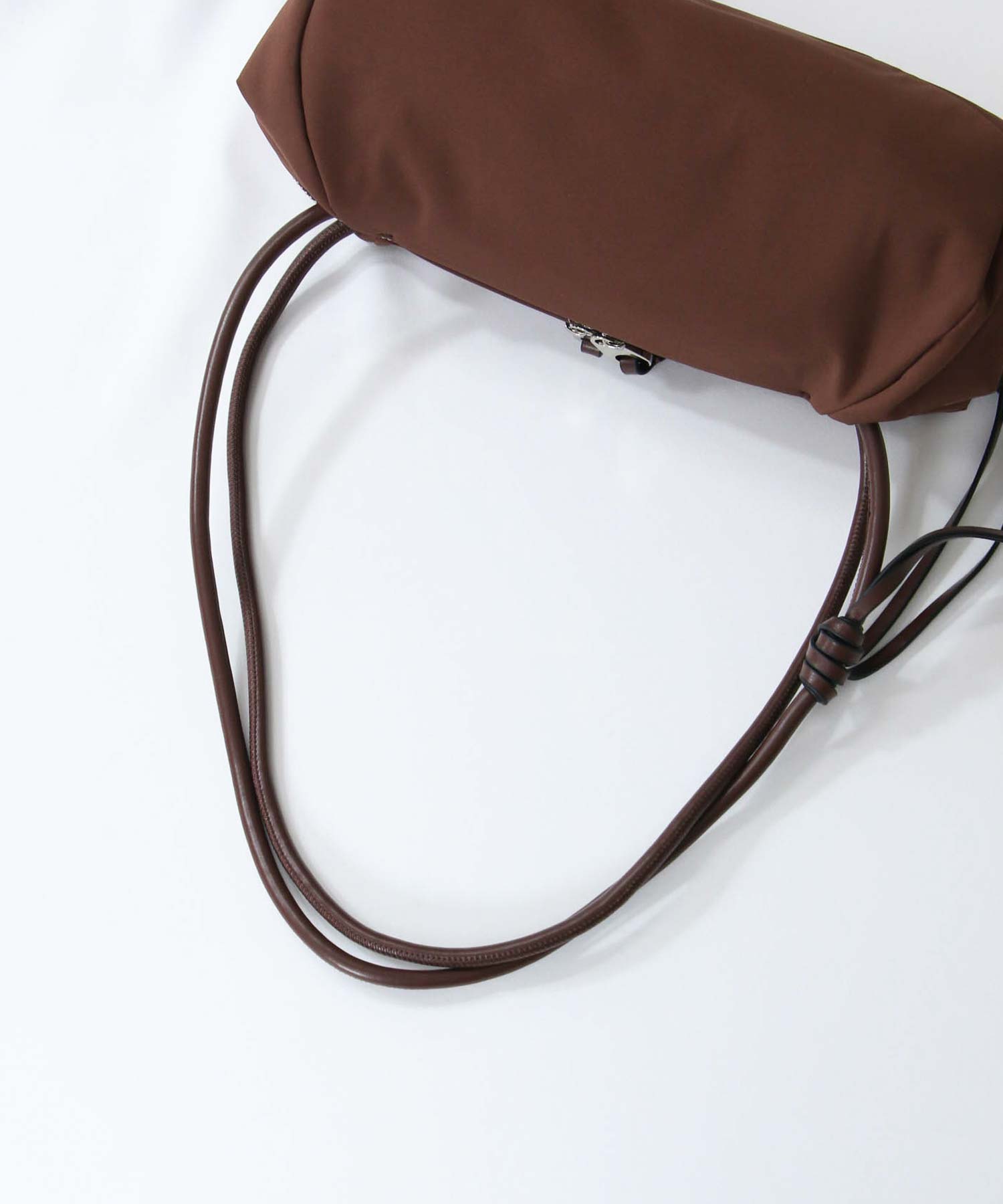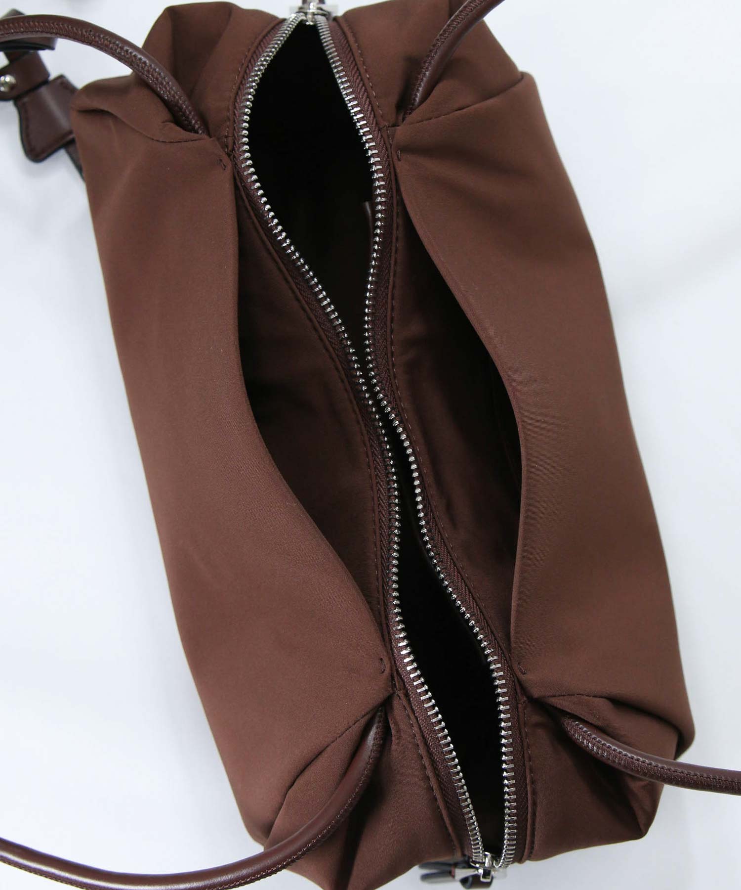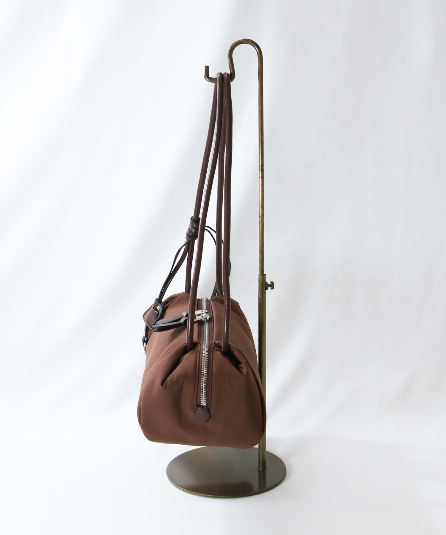 端をタックで織り込んだような特徴的なシルエットに、長めのハンドルでトレンド感をプラスしたデザイン。
