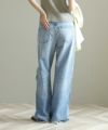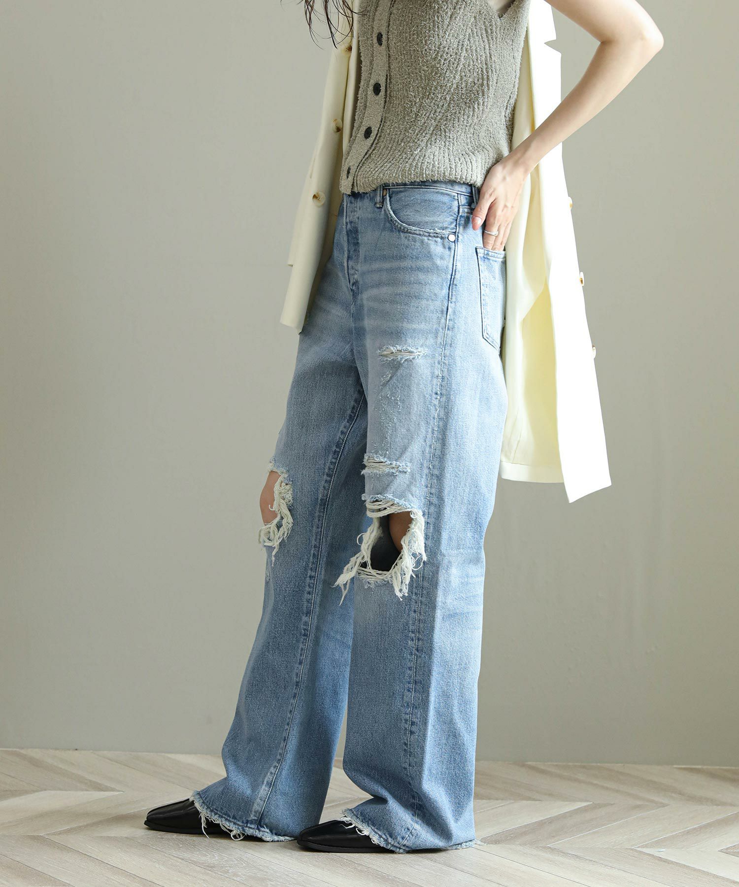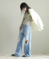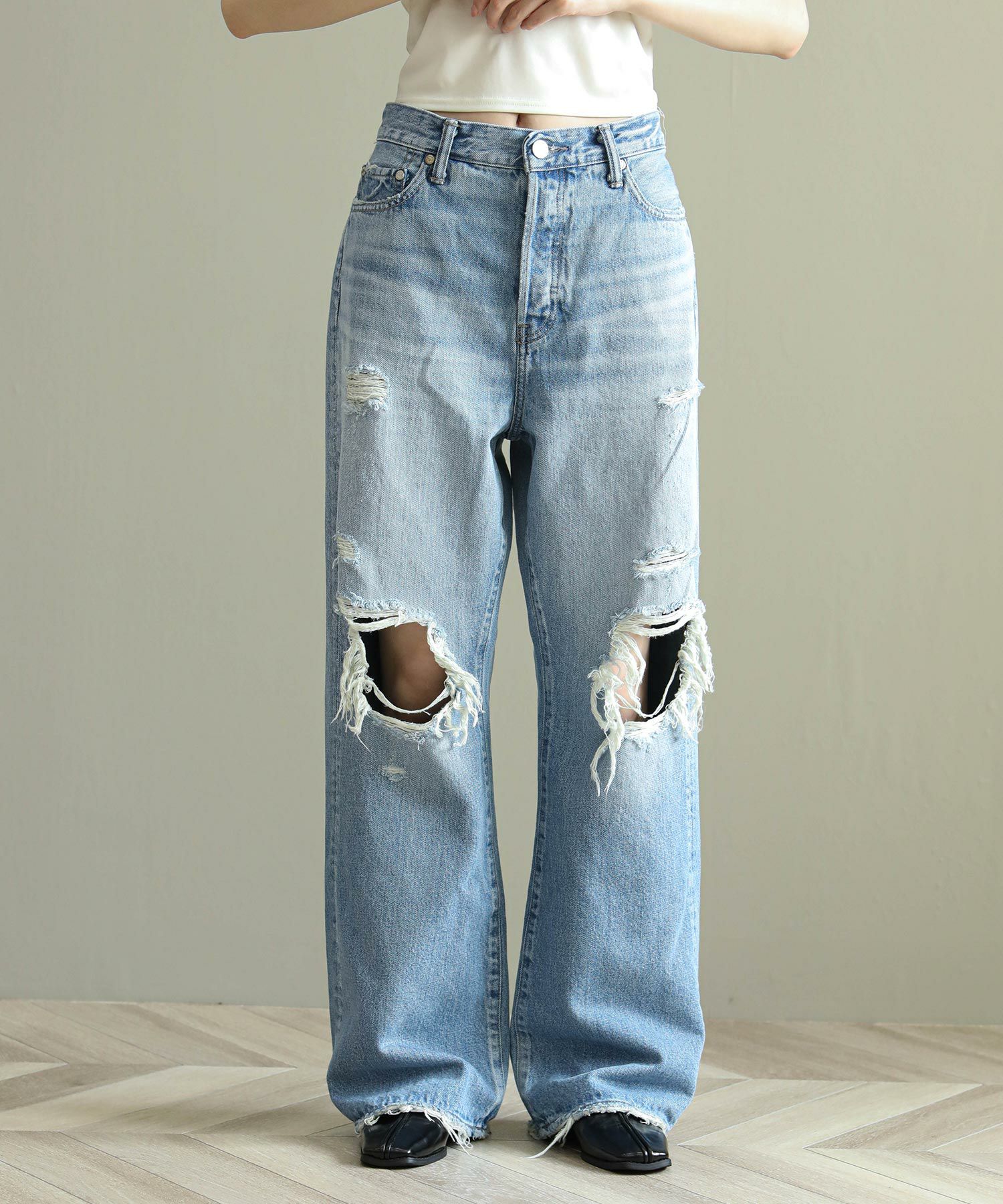 一般的なブーツカットと比べ膝の絞りが少なく、裾への広がりも緩やかな為、ストレートとワイドの中間のような着用感が特徴。ウエストは少し大きめの設計にしており、腰上で留まってヒップからワタリにゆとりをもたせることでリラックスな印象に。またウエスト位置で絞って履いてもキレイなラインが出るので着こなしに幅があるアイテムです。大胆なダメージ加工がトレンド感もあり、スタイルの巾が広がります。