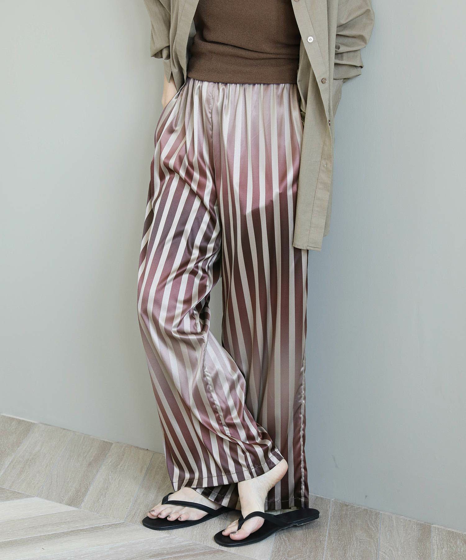 ストライプ柄がすっきりとした縦のラインを強調してくれます。柔らかくしなやかな素材感で脚のラインを自然に拾わないのも嬉しいポイント。上品な光沢感が際立ち女性らしい雰囲気を引き立ててくれます。着心地も良く、華やかなシーンにもデイリーにも使いやすい万能な生地感です。