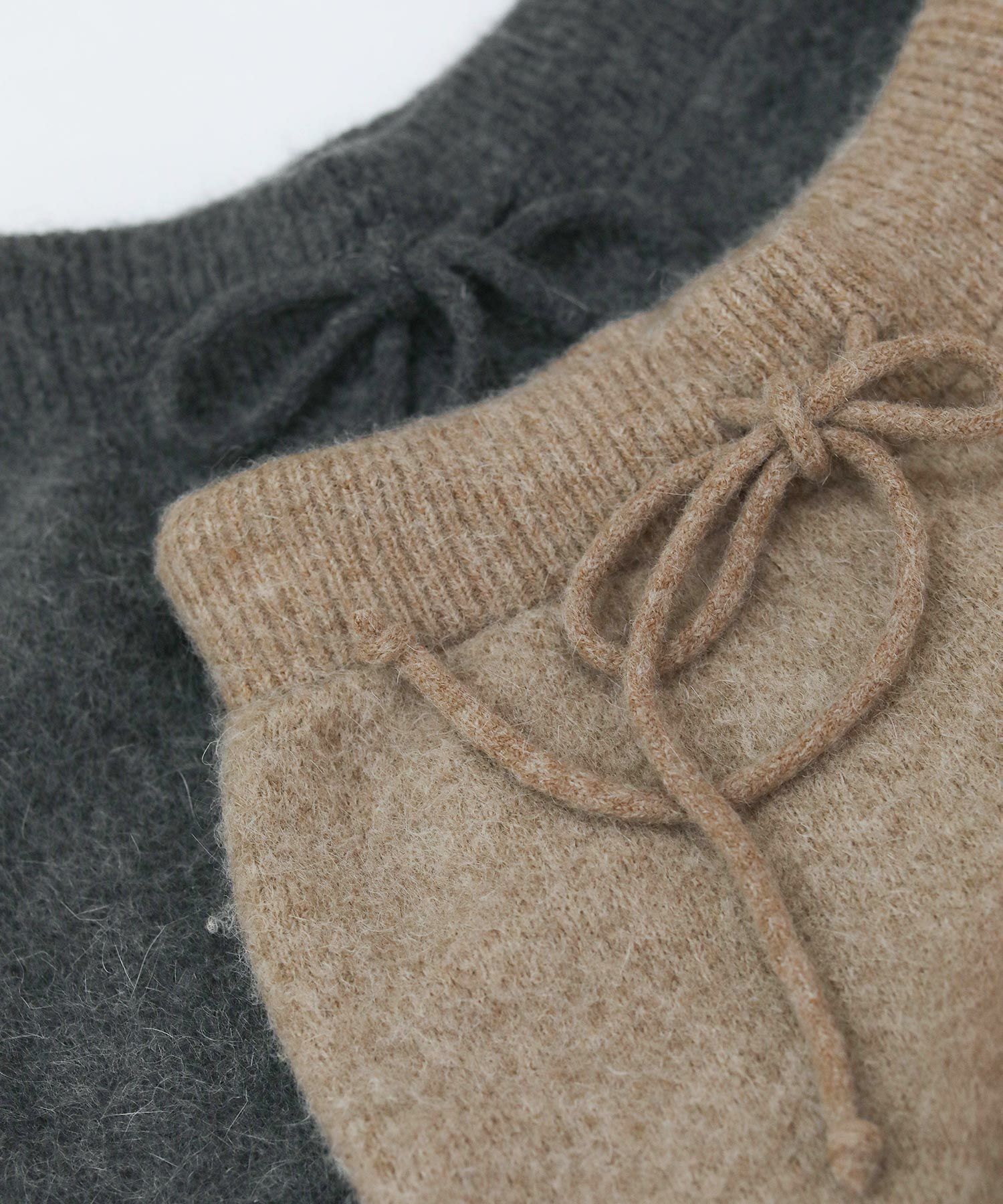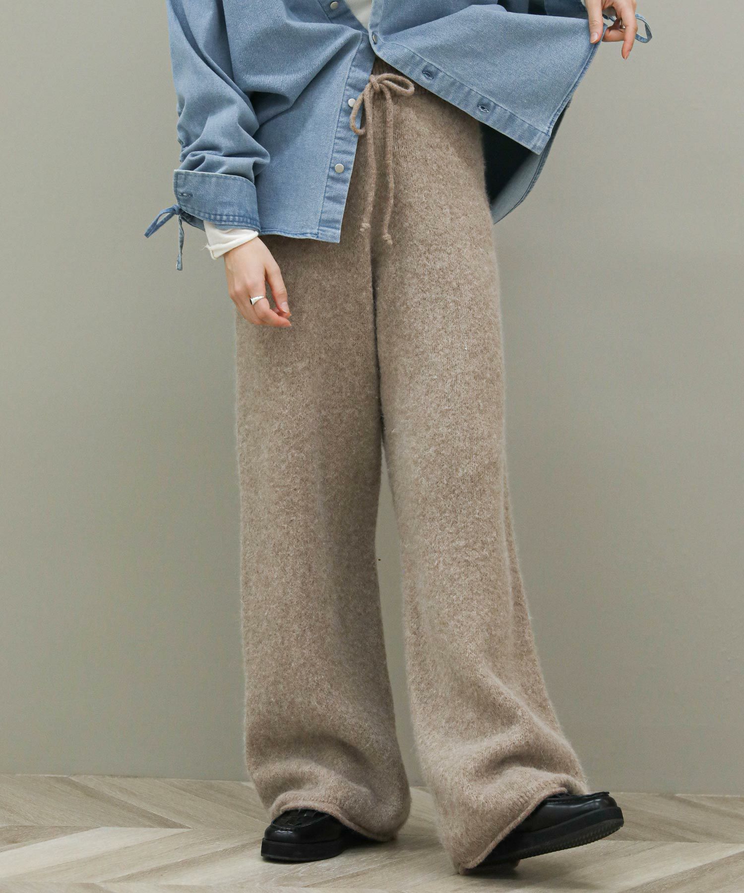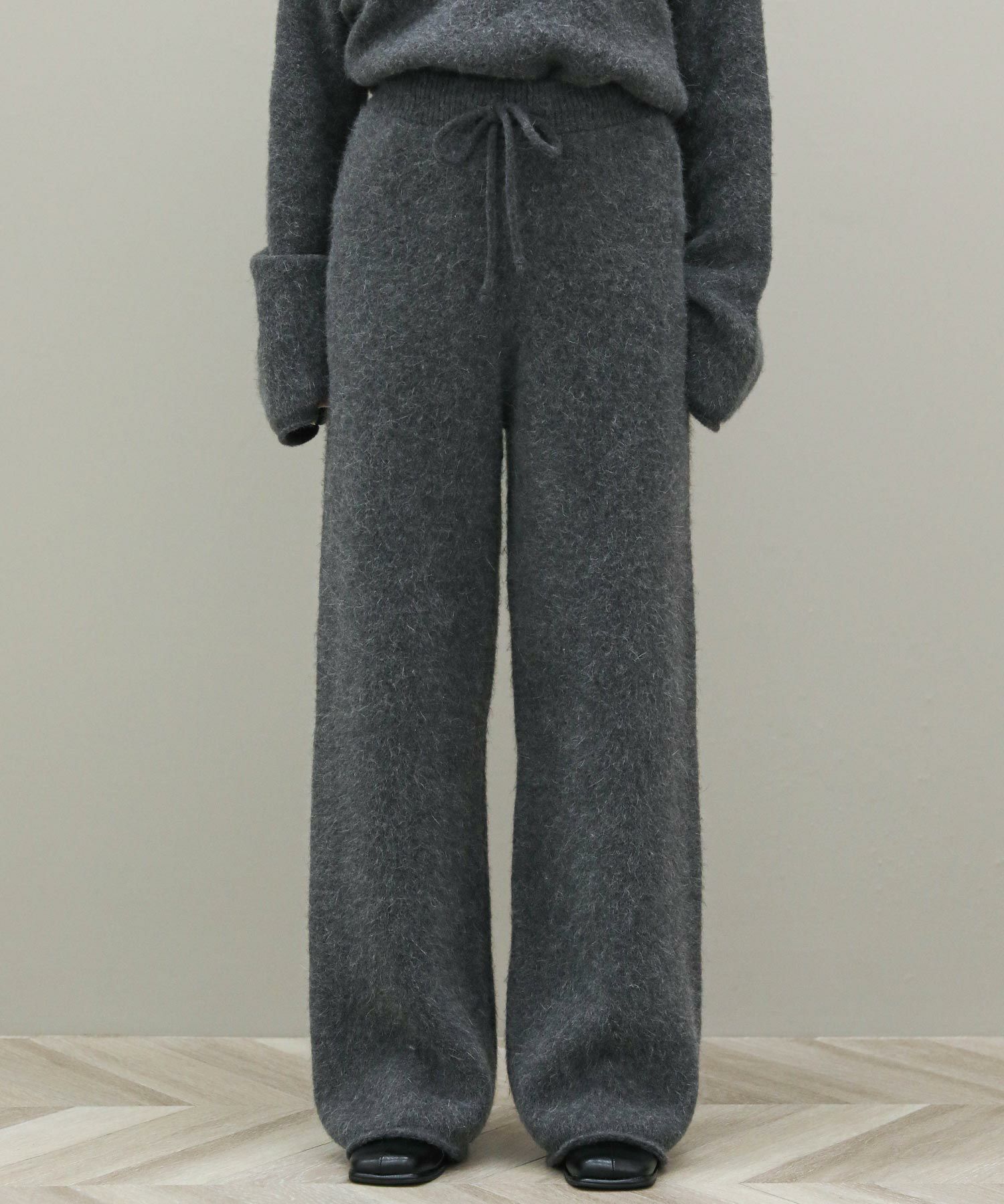 毛足の長いふんわりとしたニットのドロストパンツ。