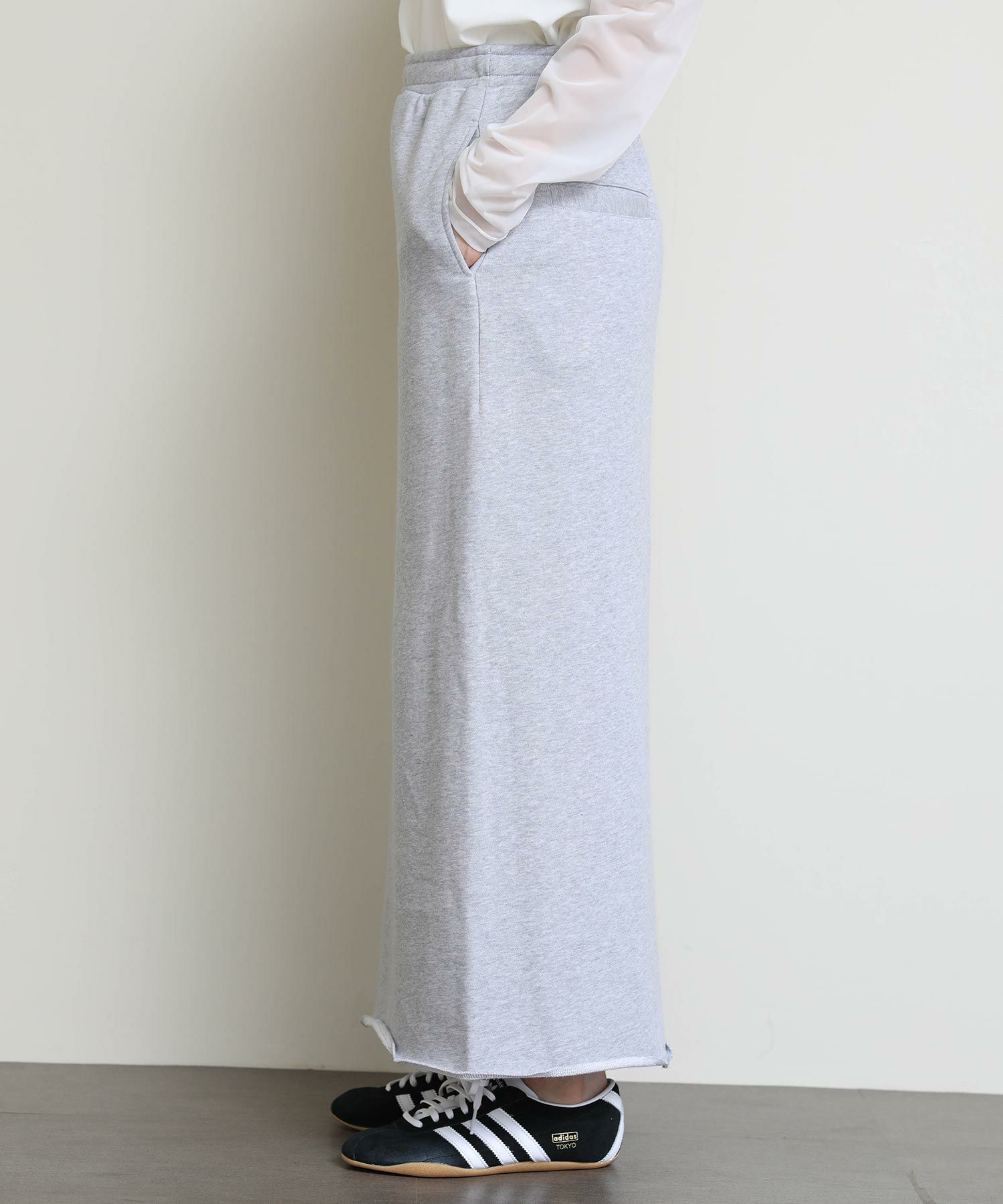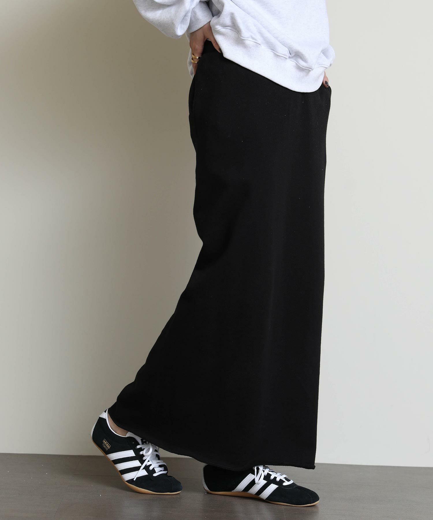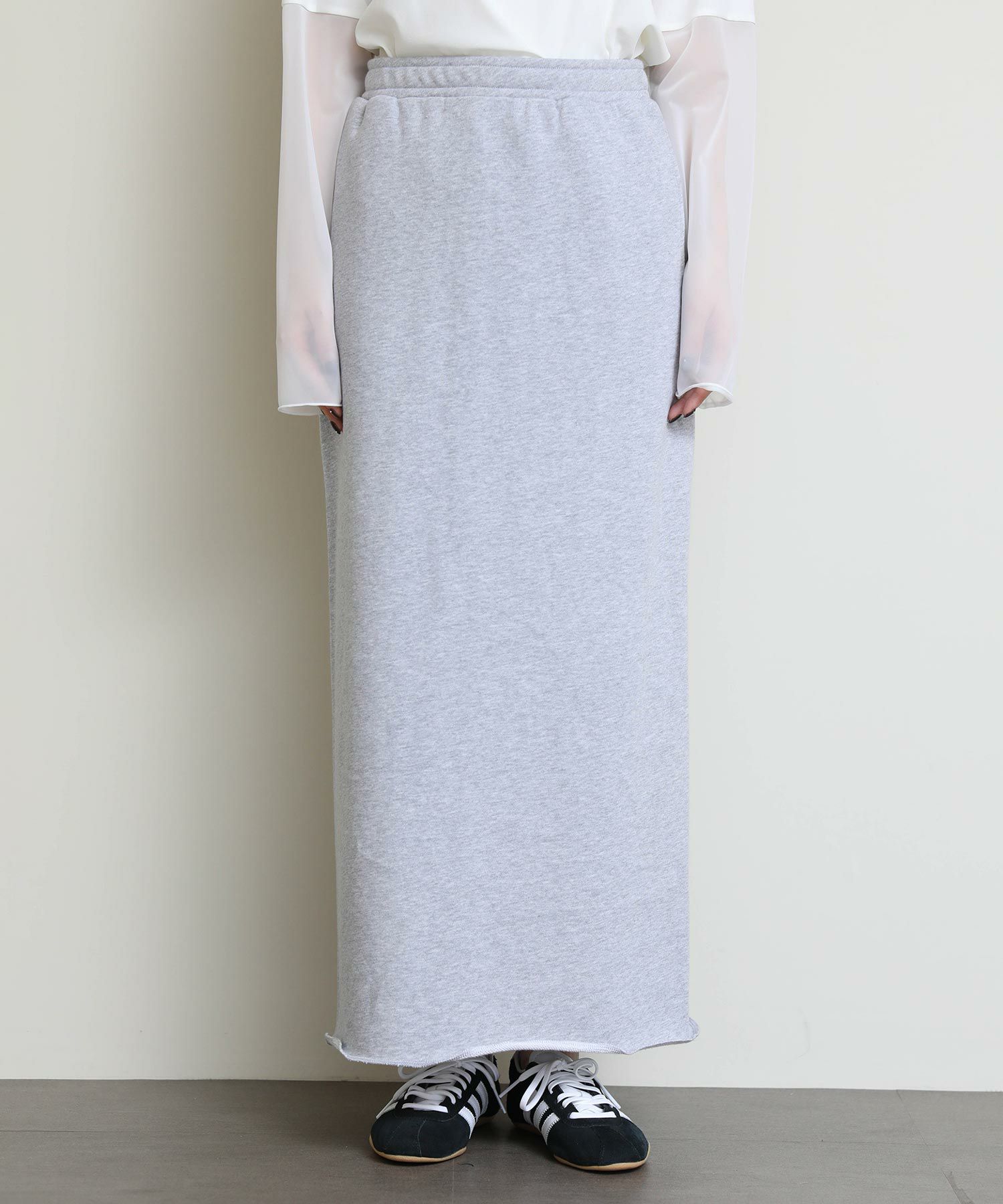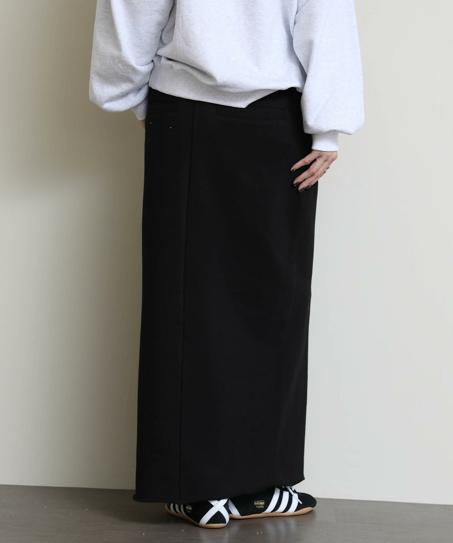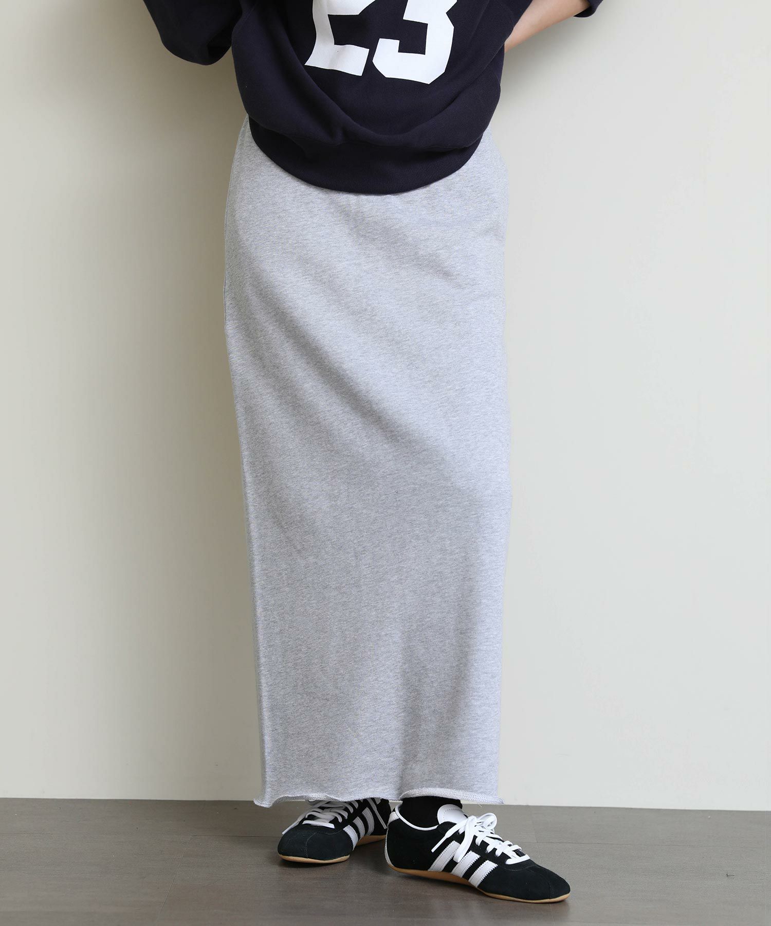 切りっぱなしのデザインがアクセントになるスウェットタイトスカート。
