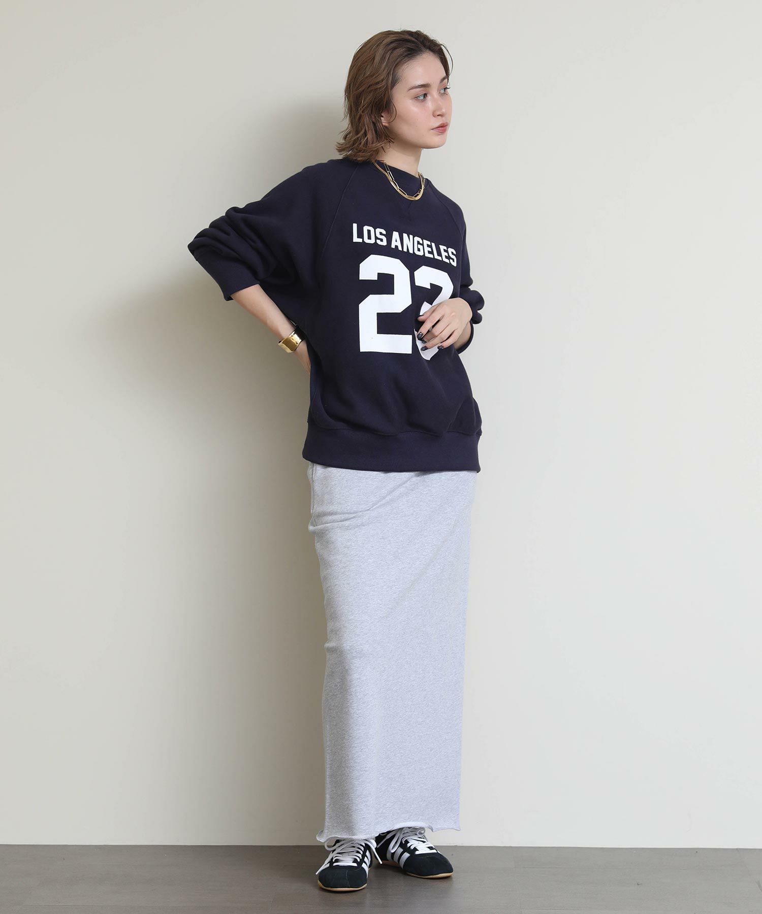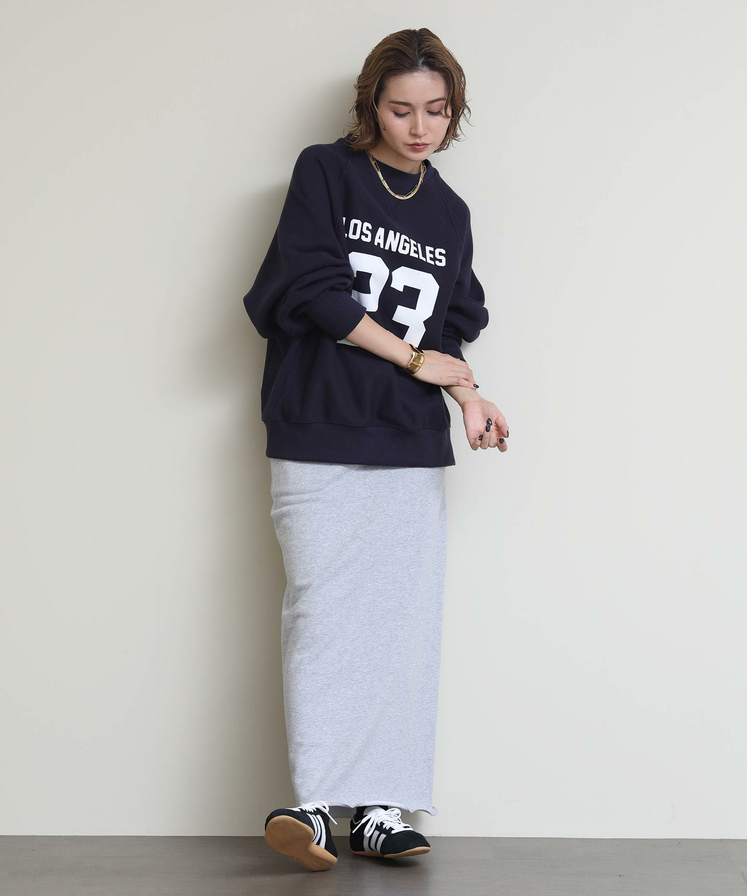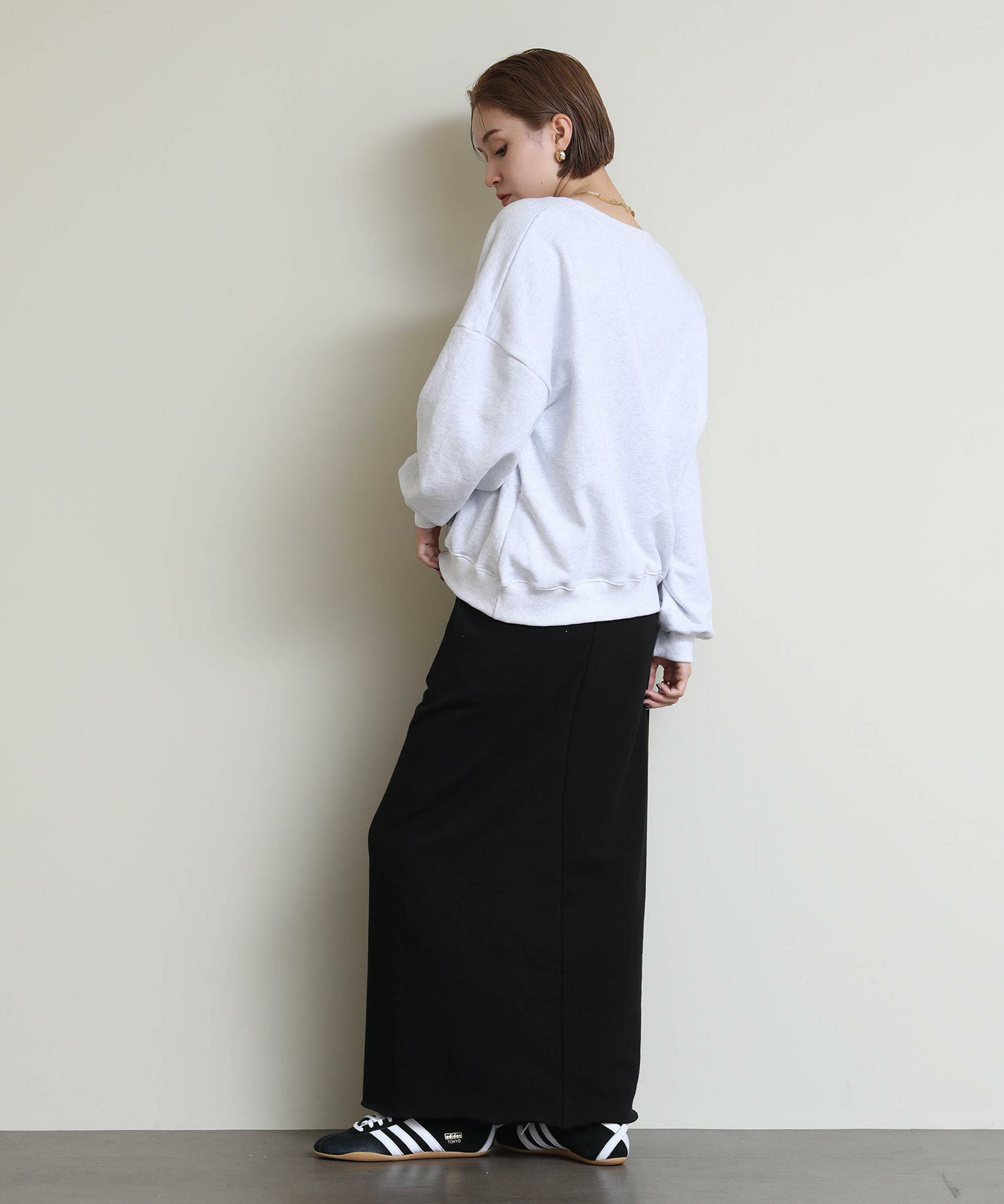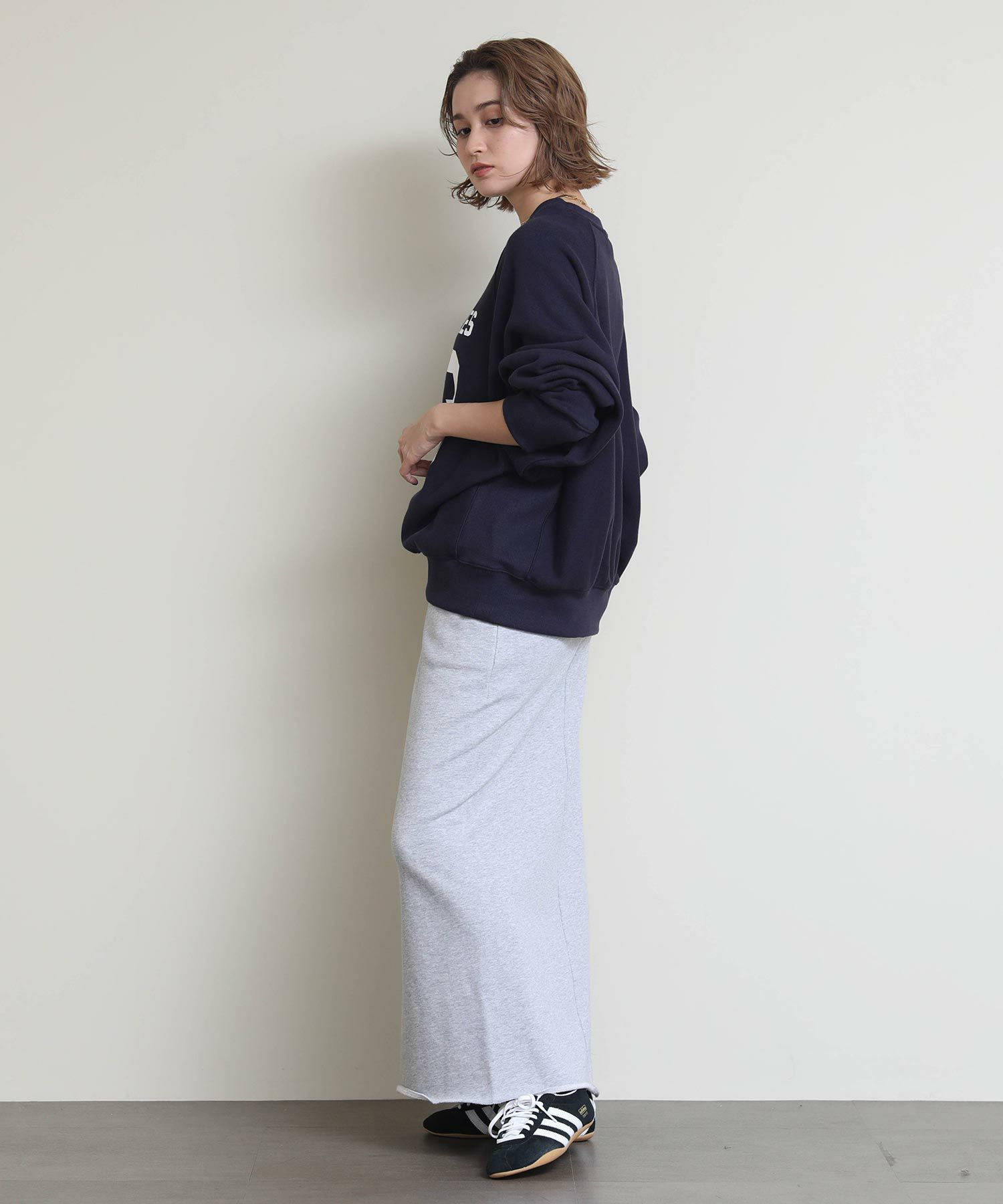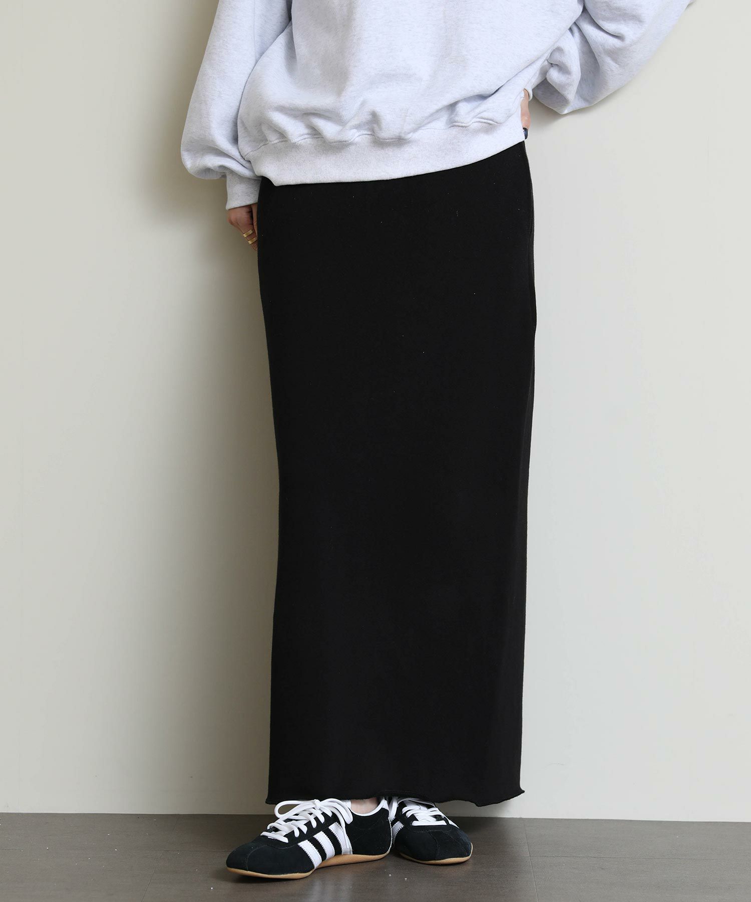 切りっぱなしのデザインがアクセントになるスウェットタイトスカート。
