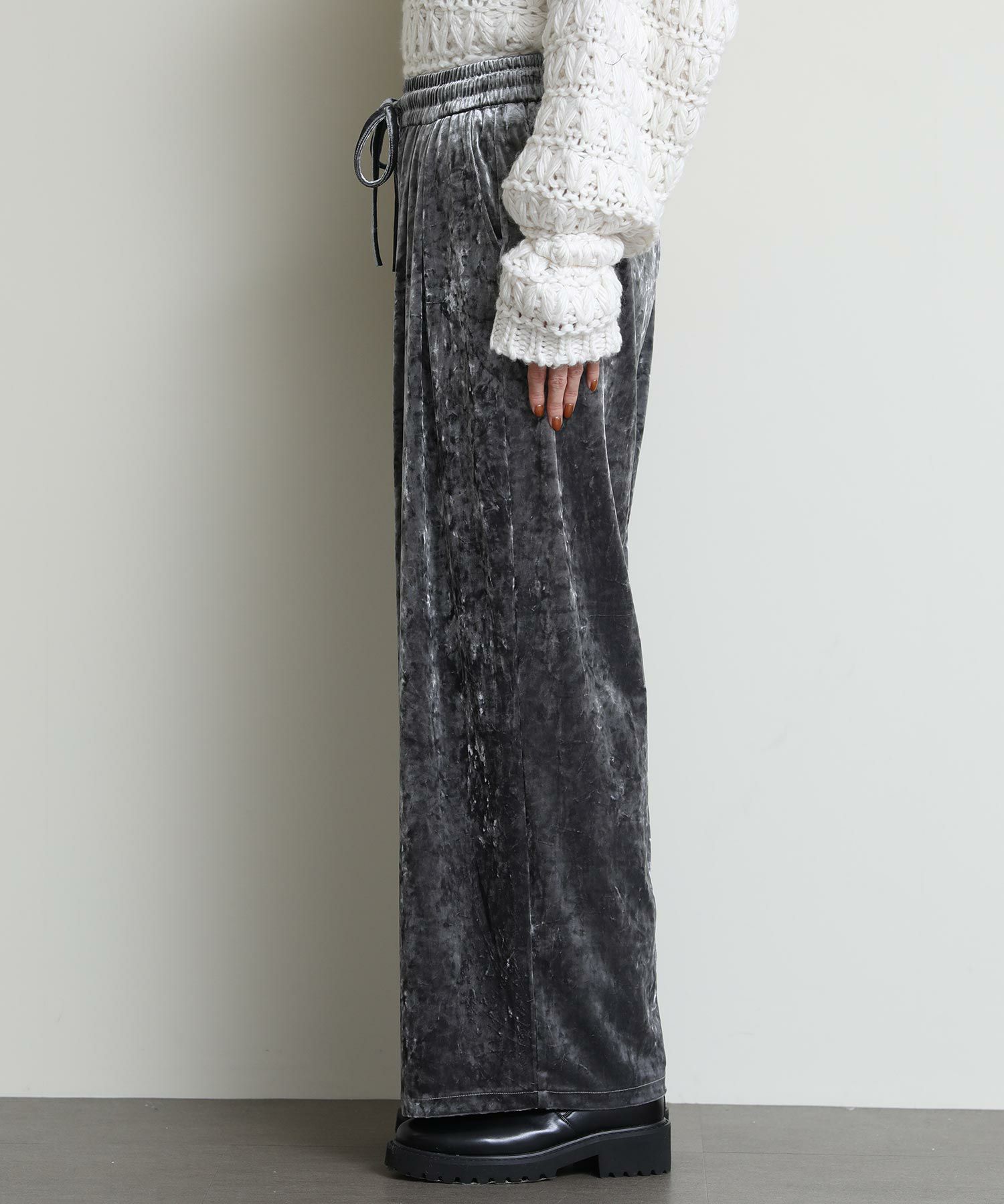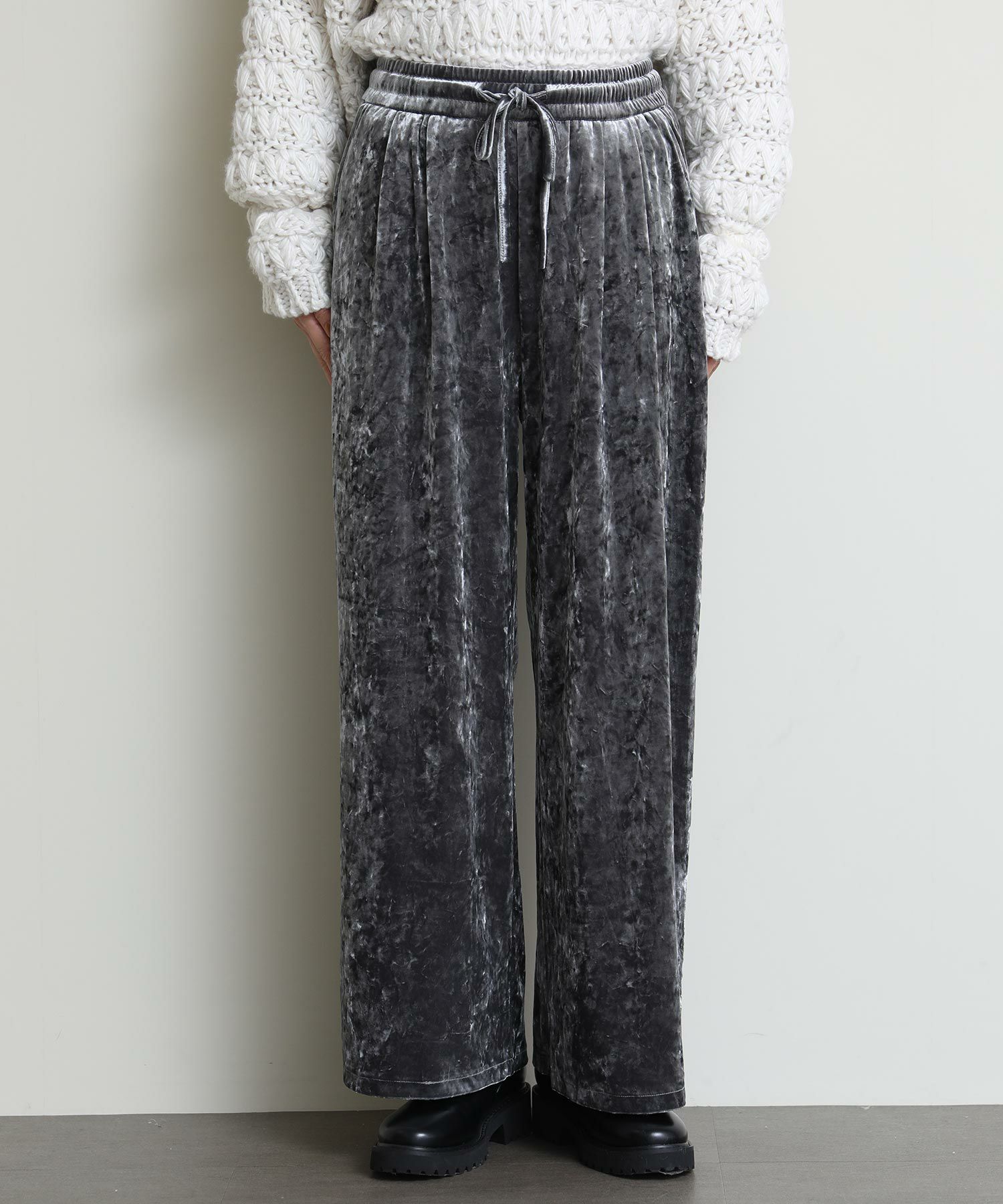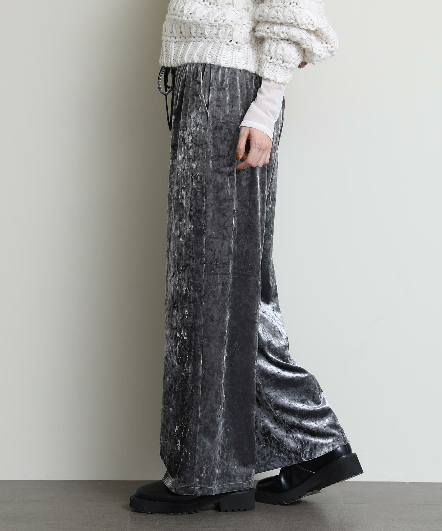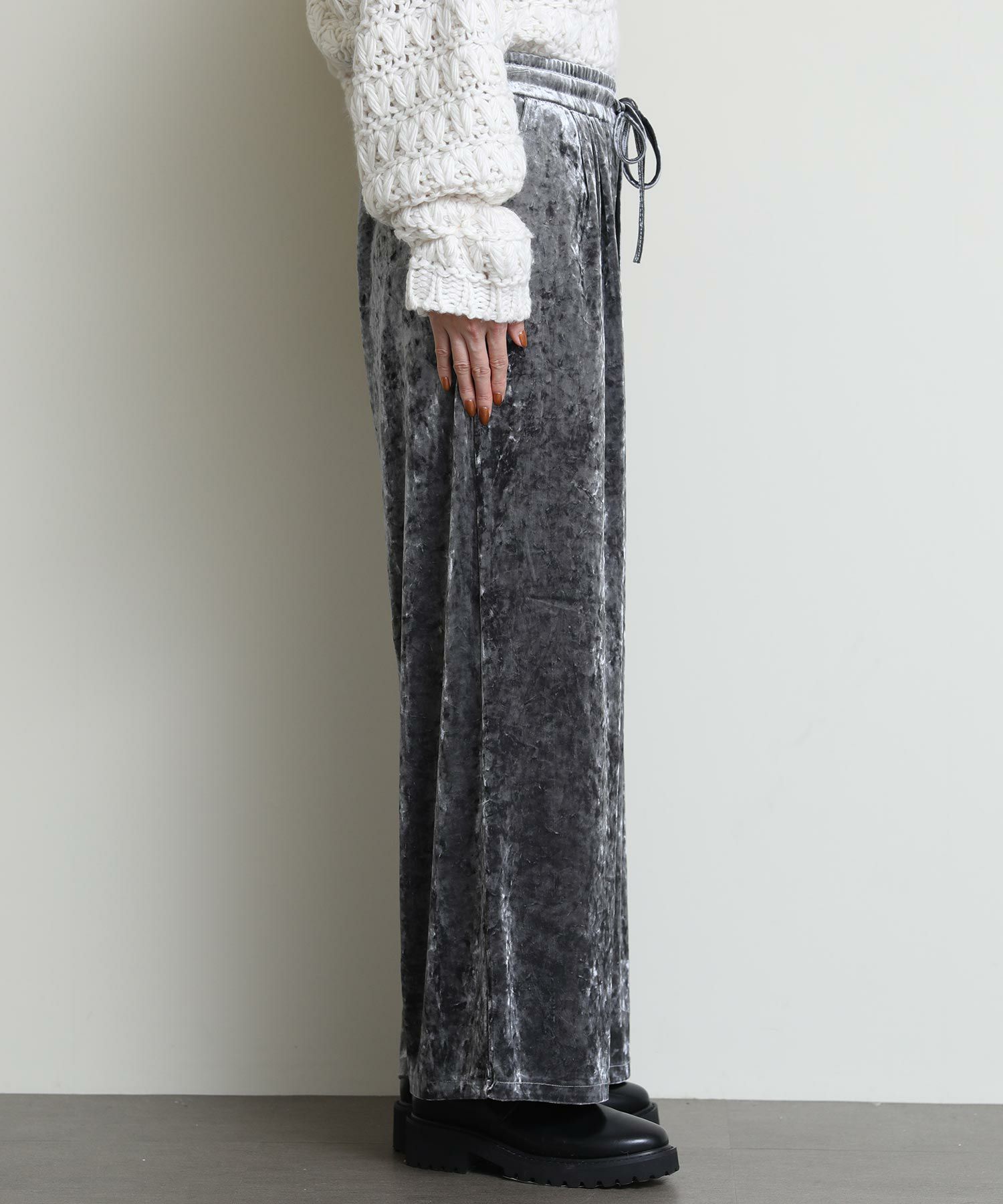 トレンド感たっぷりなクラッシュベロア生地のイージーパンツ。