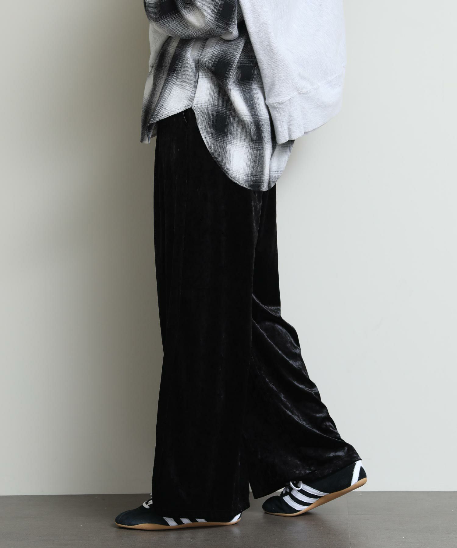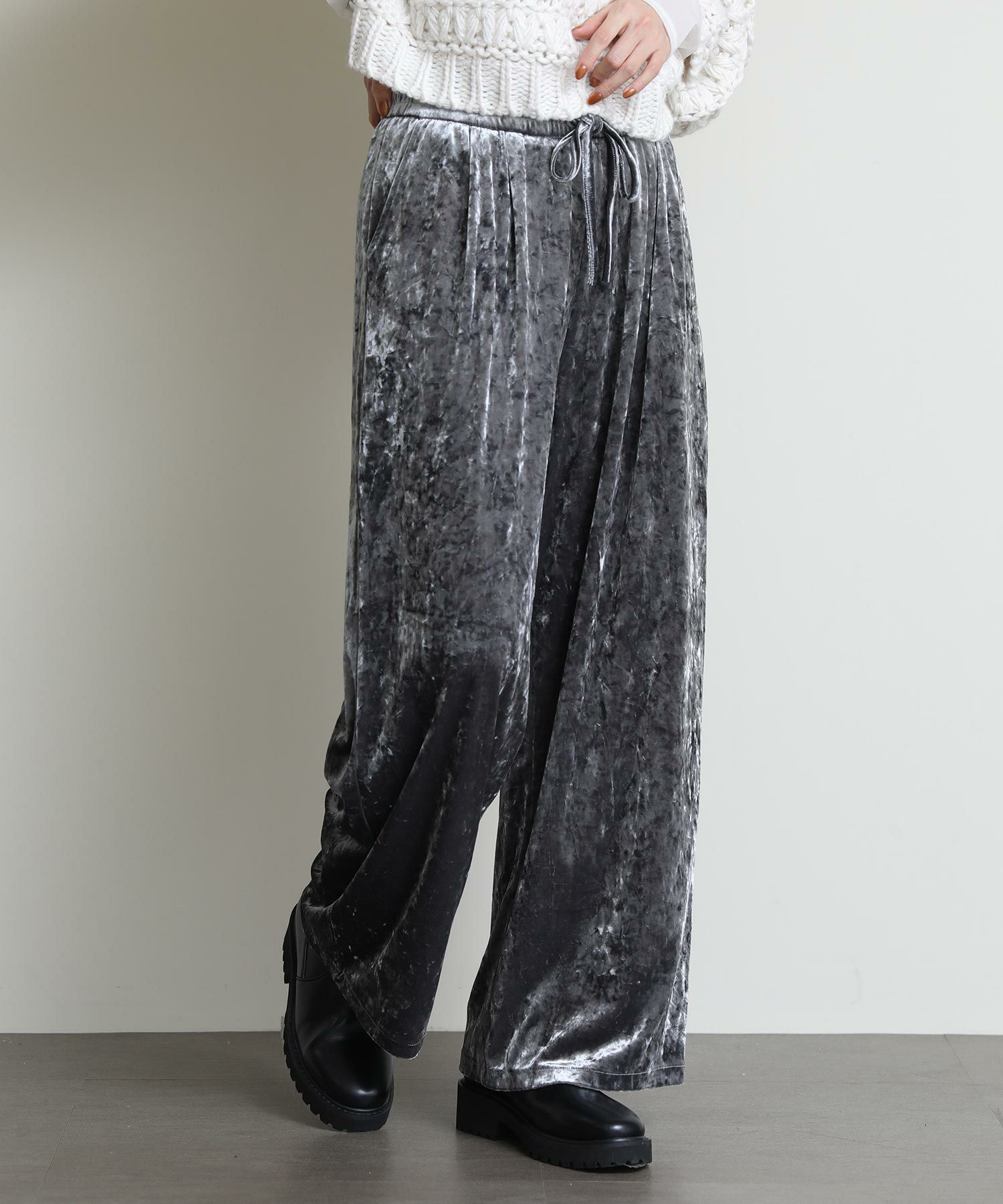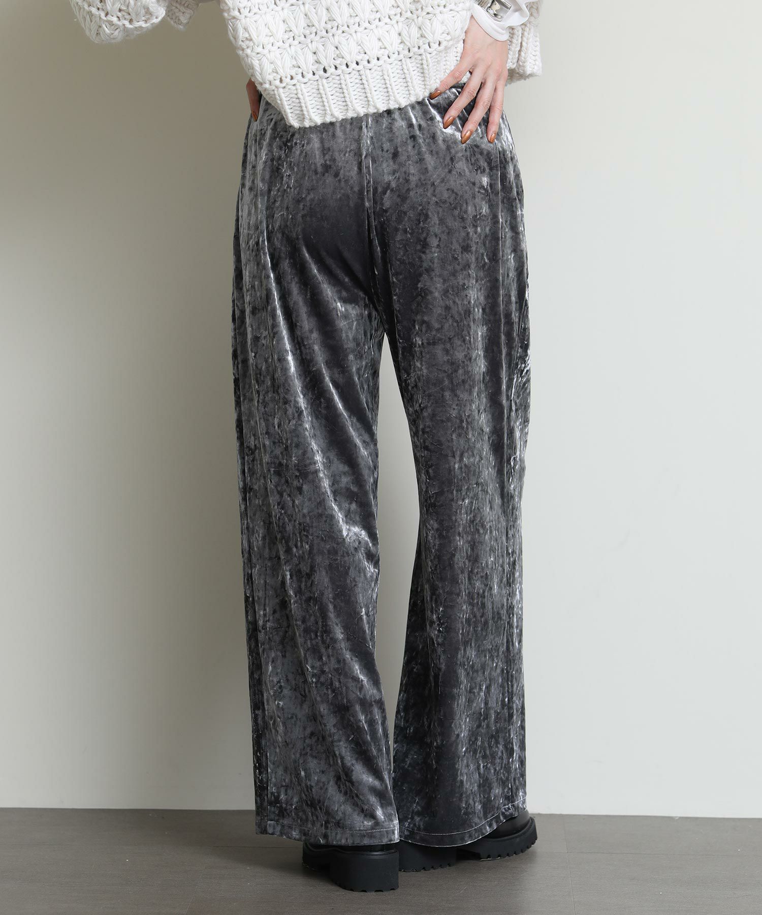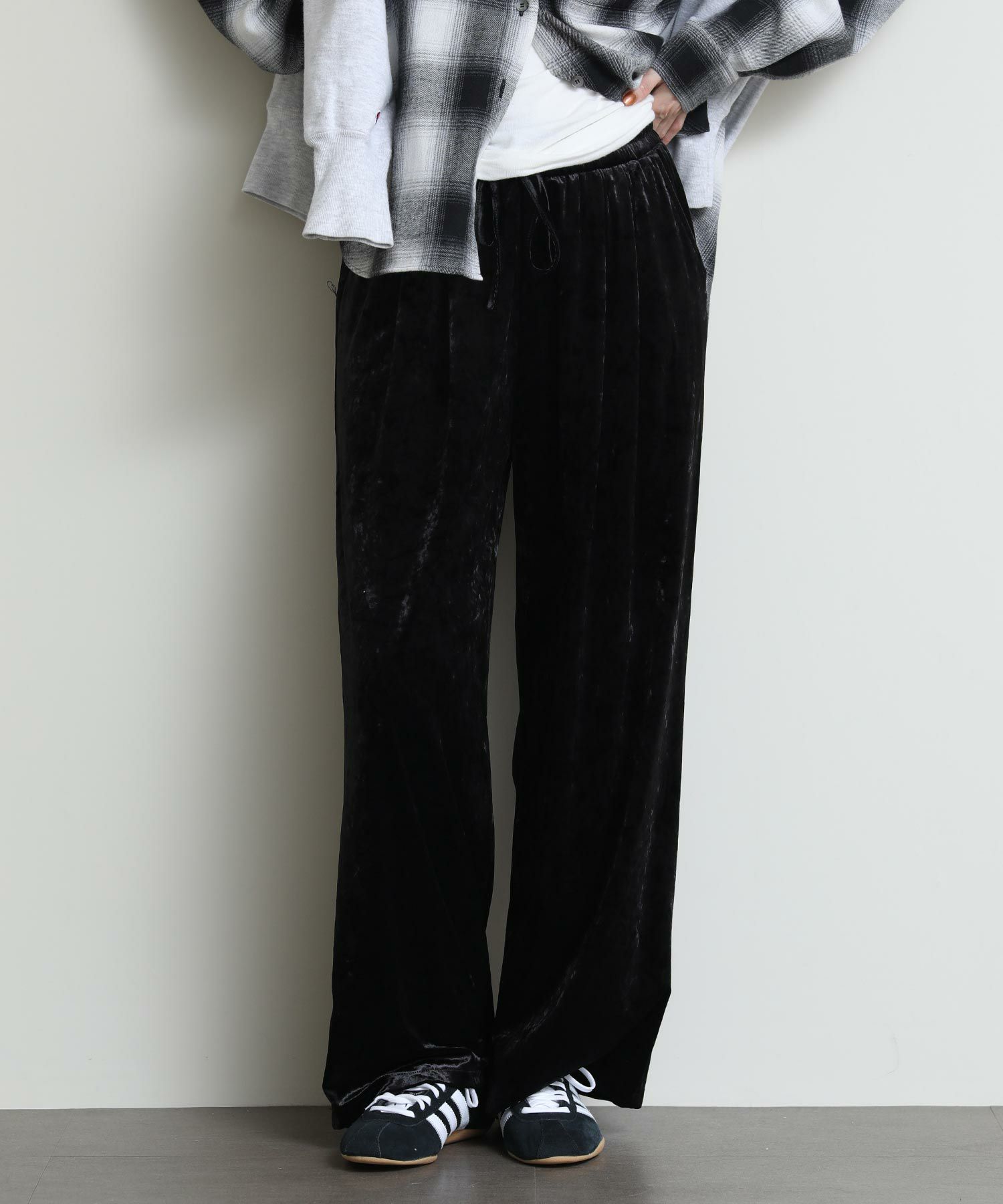 トレンド感たっぷりなクラッシュベロア生地のイージーパンツ。