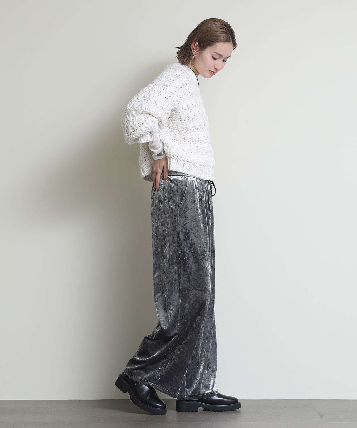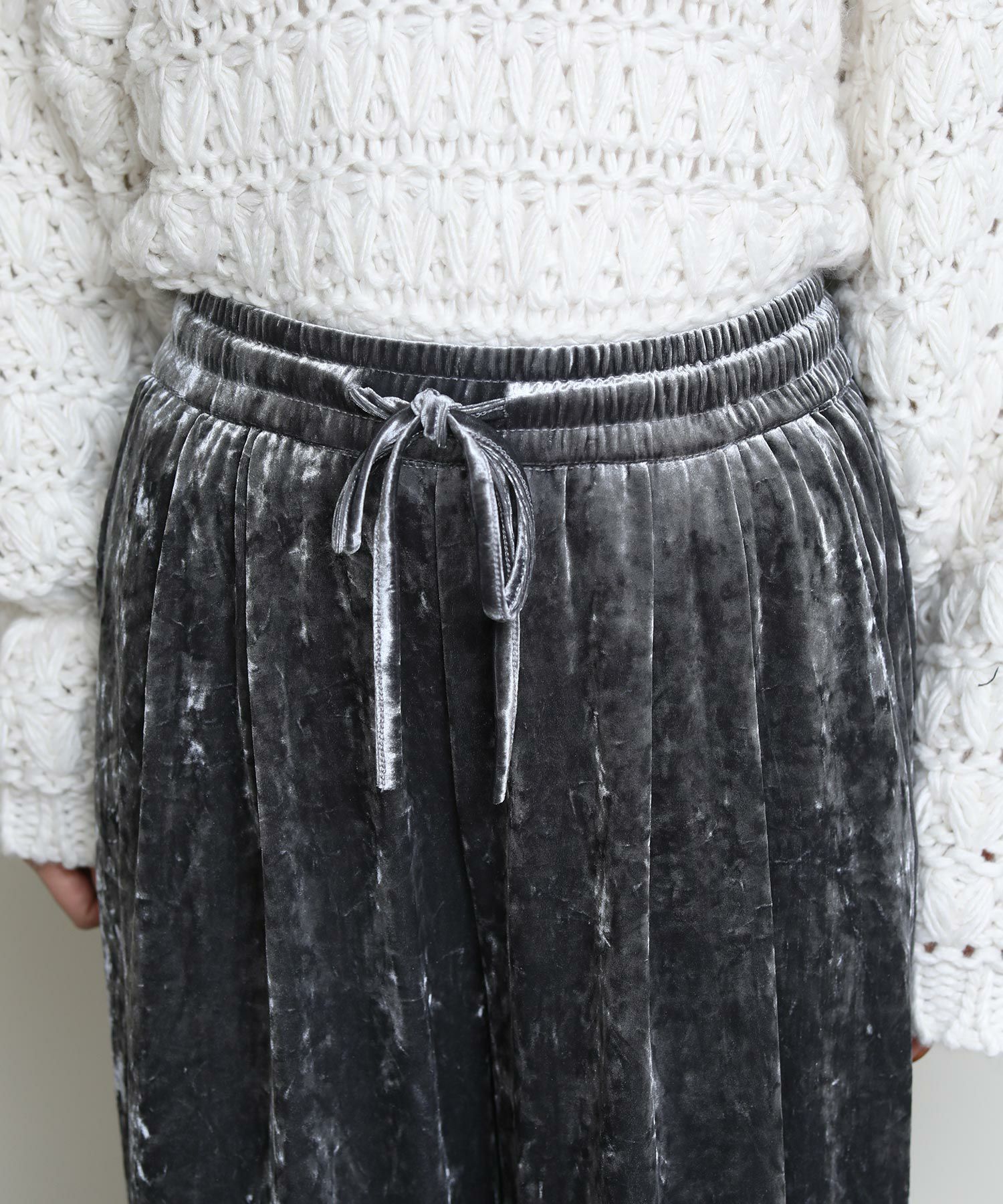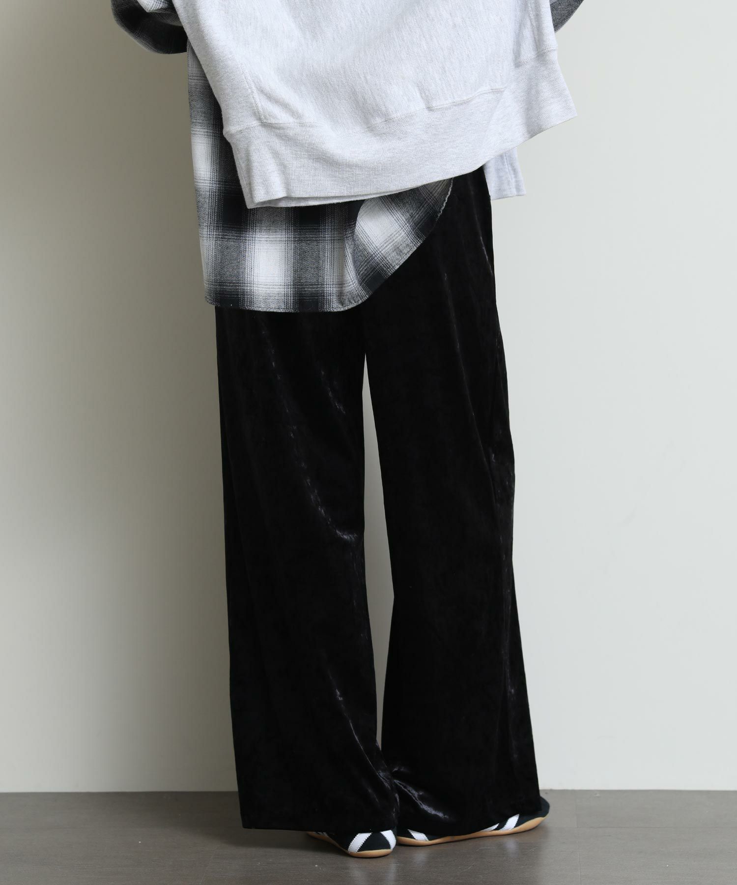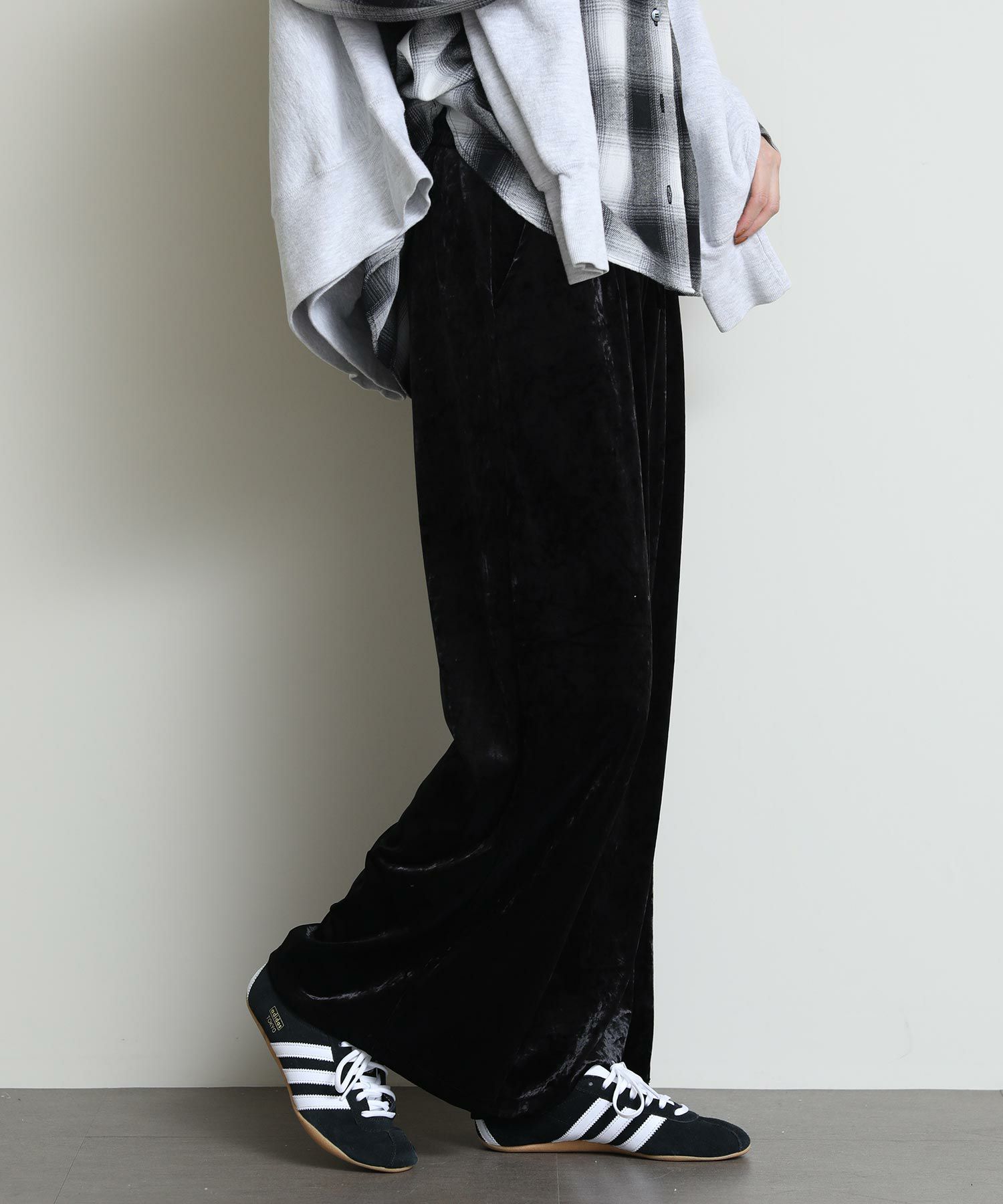 トレンド感たっぷりなクラッシュベロア生地のイージーパンツ。