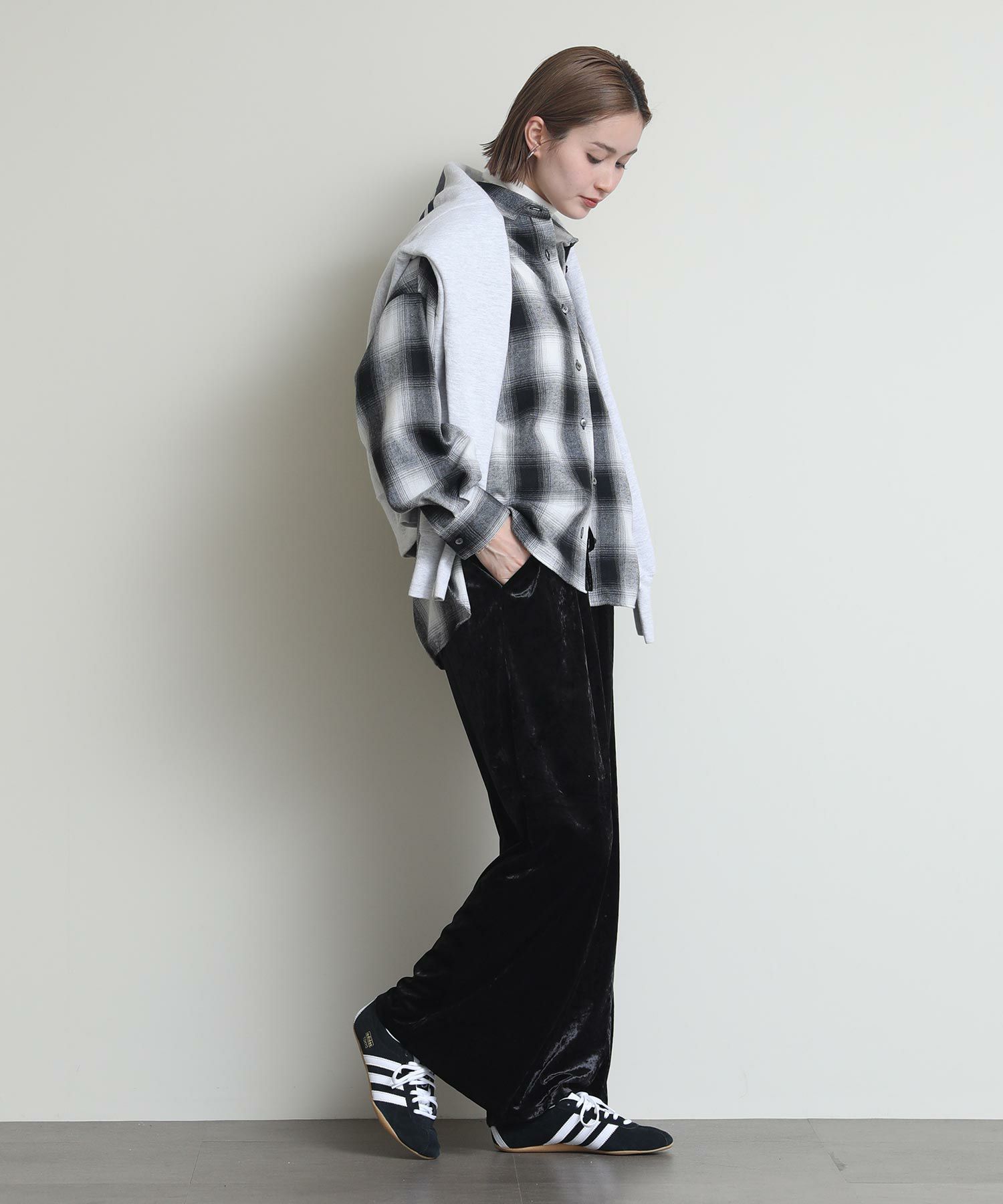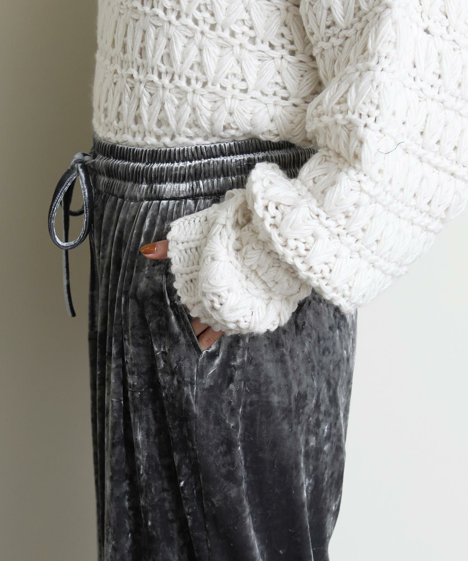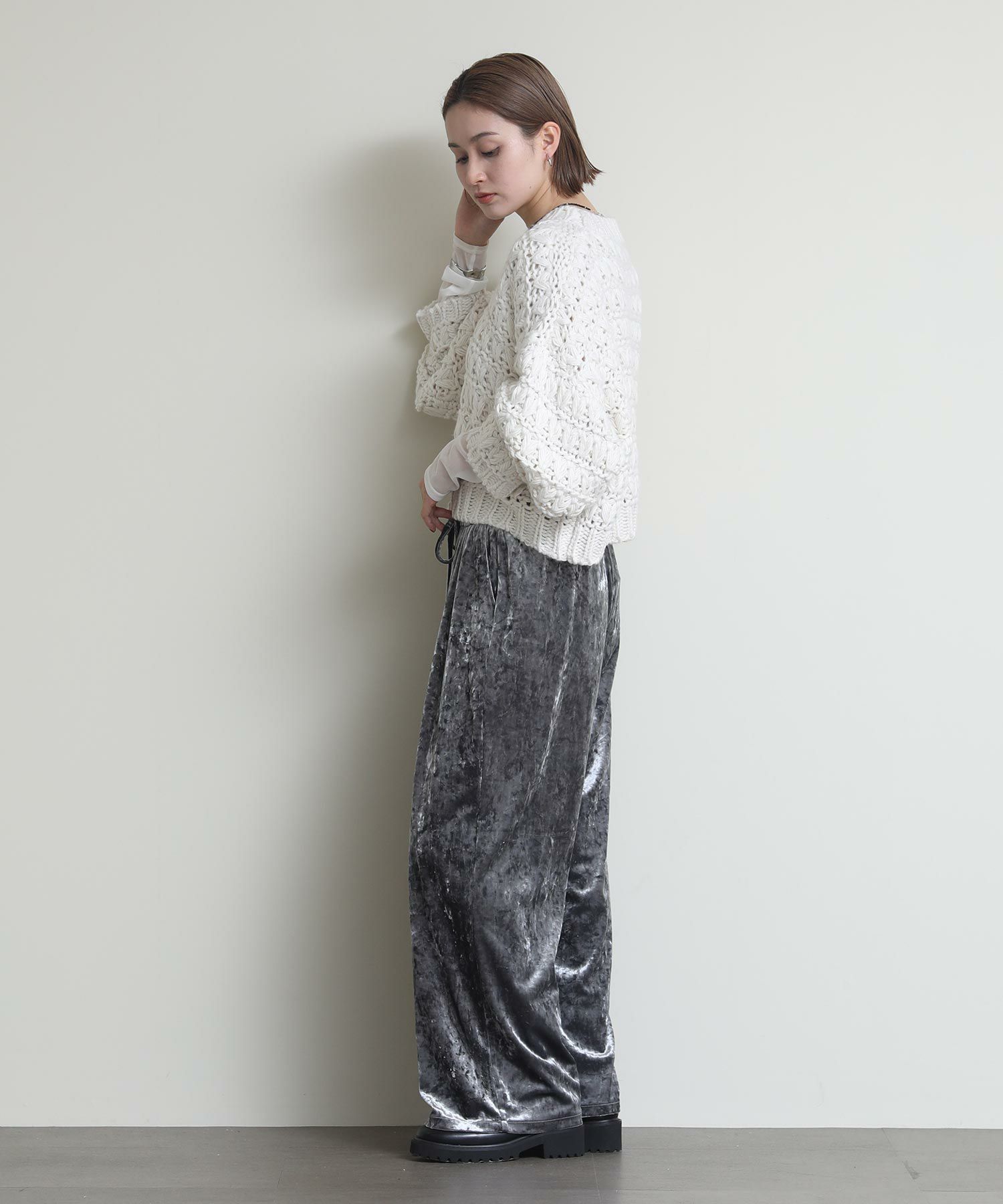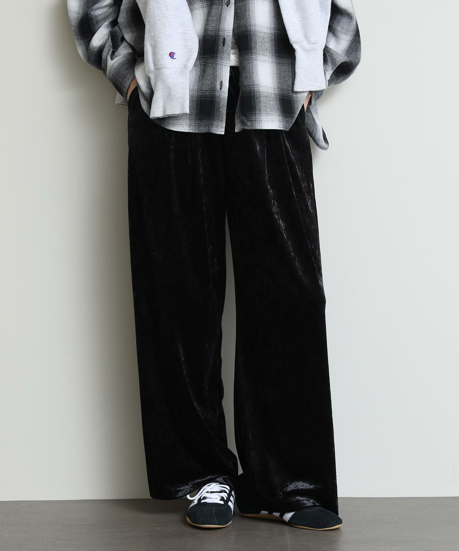 トレンド感たっぷりなクラッシュベロア生地のイージーパンツ。
