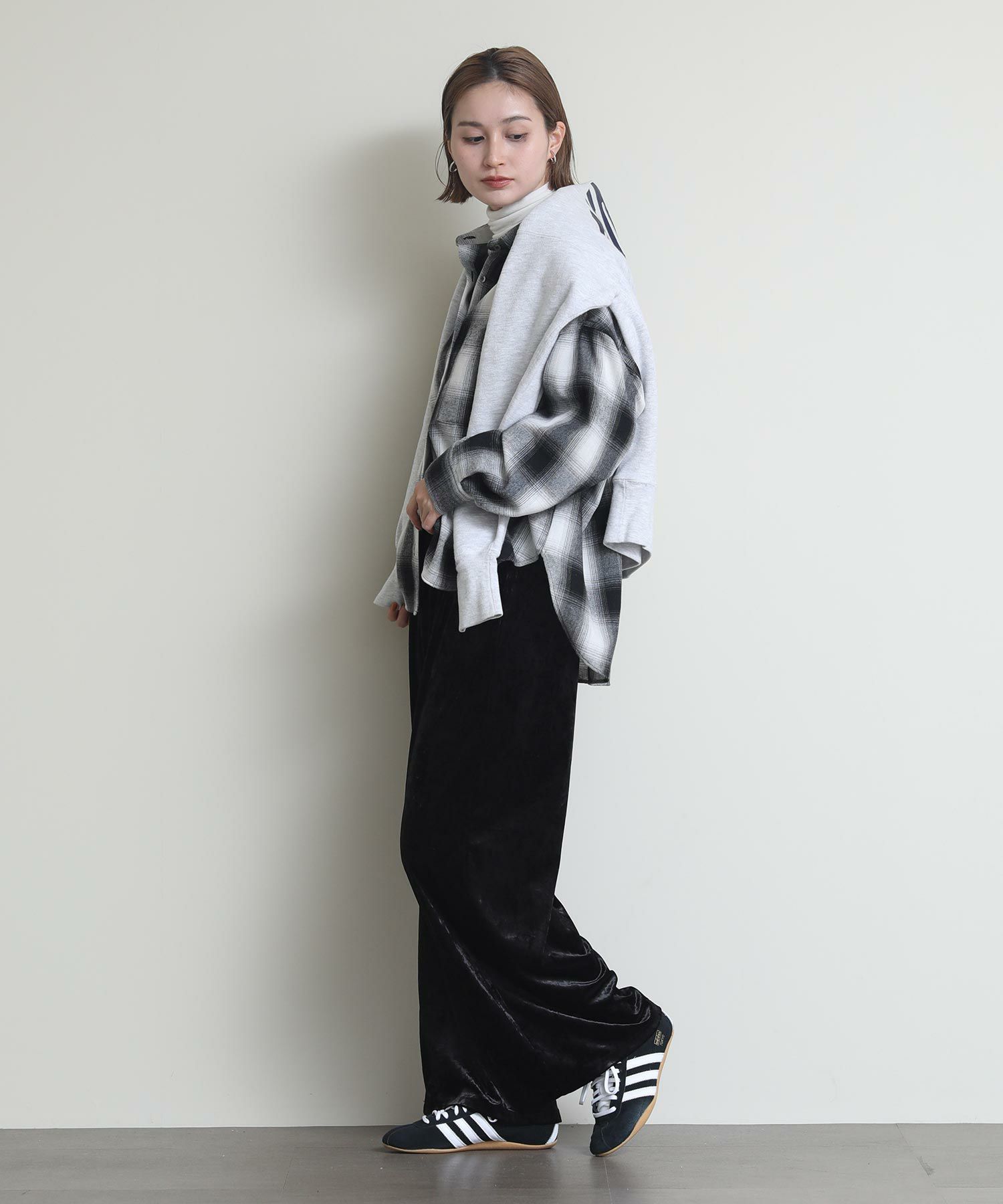 派手すぎない程度に存在感があり、ラフながらもカッコいい雰囲気です。ウエストゴムで伸縮性がありゆったりしているため、リラックスした履き心地◎表面に凹凸があることで普通のベロア生地よりも肉感を拾いづらく、はりつきも無いため体型カバー効果も!幅広いコーデと相性が良く、履くだけでこなれ感を演出します。