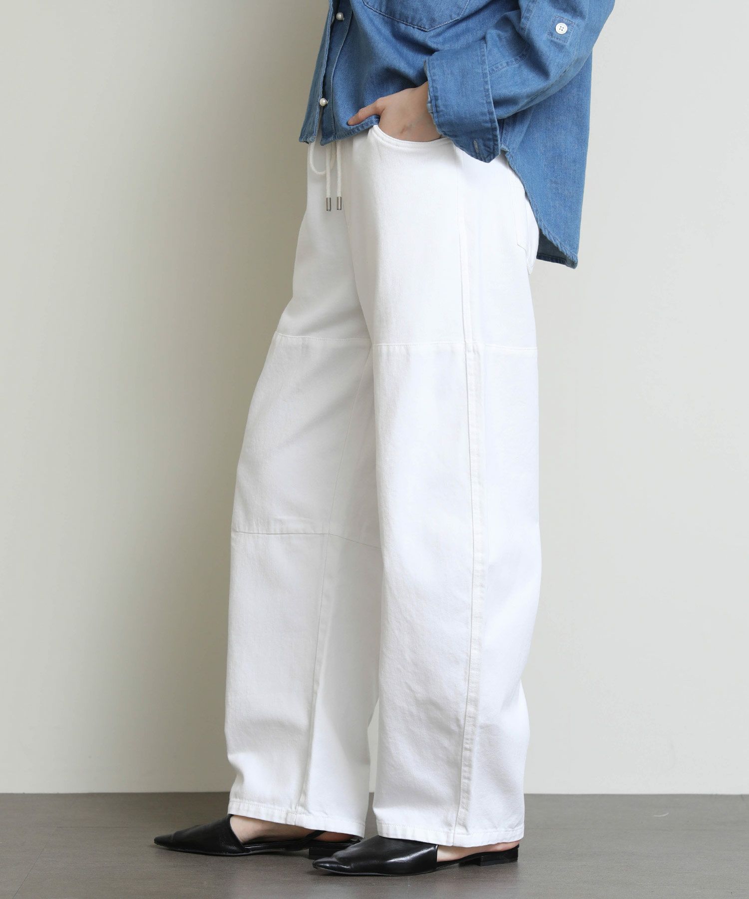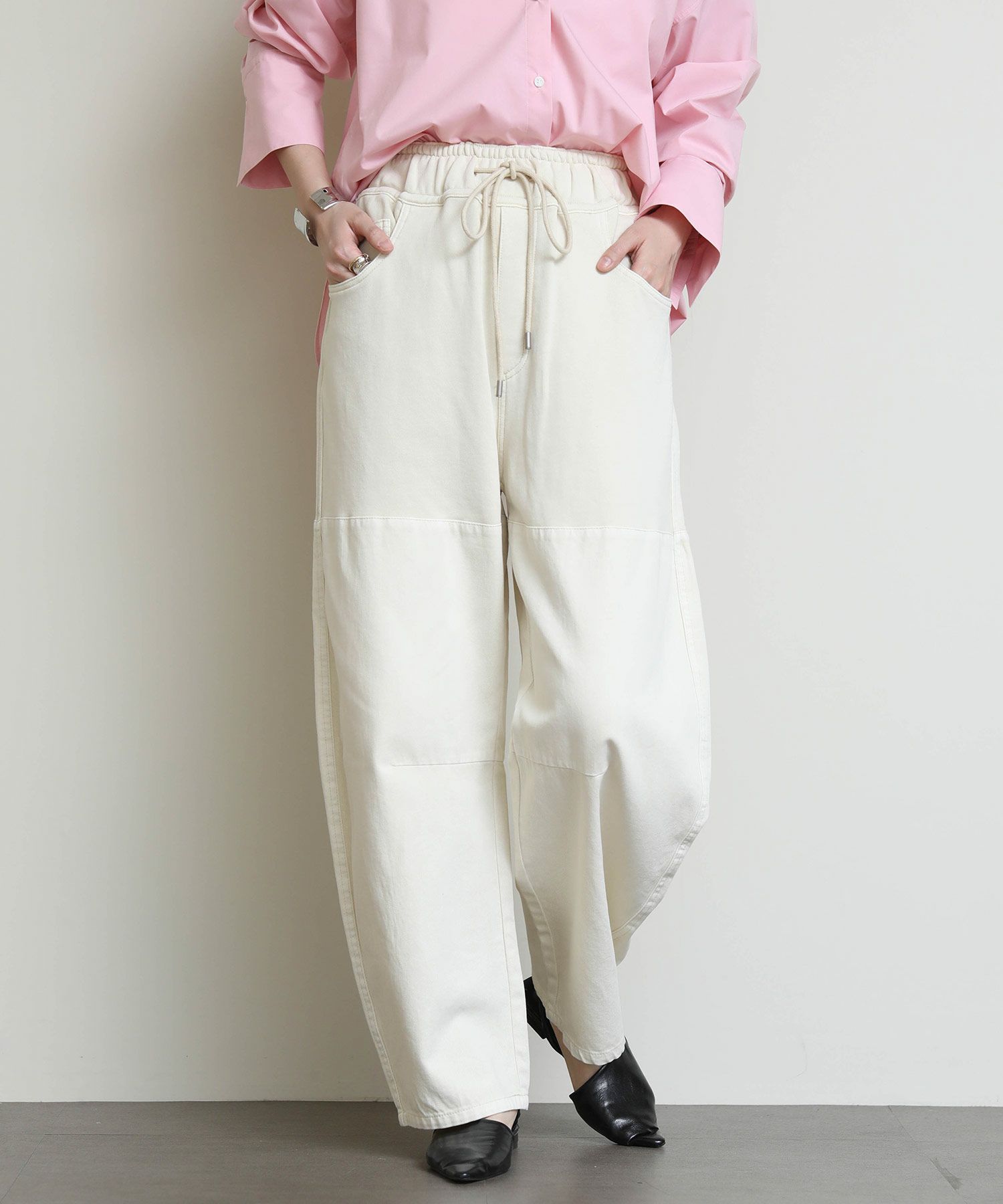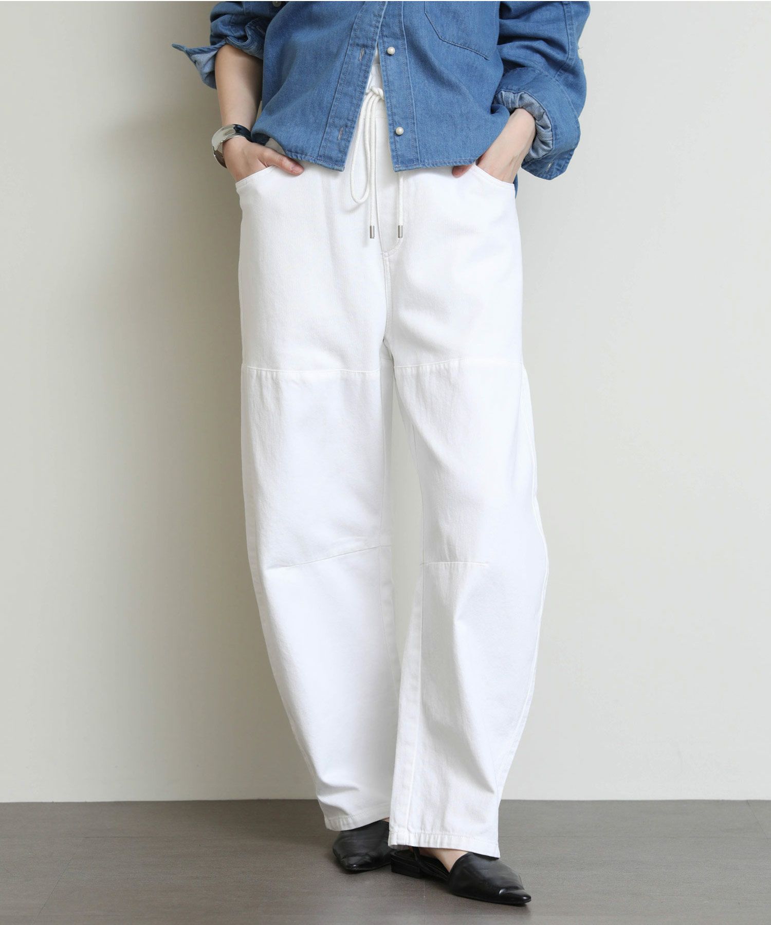 カーブ掛かった丸みのあるシルエットで脚長効果も◎ウエスト周りはゴム仕様でストレスなく着ることができ、紐で調節可能なため、ラフに着こなしていただけます。
