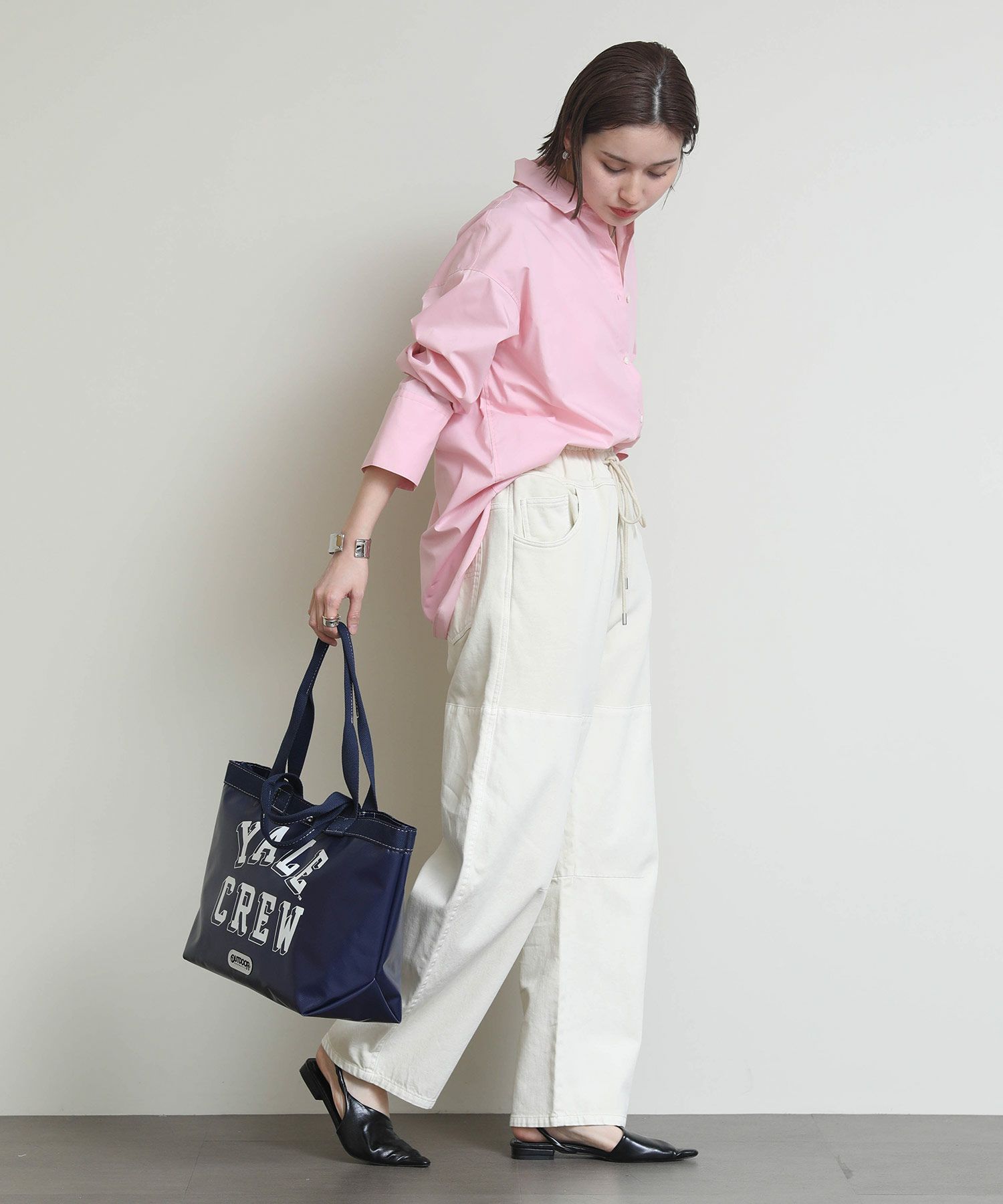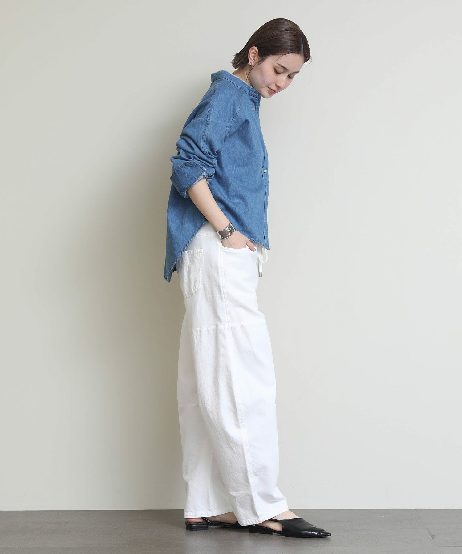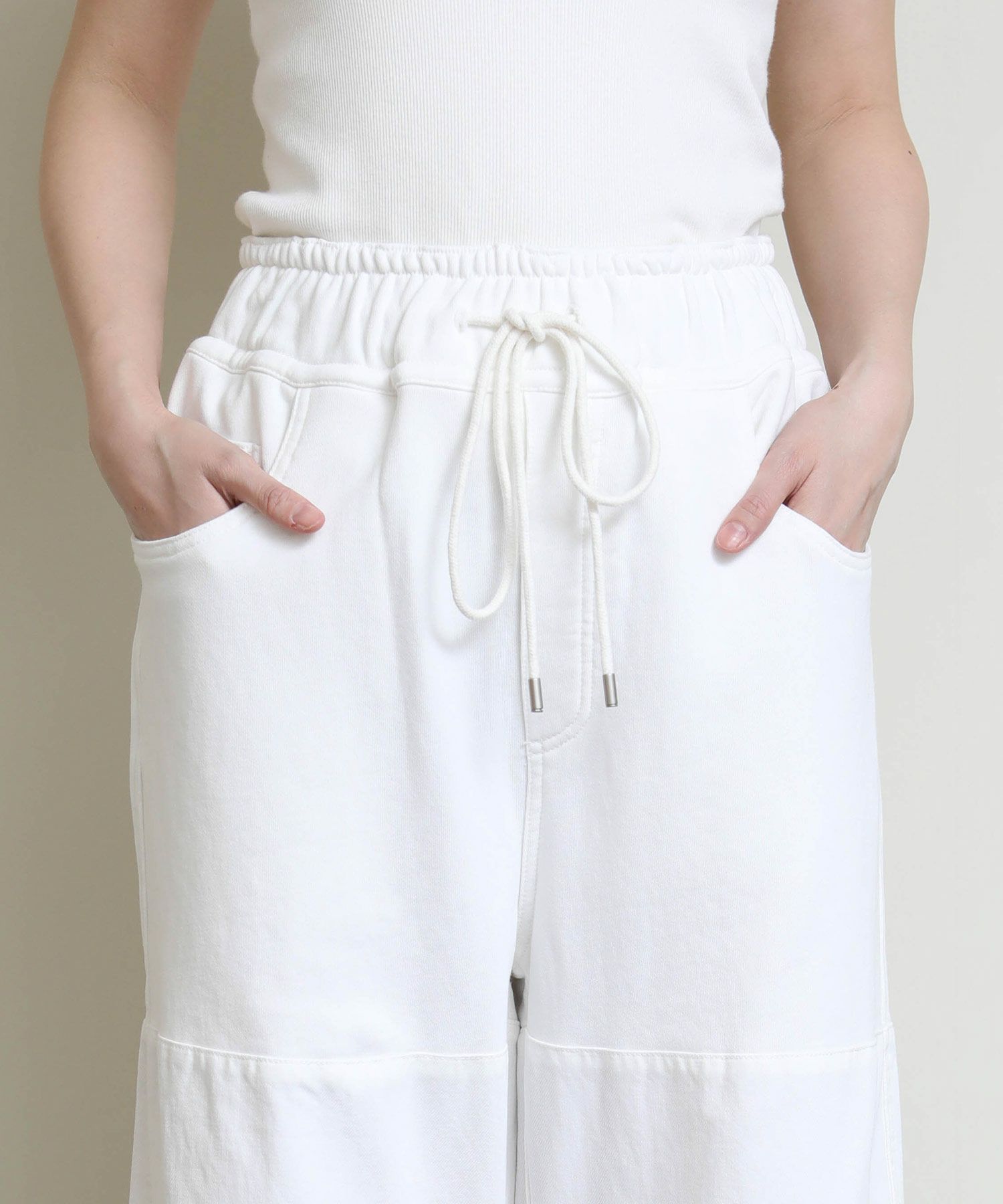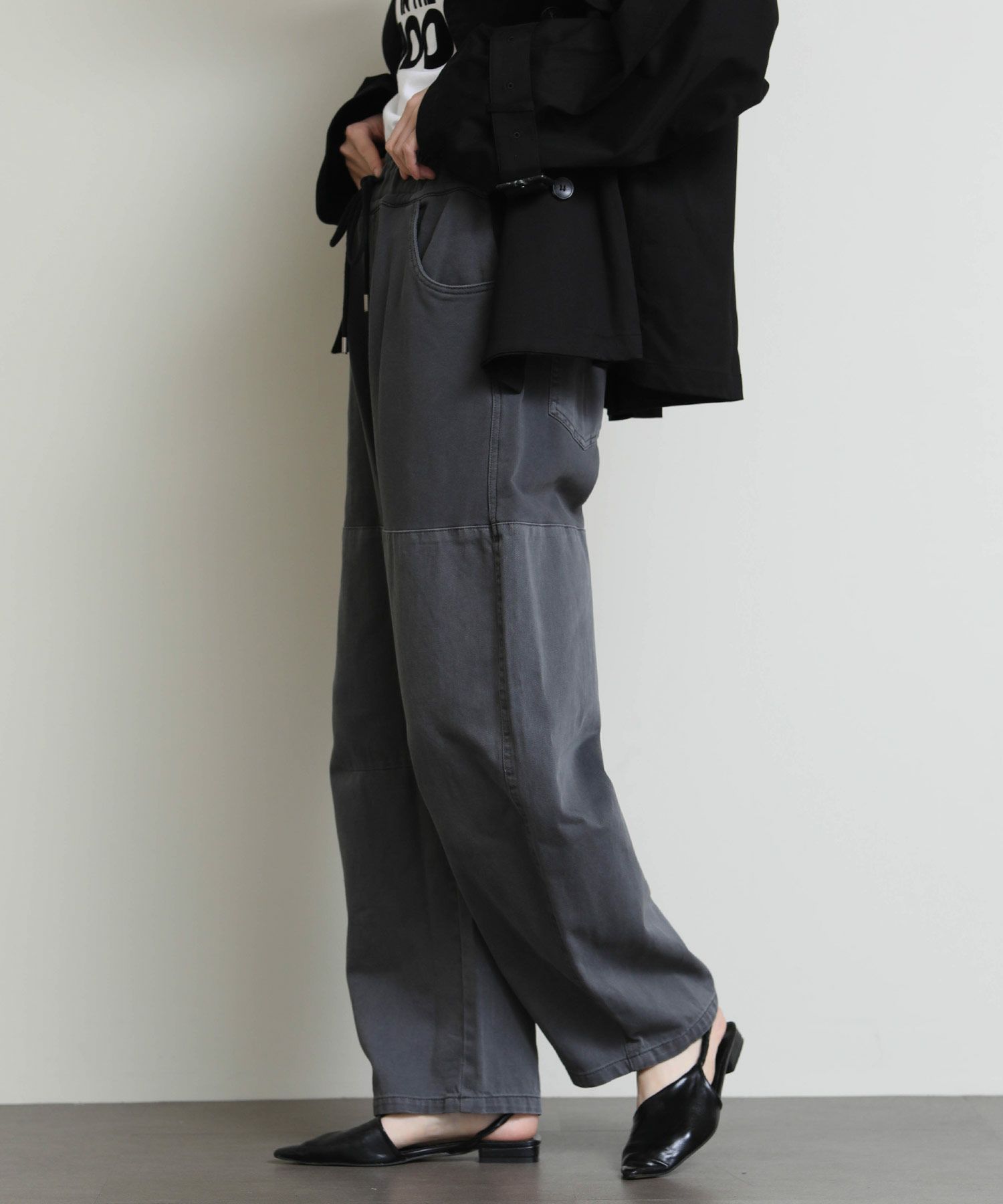 カーブ掛かった丸みのあるシルエットで脚長効果も◎ウエスト周りはゴム仕様でストレスなく着ることができ、紐で調節可能なため、ラフに着こなしていただけます。