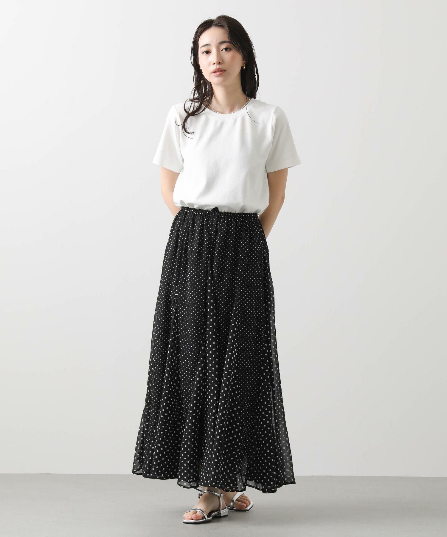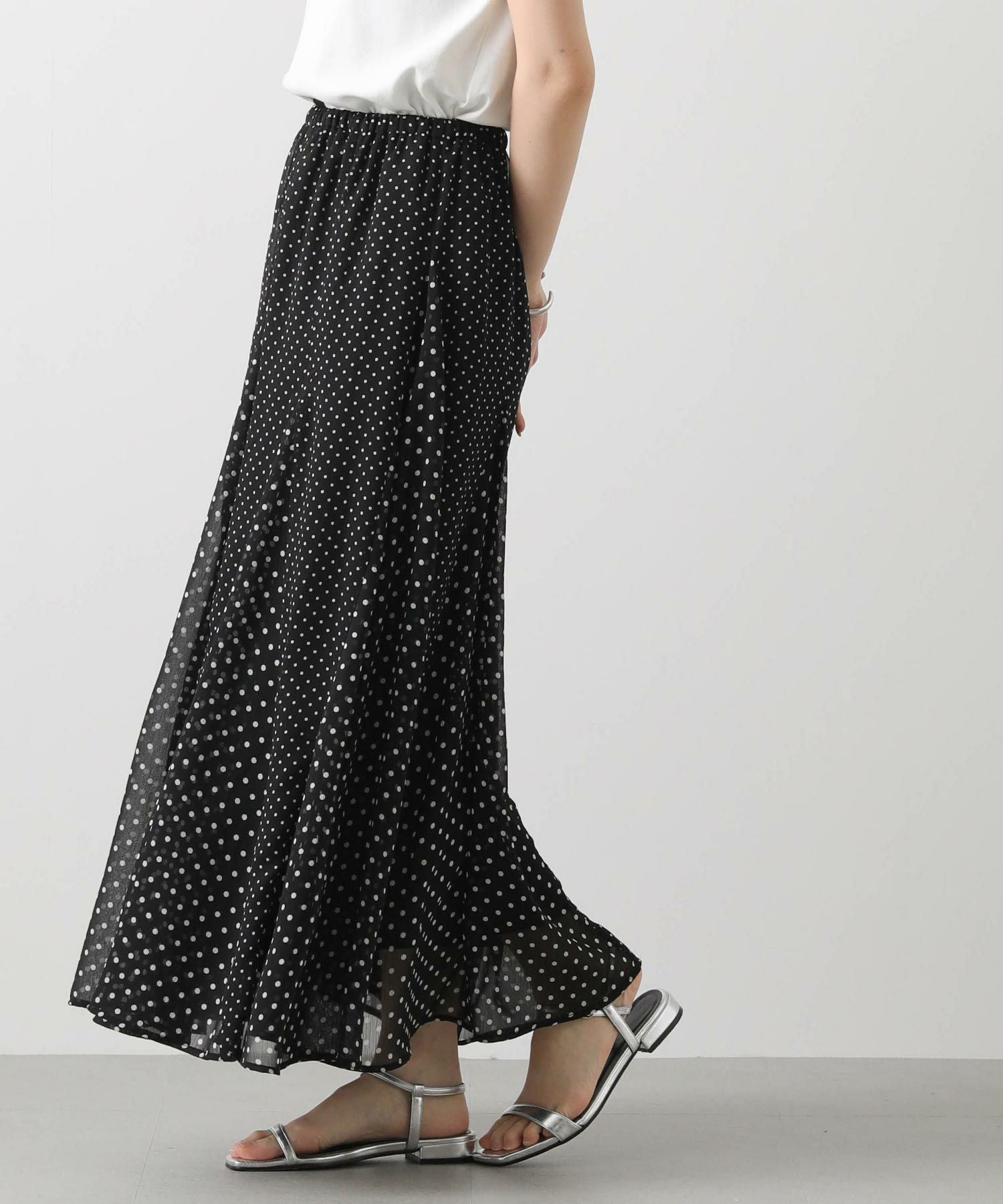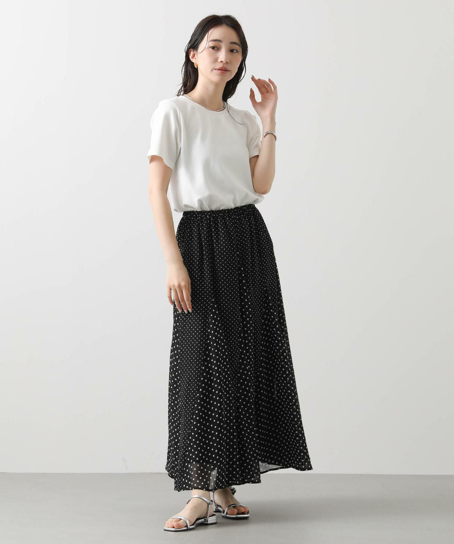 ドラマティックに分量感を出して、歩くたびに軽快に揺れるシルエットが特徴、夏のお出かけ着にオススメしたい1着。シワにもなりにくいので、旅行にも◎