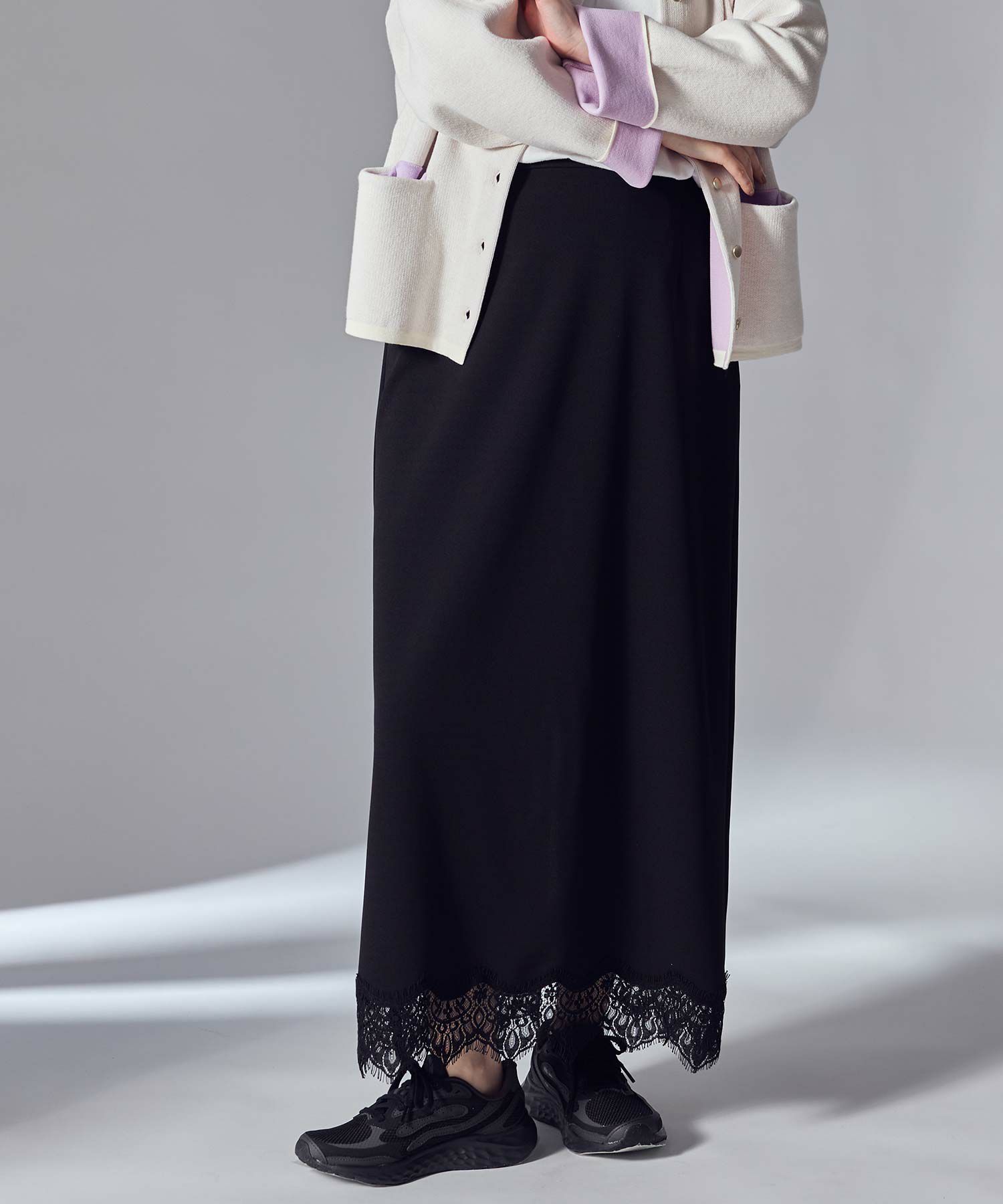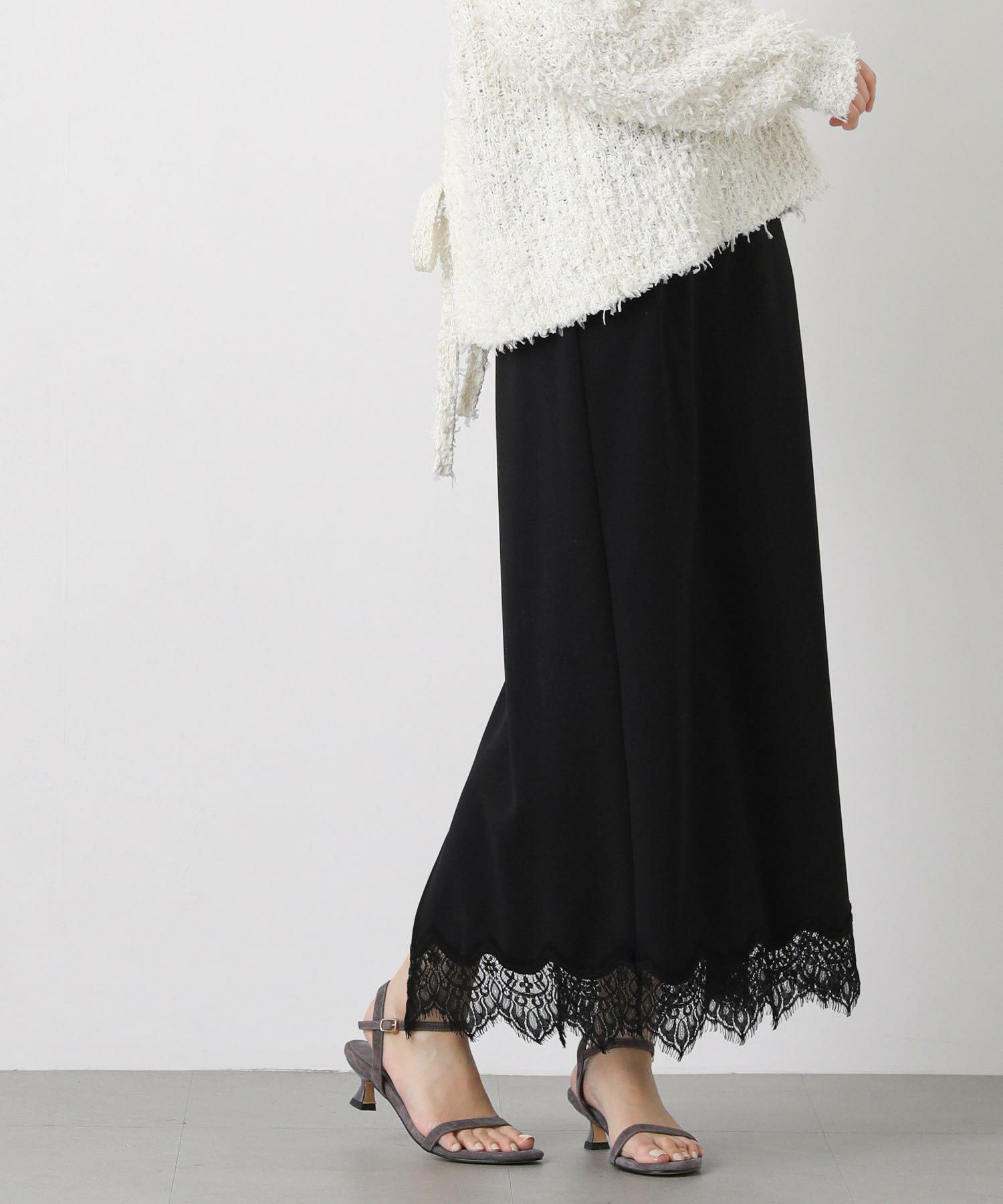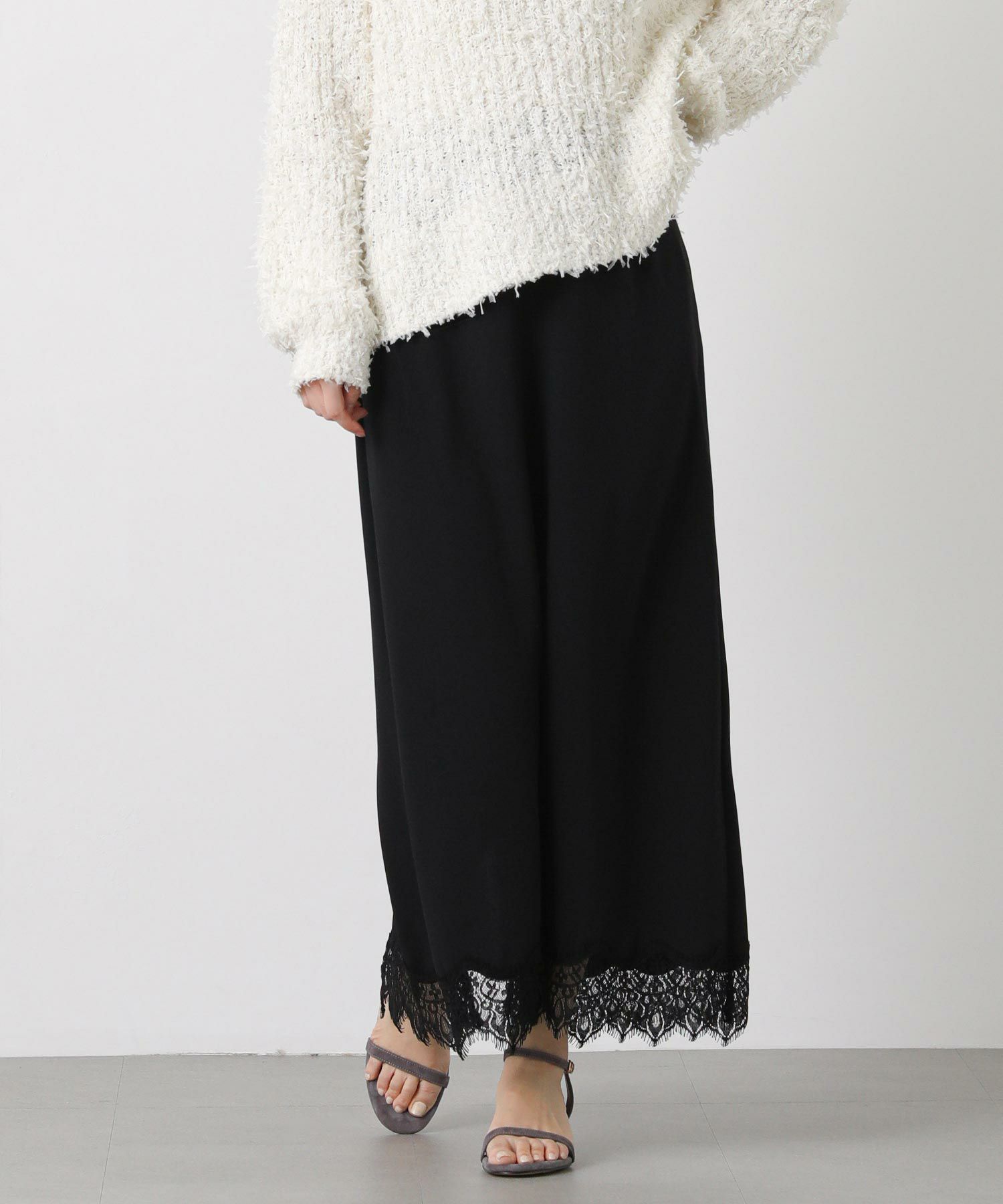 裾にあしらったレースが上品でトレンド感もあり、シンプルなトップスと合わせてもスタイリングが華やかに決まります。