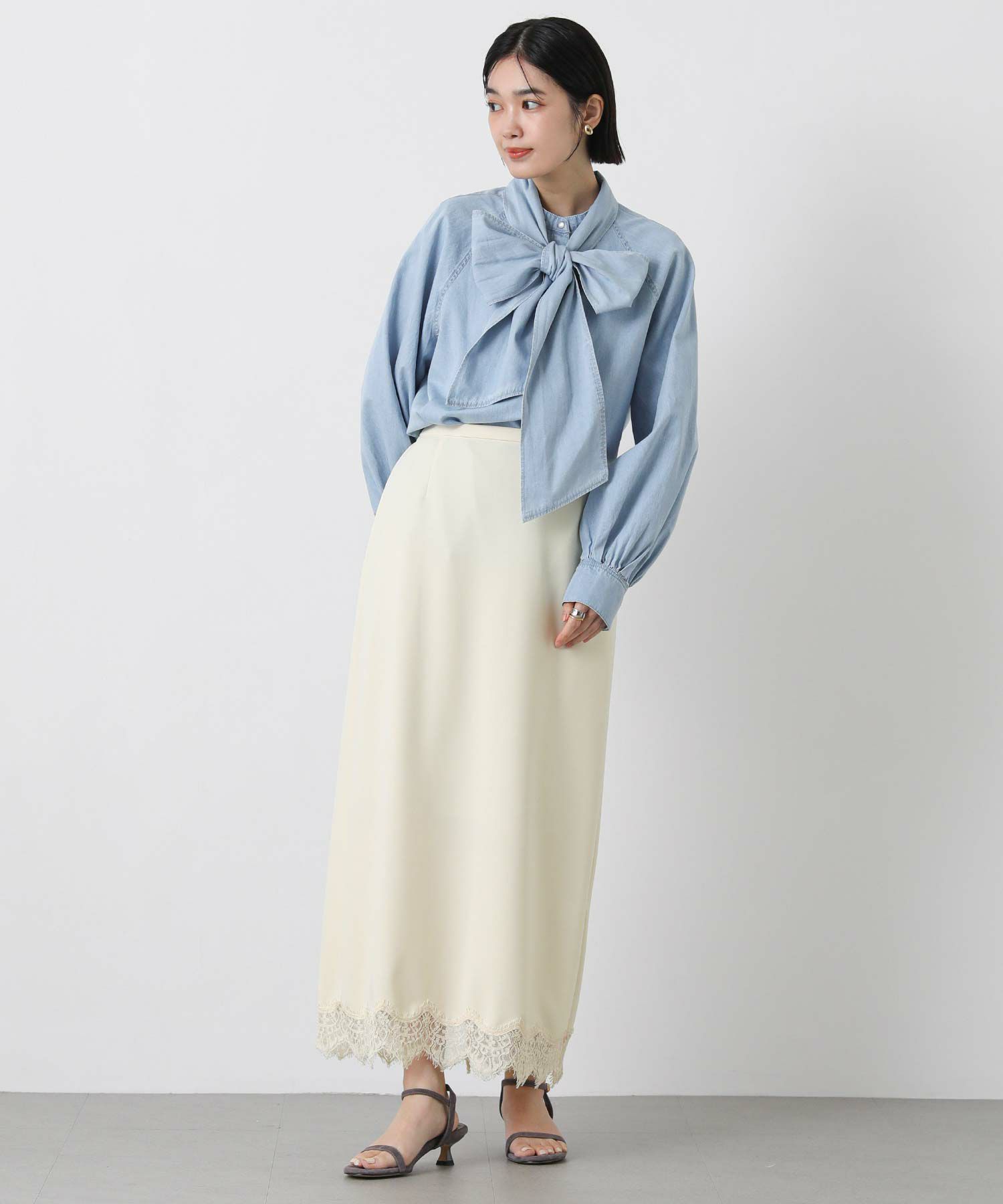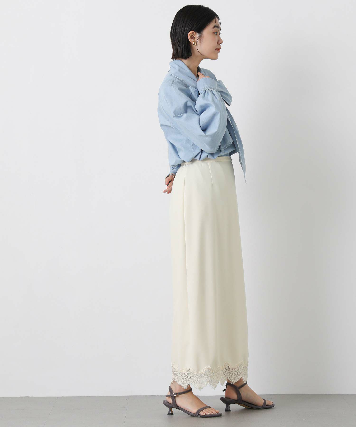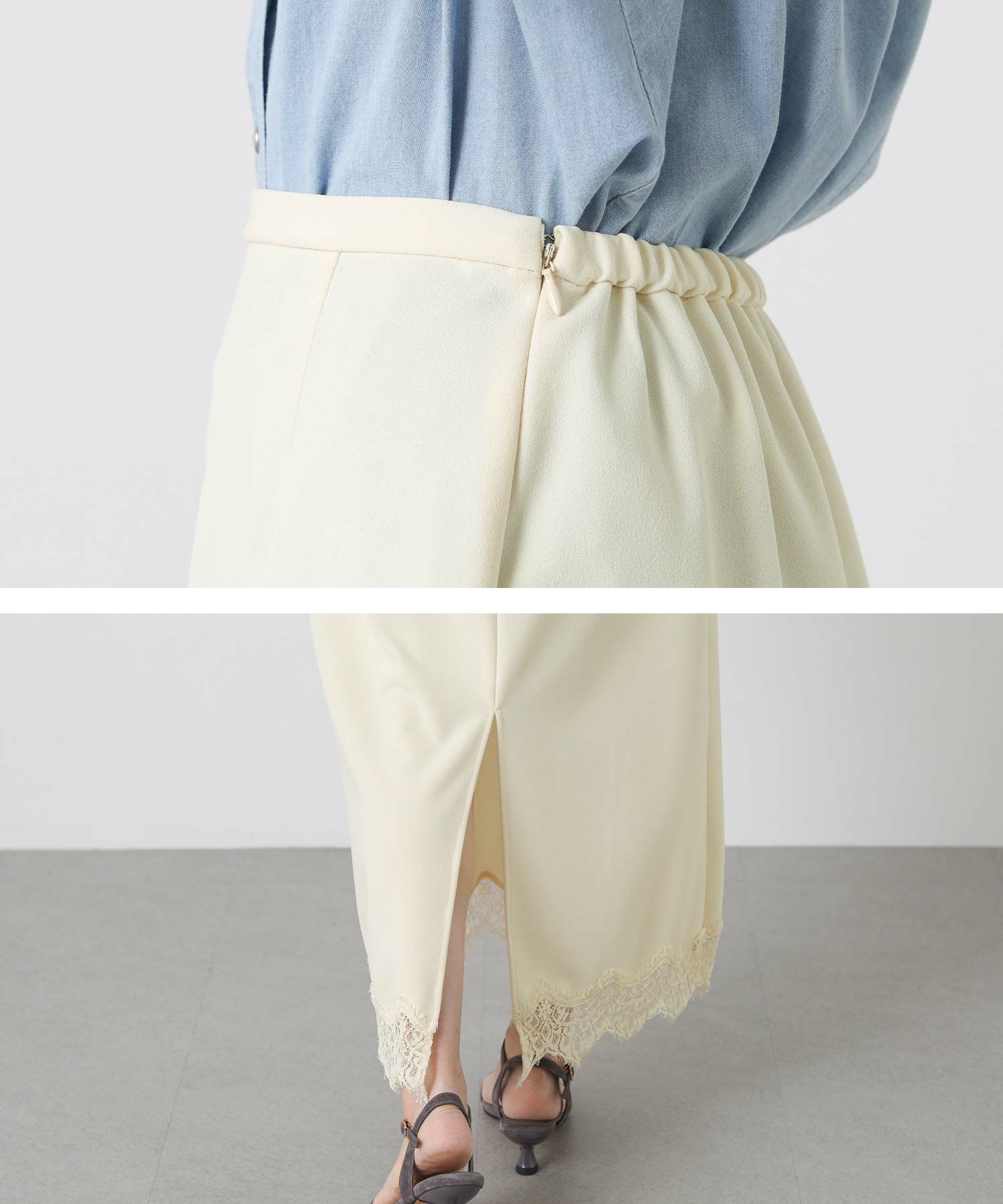 裾にあしらったレースが上品でトレンド感もあり、シンプルなトップスと合わせてもスタイリングが華やかに決まります。