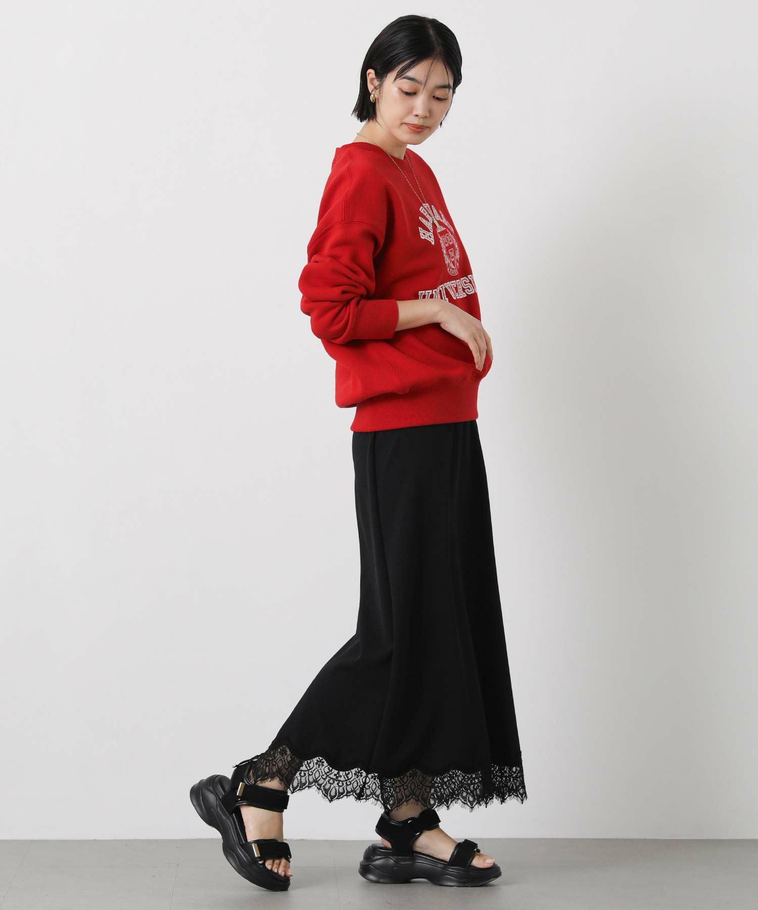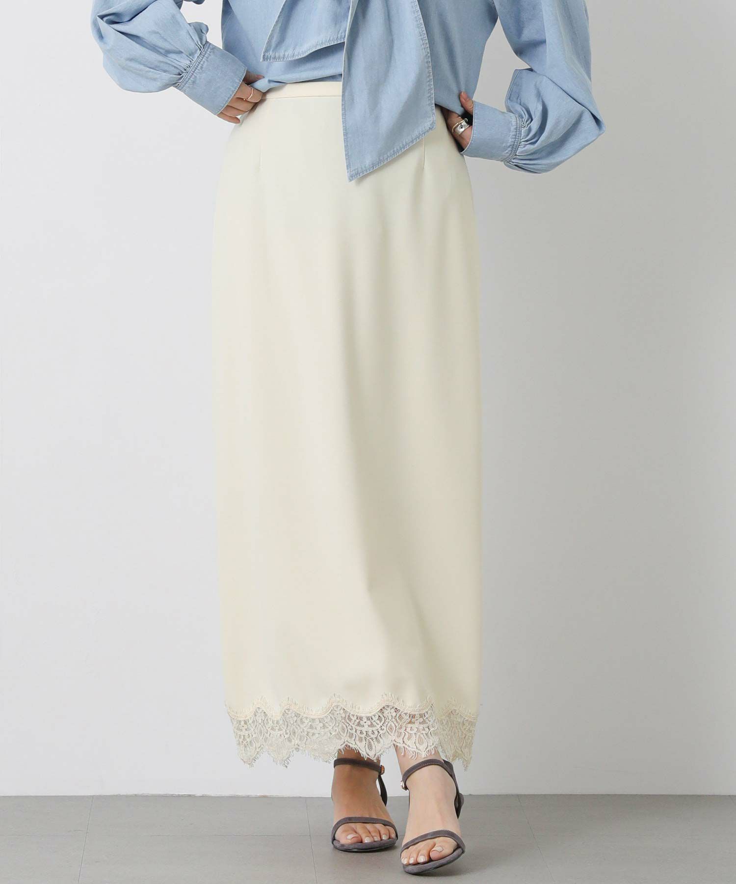 裾にあしらったレースが上品でトレンド感もあり、シンプルなトップスと合わせてもスタイリングが華やかに決まります。