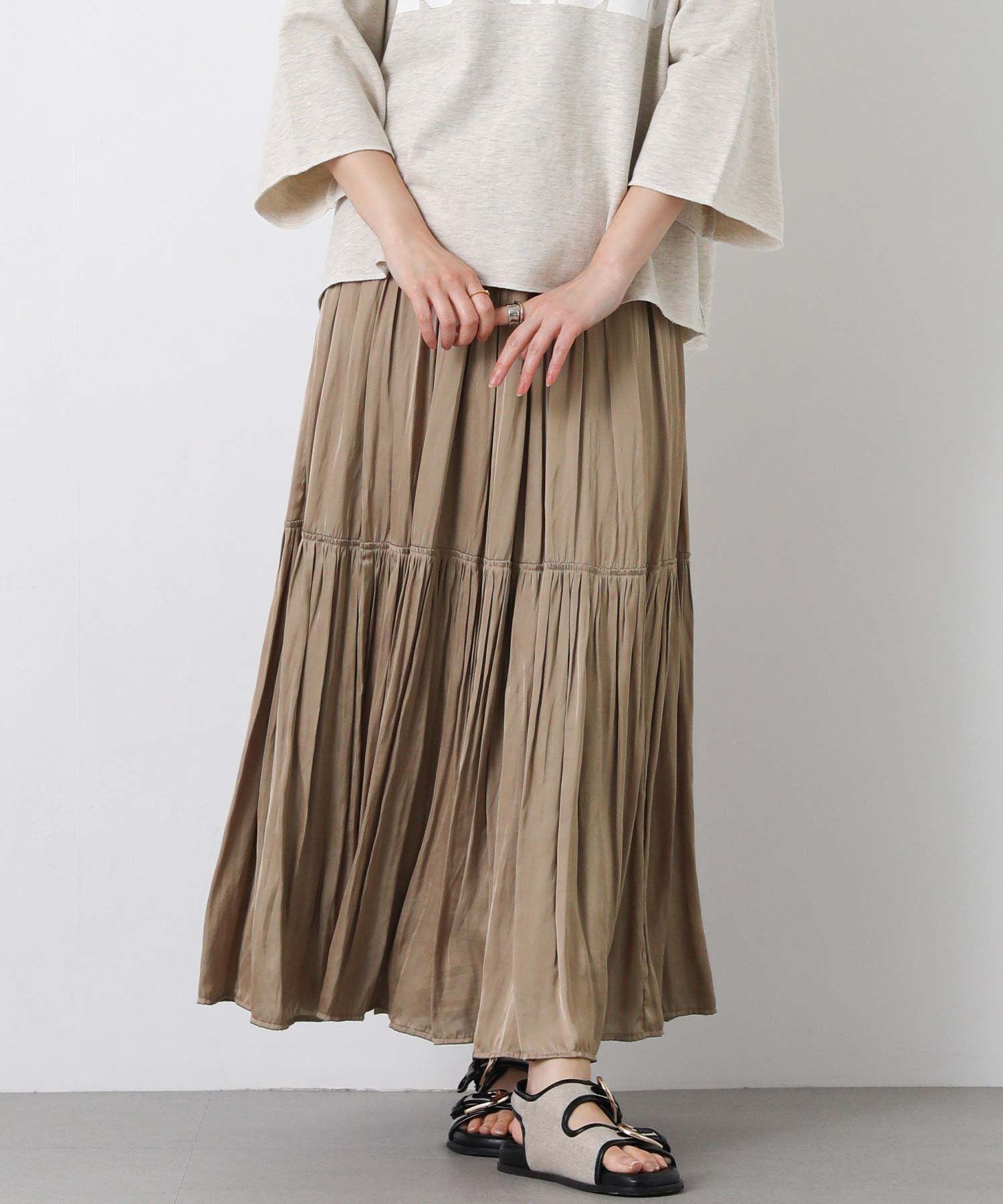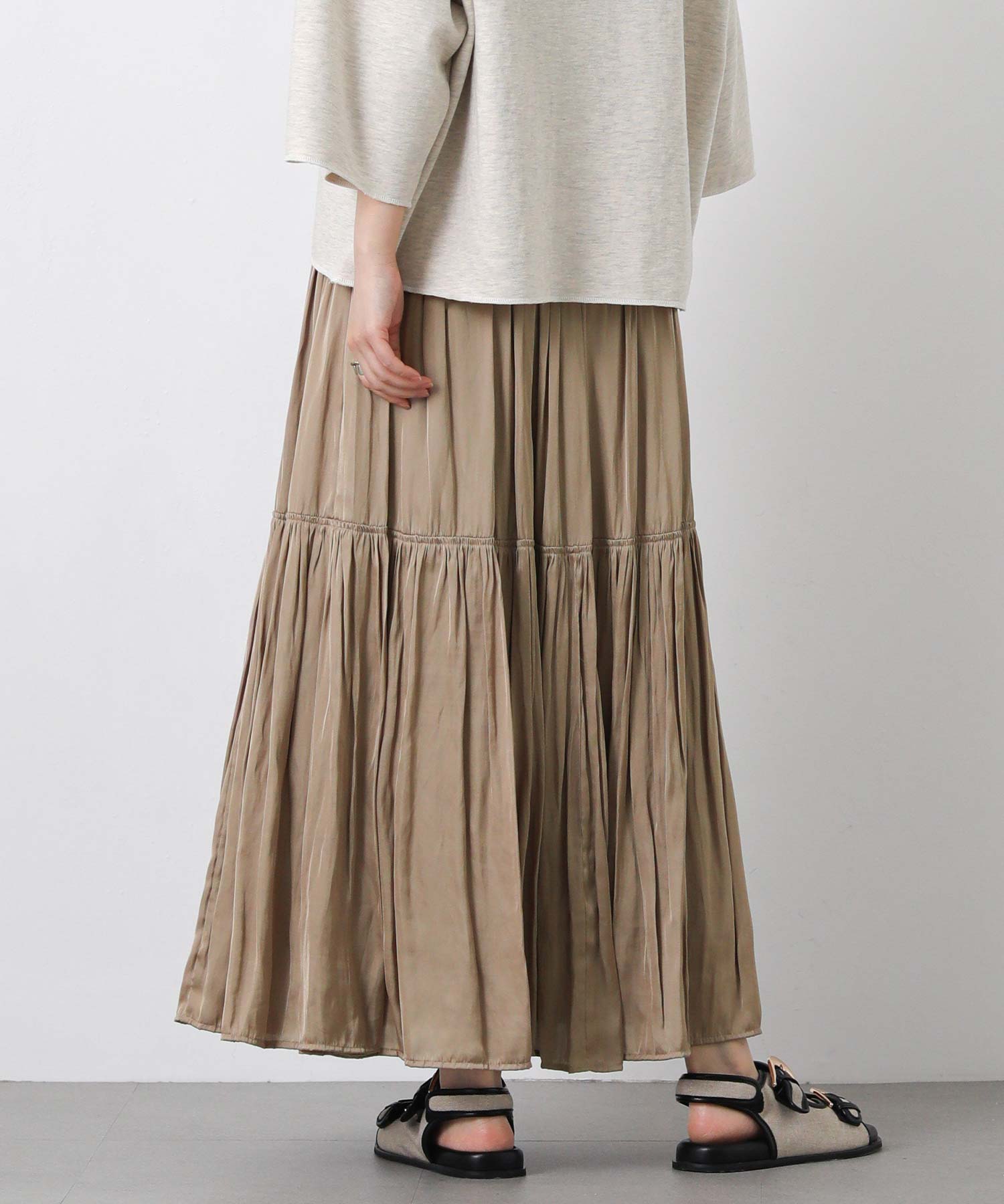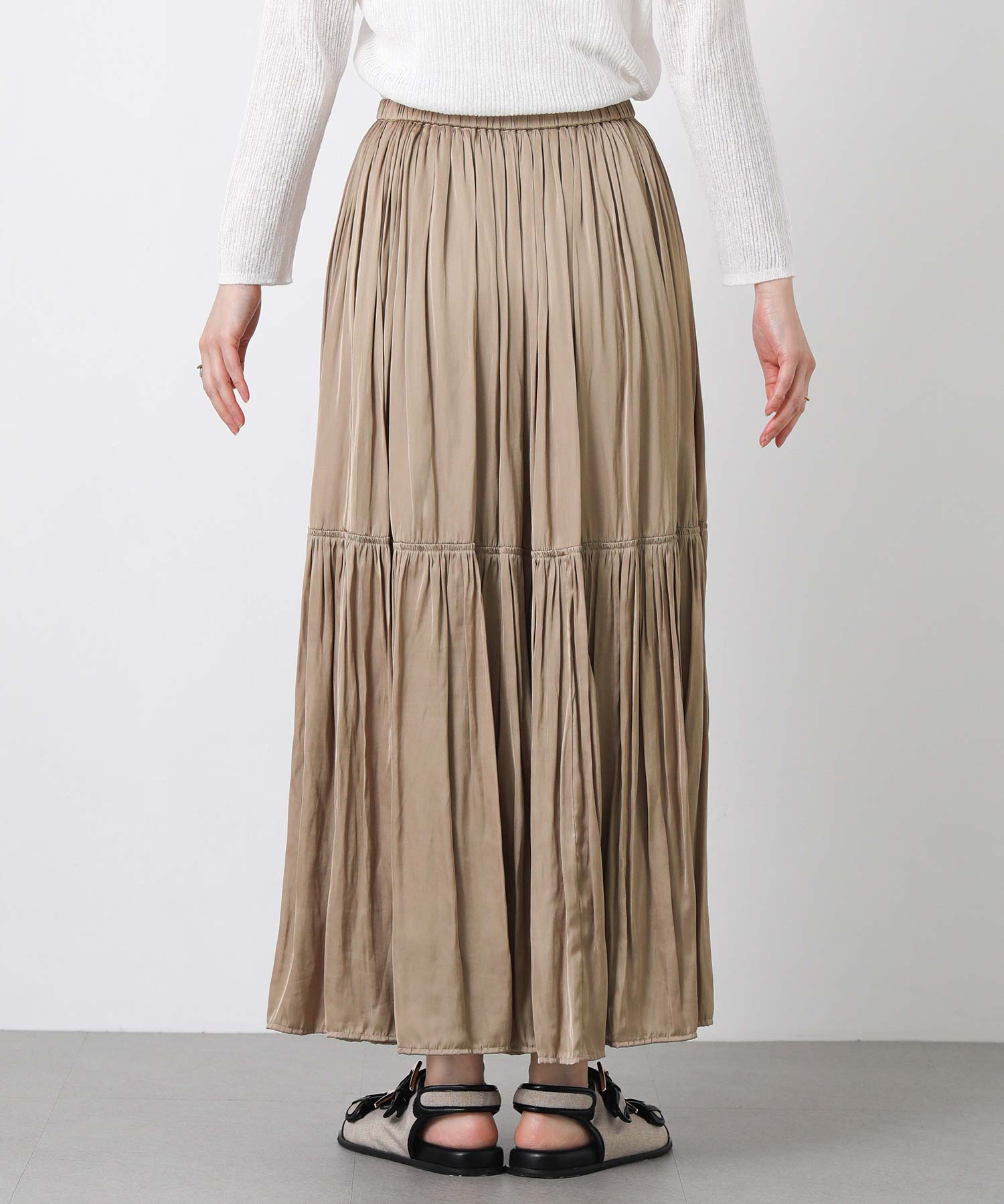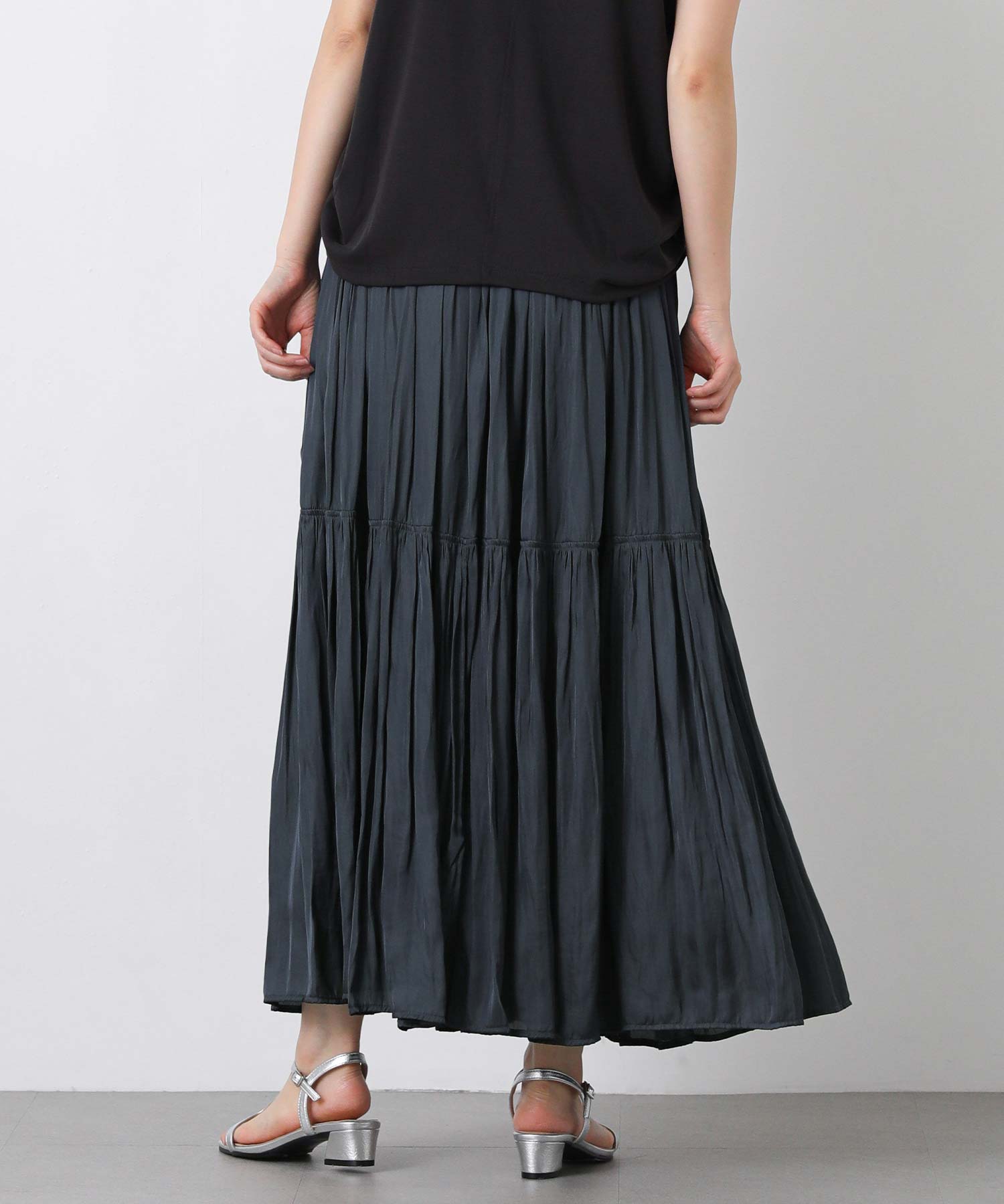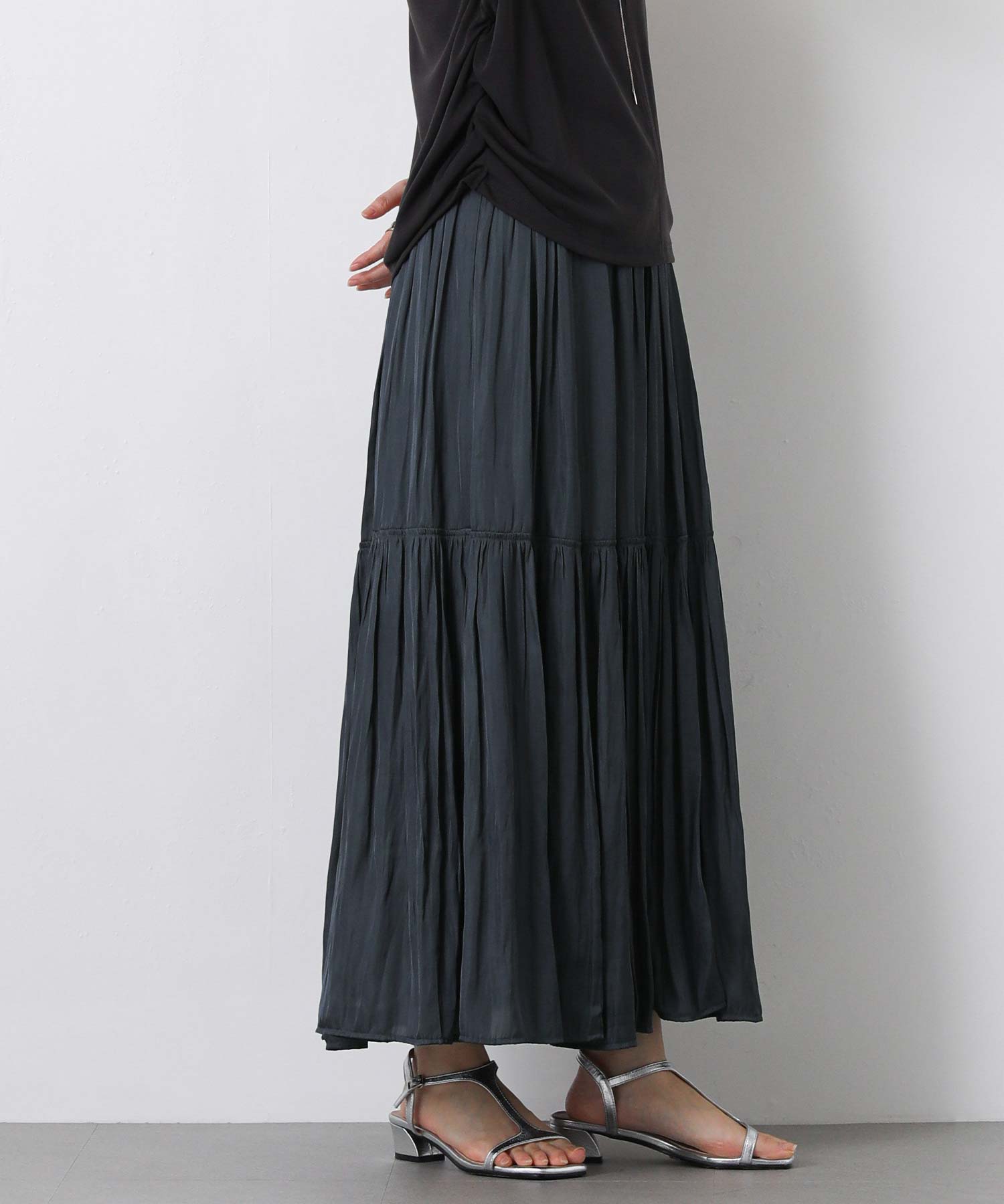 滑らかな風合いの流れるようなシルエットと、たっぷりギャザーを入れたボリューム感が魅力のスカート。