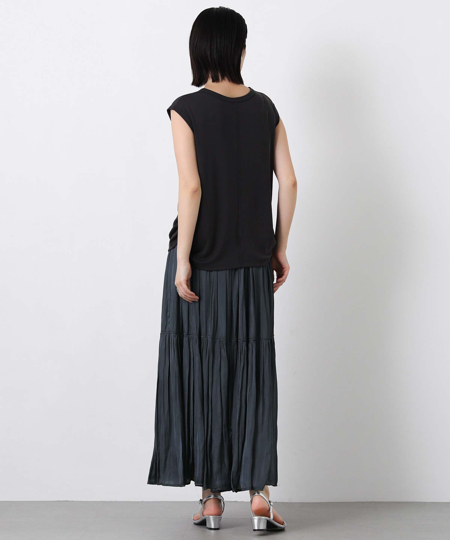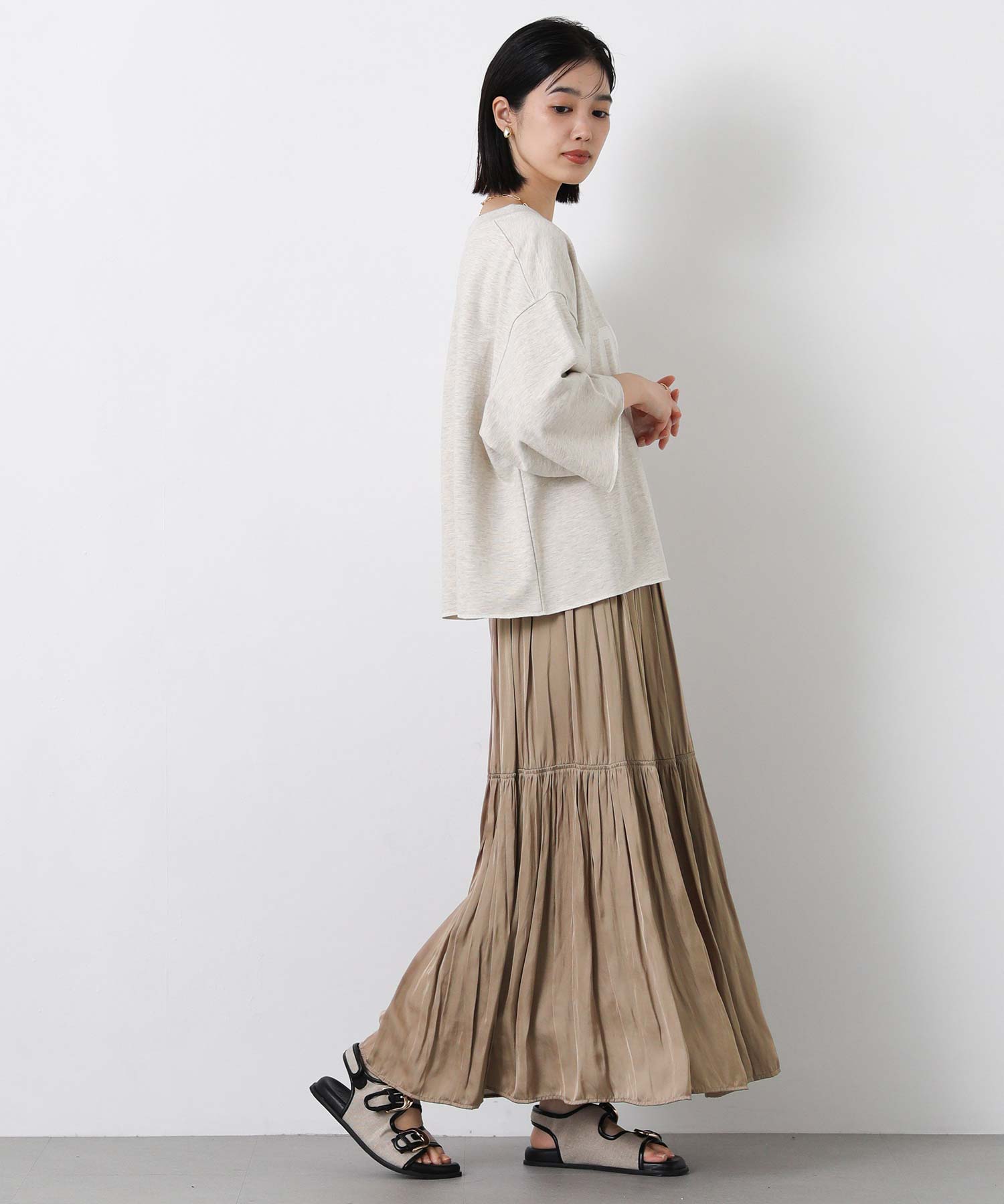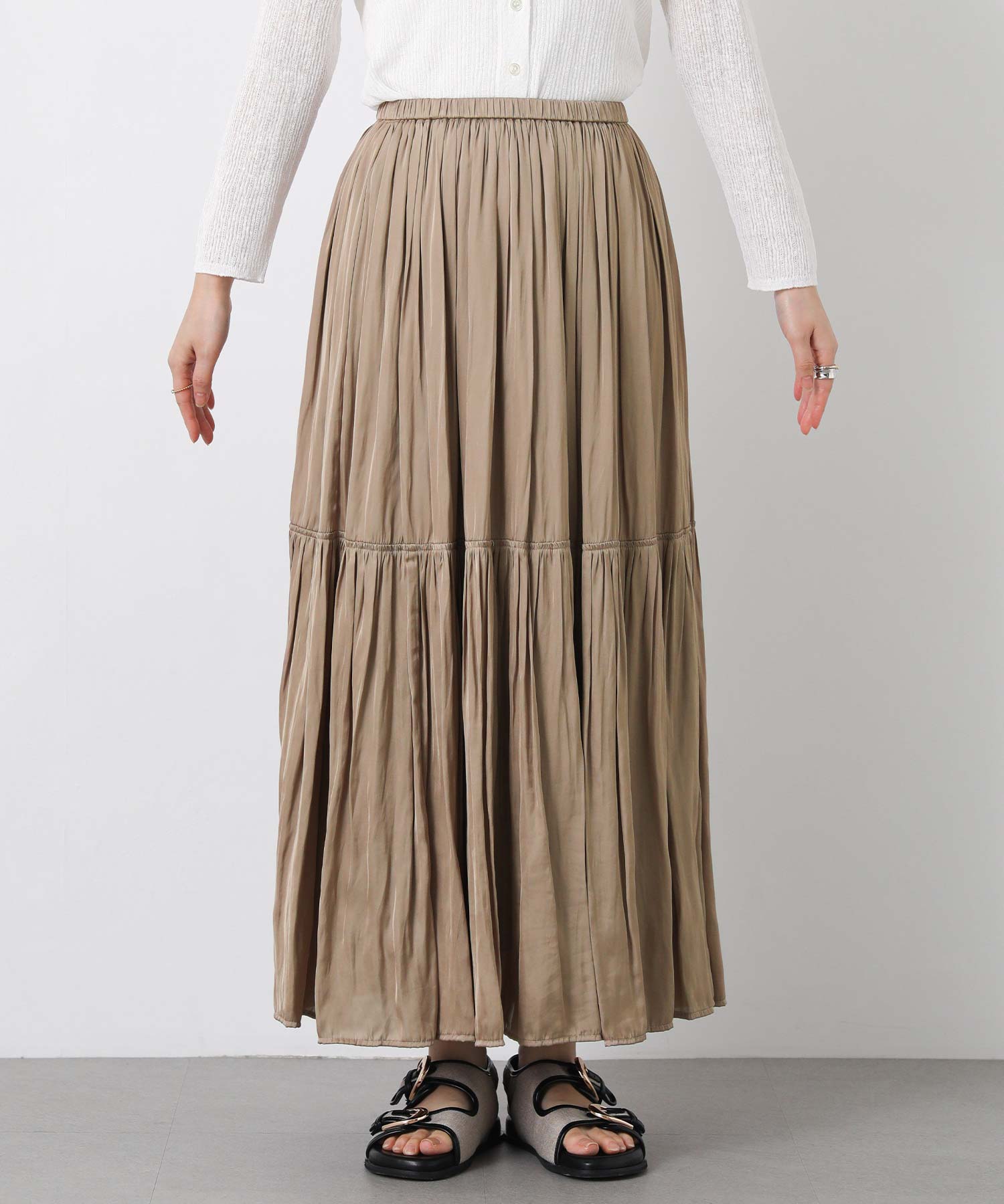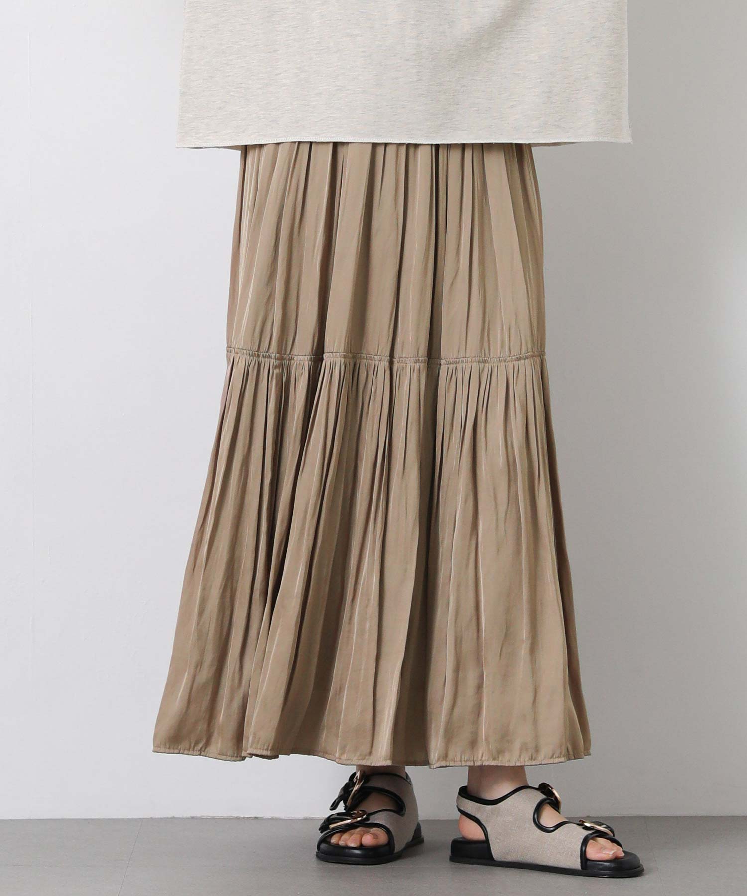 滑らかな風合いの流れるようなシルエットと、たっぷりギャザーを入れたボリューム感が魅力のスカート。