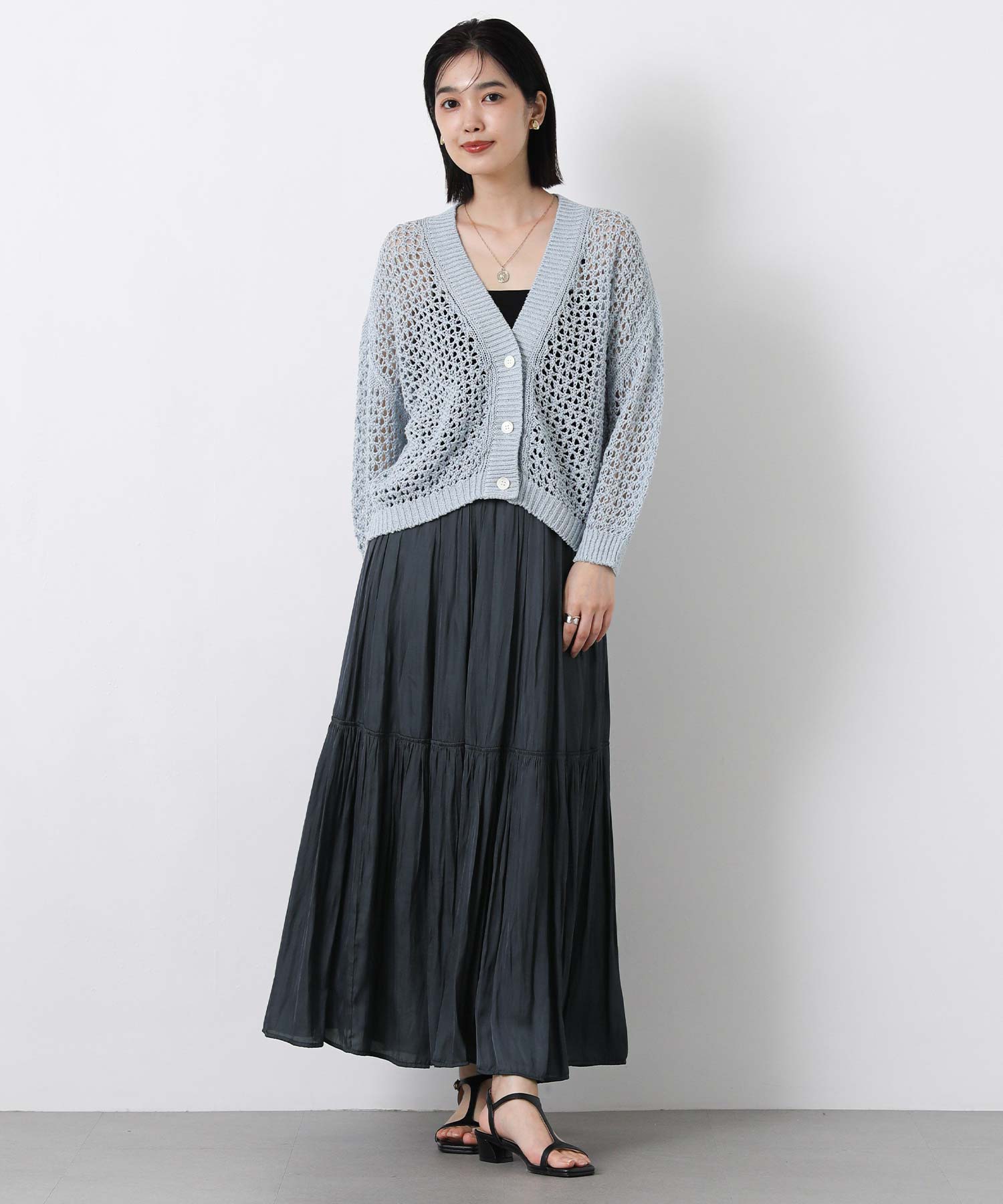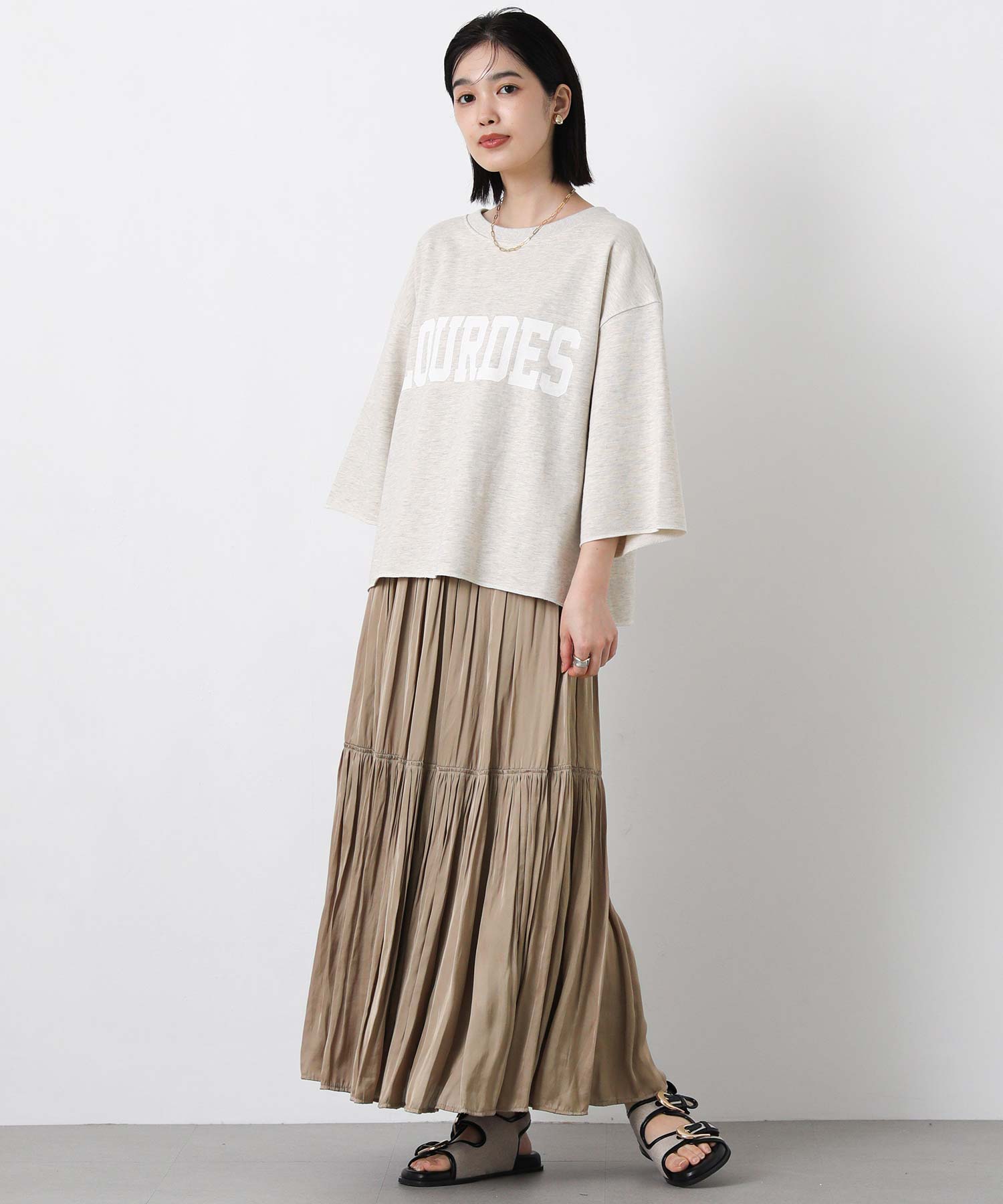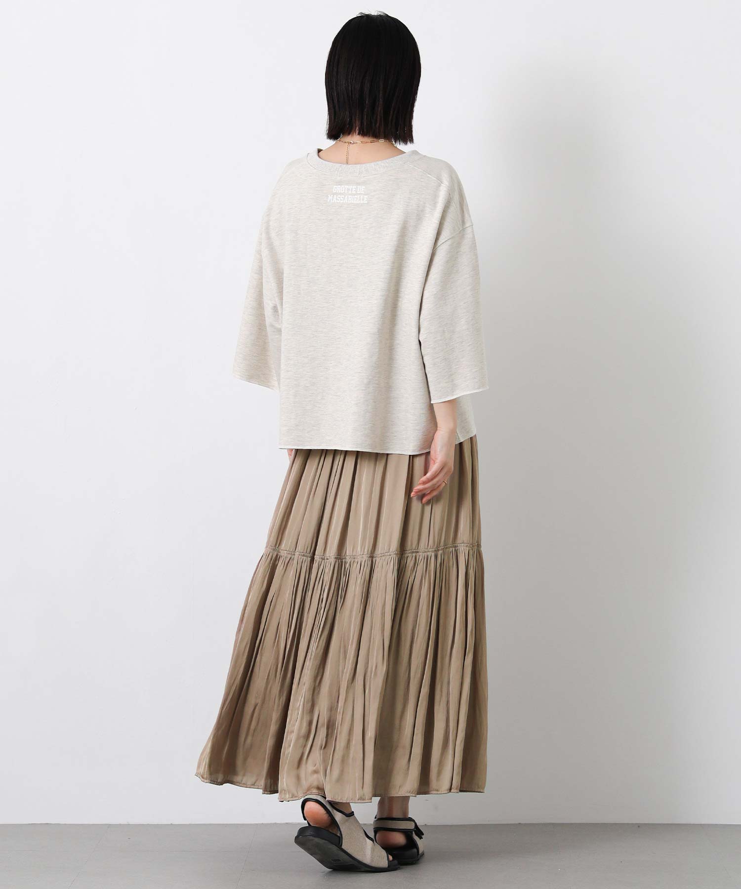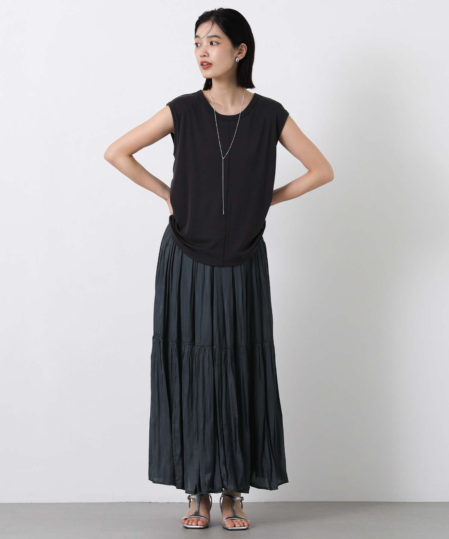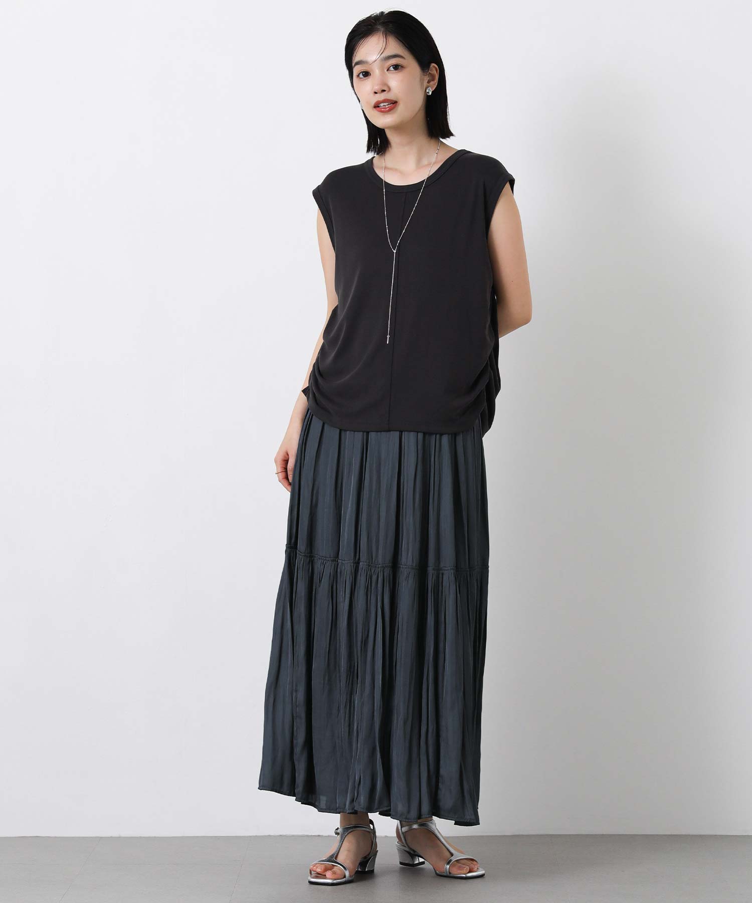 滑らかな風合いの流れるようなシルエットと、たっぷりギャザーを入れたボリューム感が魅力のスカート。