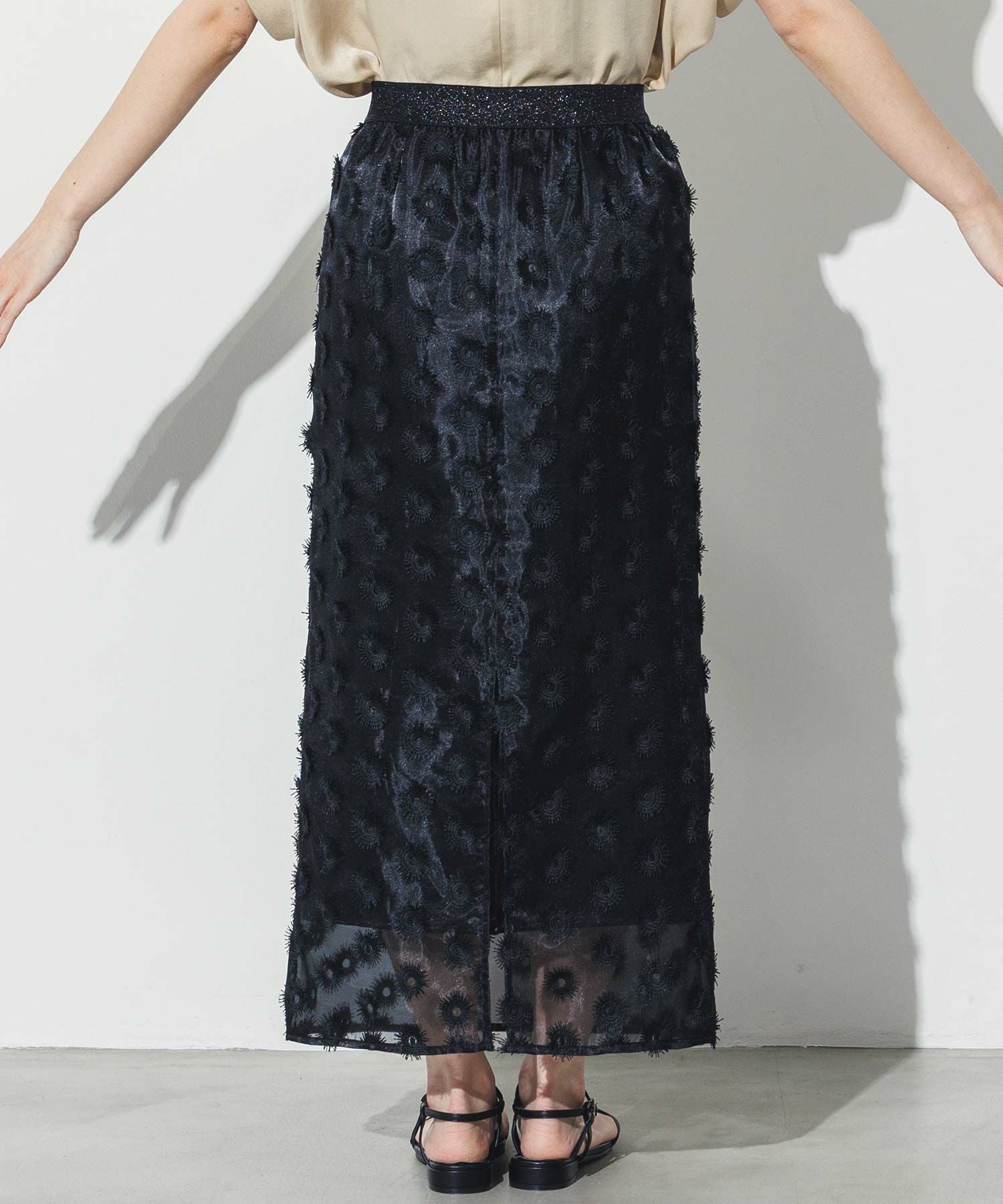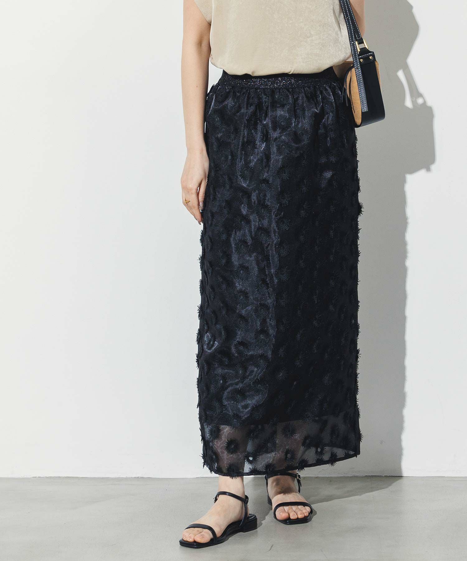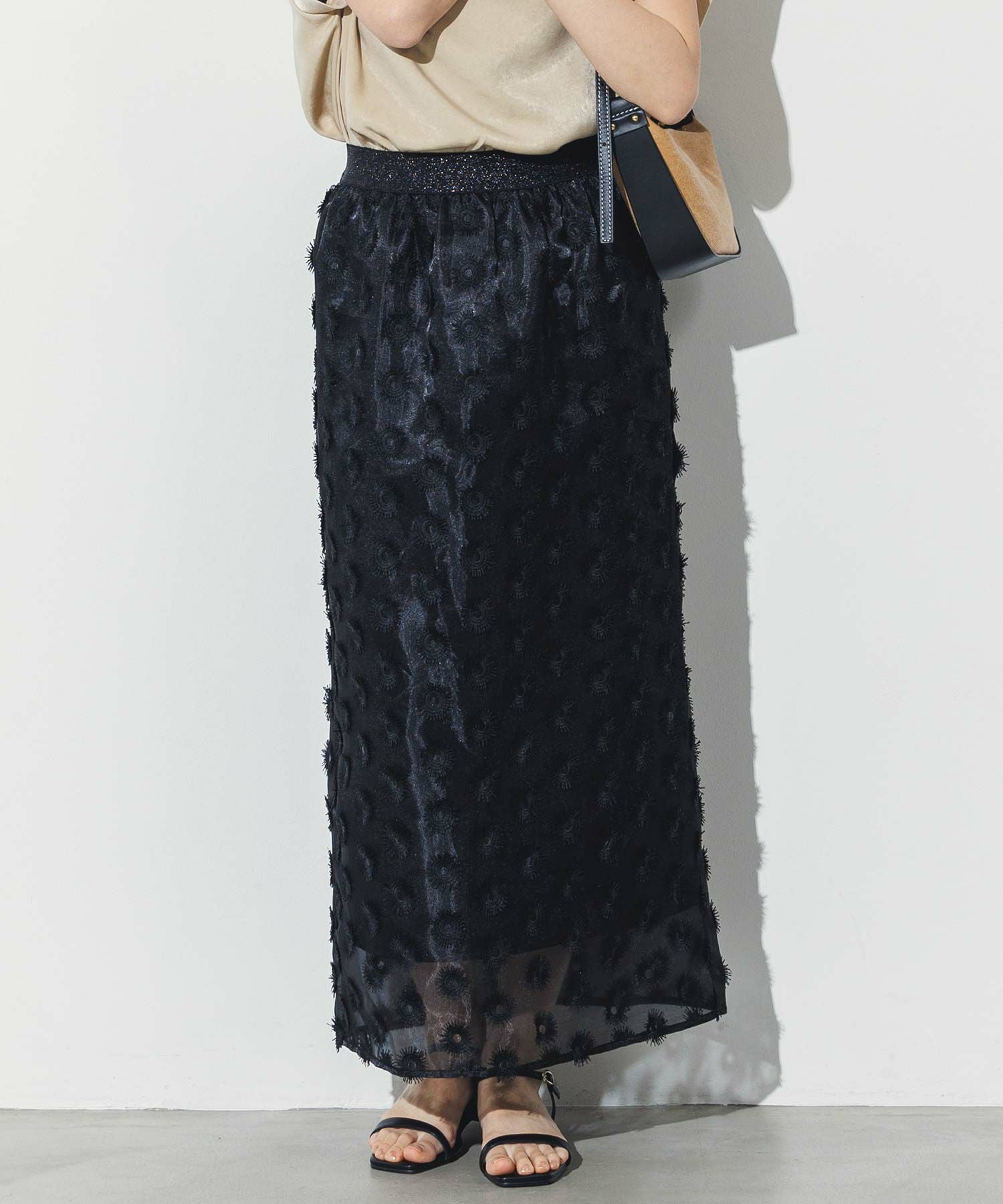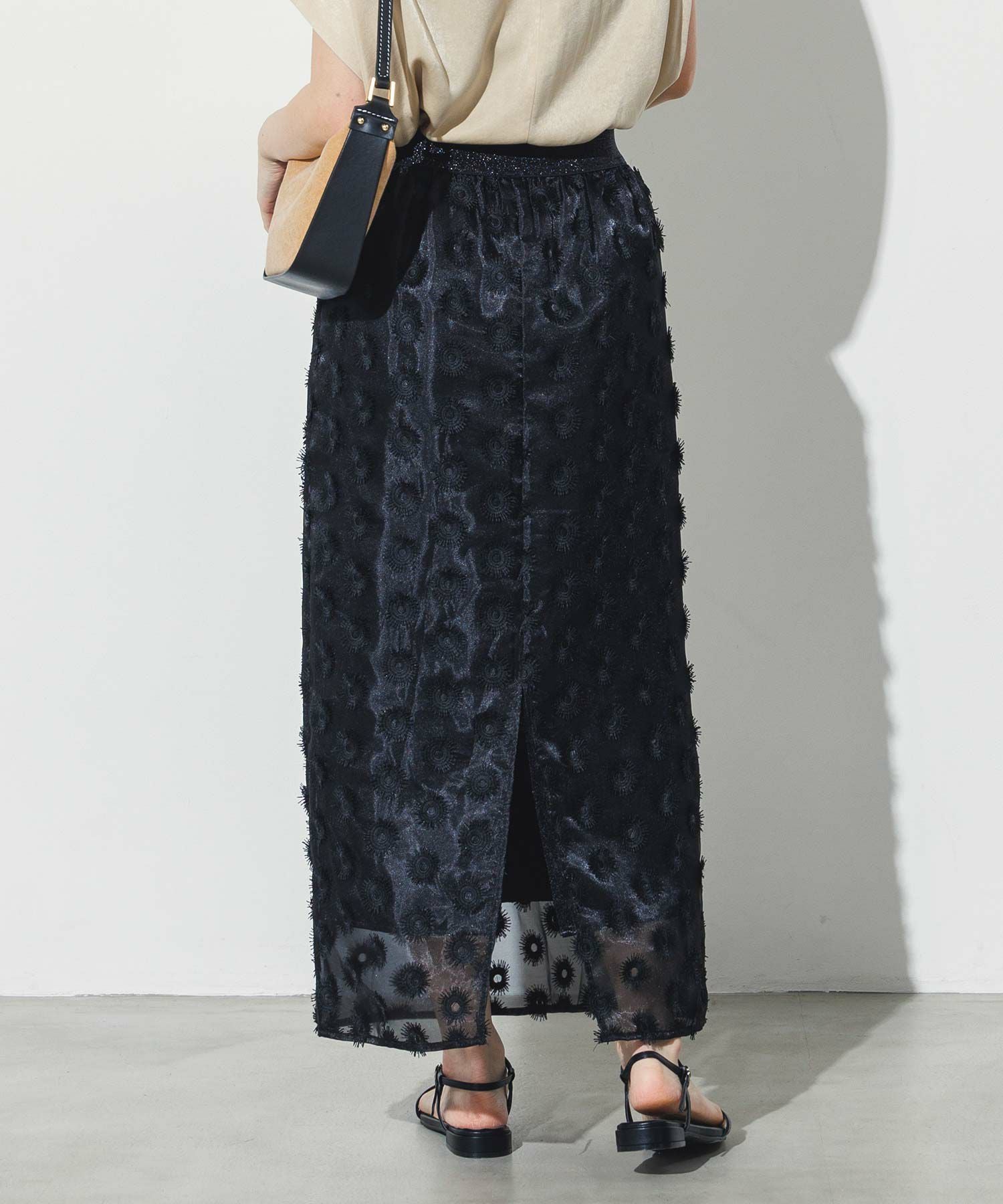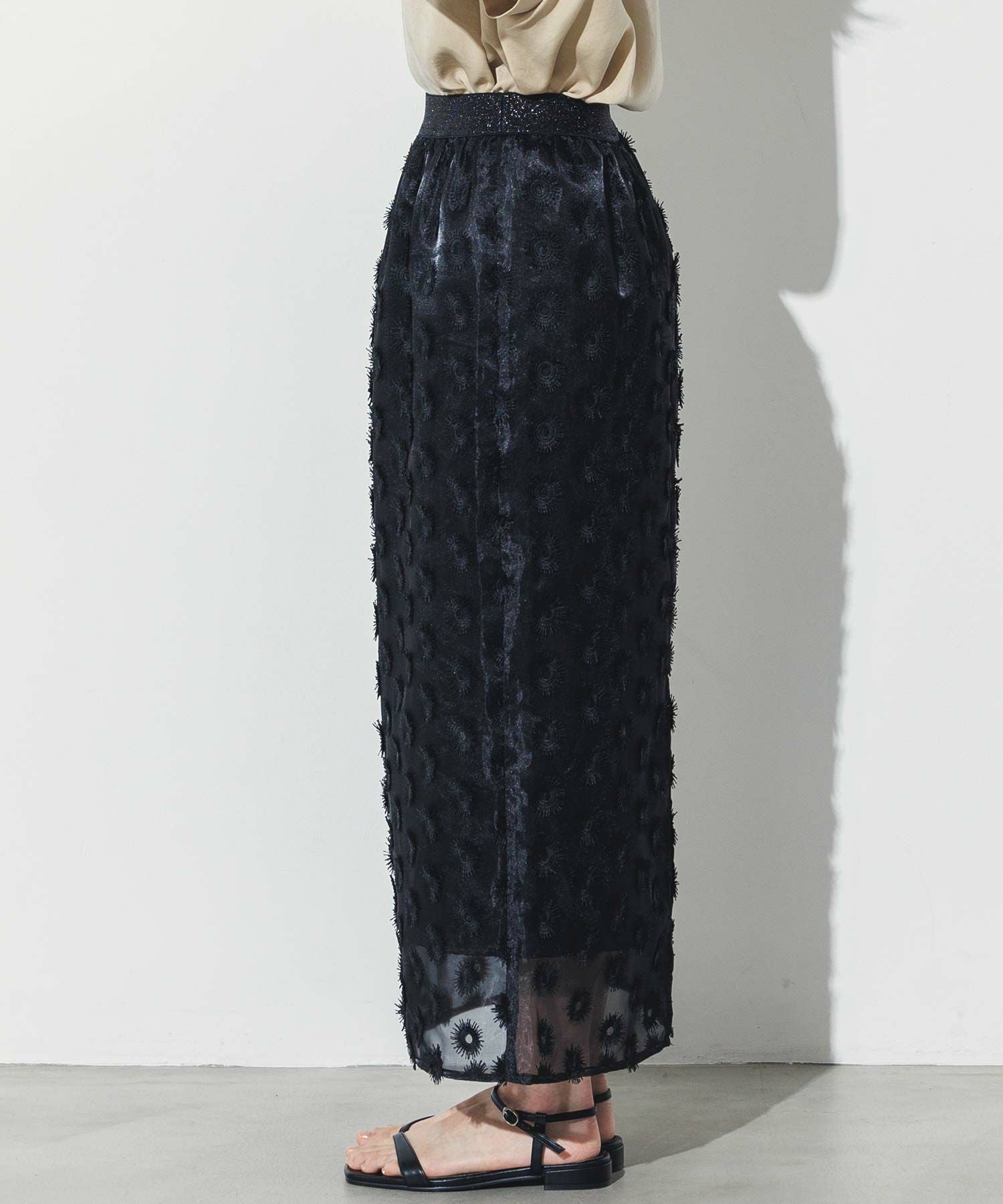 オーガンジーに立体的に刺繍されており、シアー感があるので軽さがあり大人っぽい印象です。ウエストはラメ入りのゴムを使用しており、トップスをインしたときにもアクセントになってバランスよく着て頂けます。