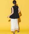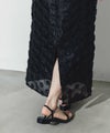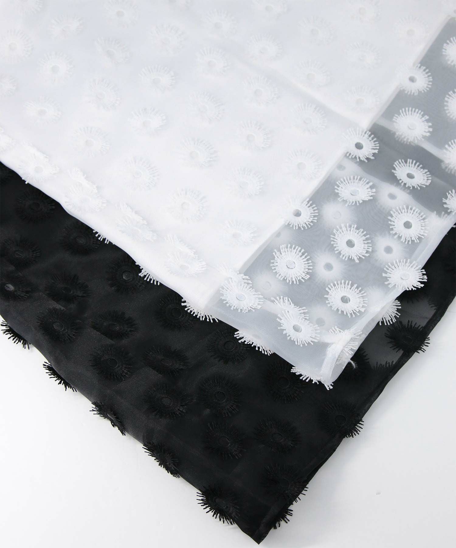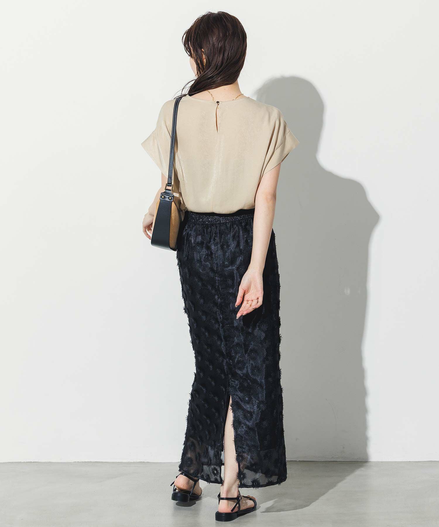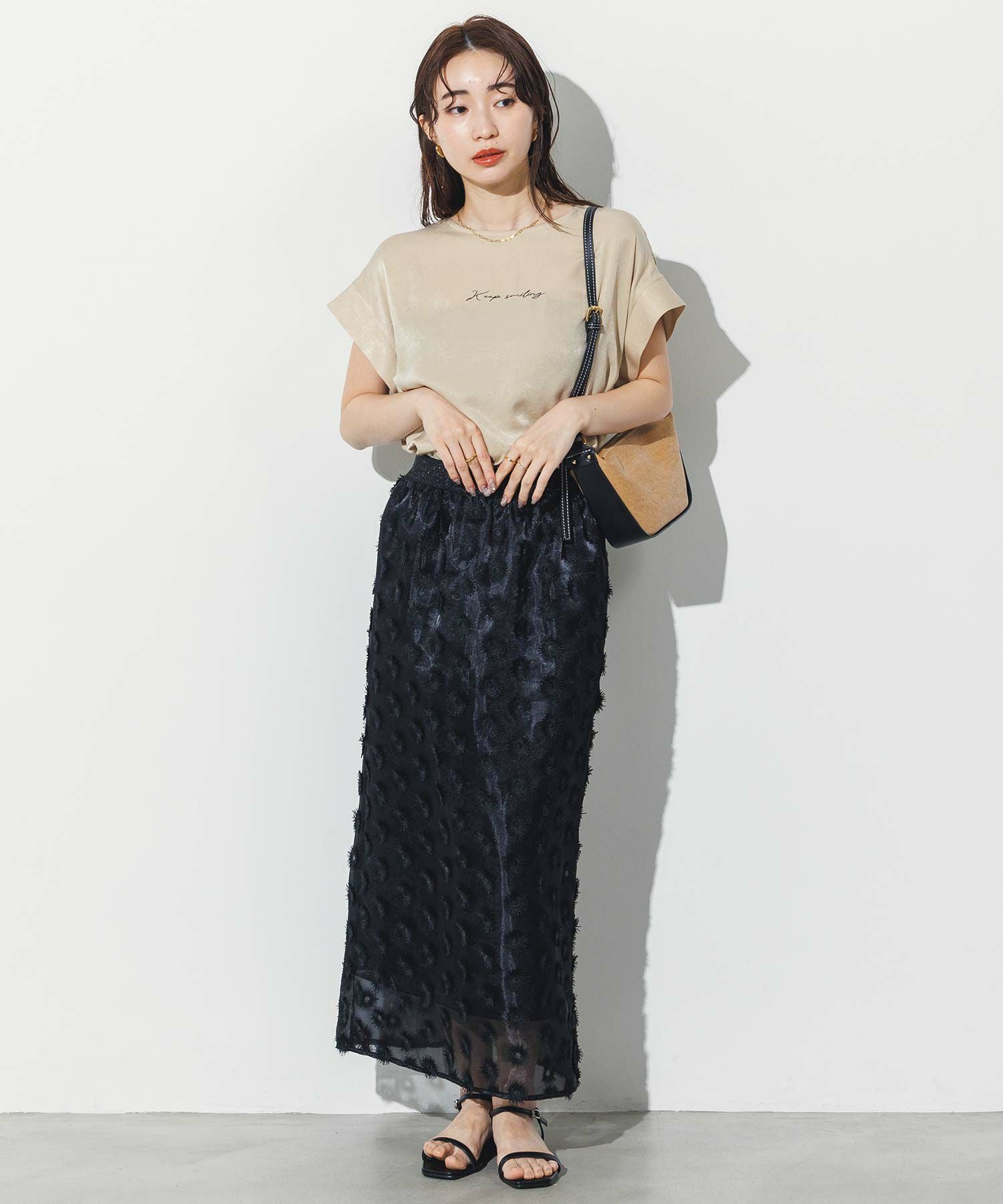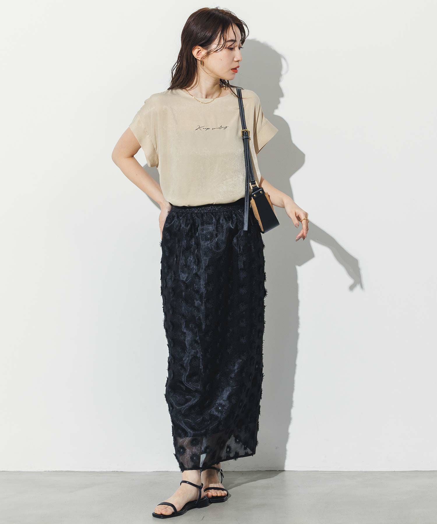 オーガンジーに立体的に刺繍されており、シアー感があるので軽さがあり大人っぽい印象です。ウエストはラメ入りのゴムを使用しており、トップスをインしたときにもアクセントになってバランスよく着て頂けます。