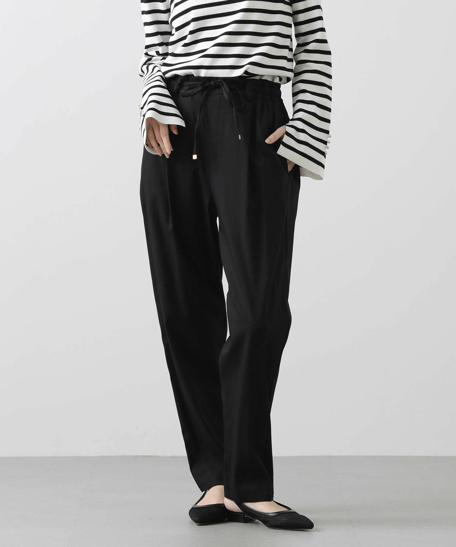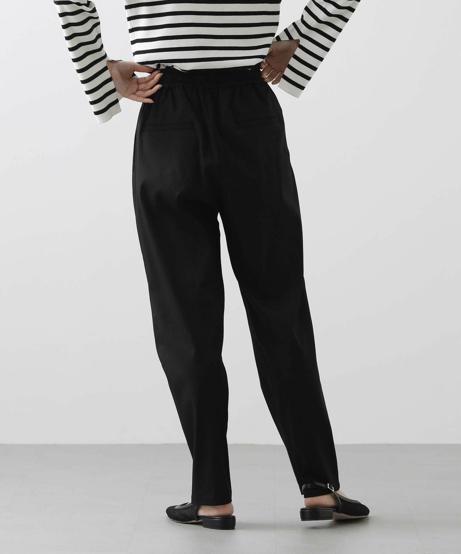 フロントウエストはすっきりときれいな印象に仕上げているので、楽ちんな穿き心地ながらきちんと感も◎オンオフ問わずに幅広いシーンで活躍します。