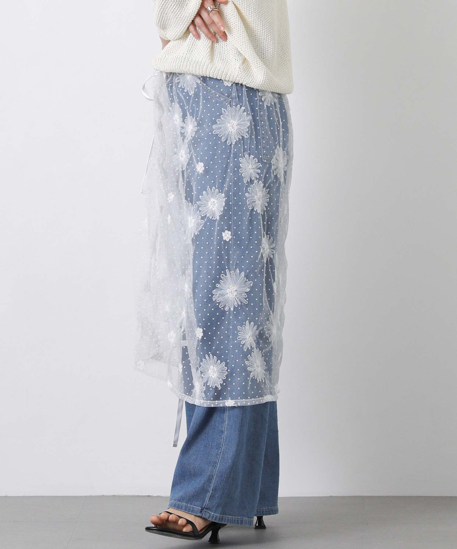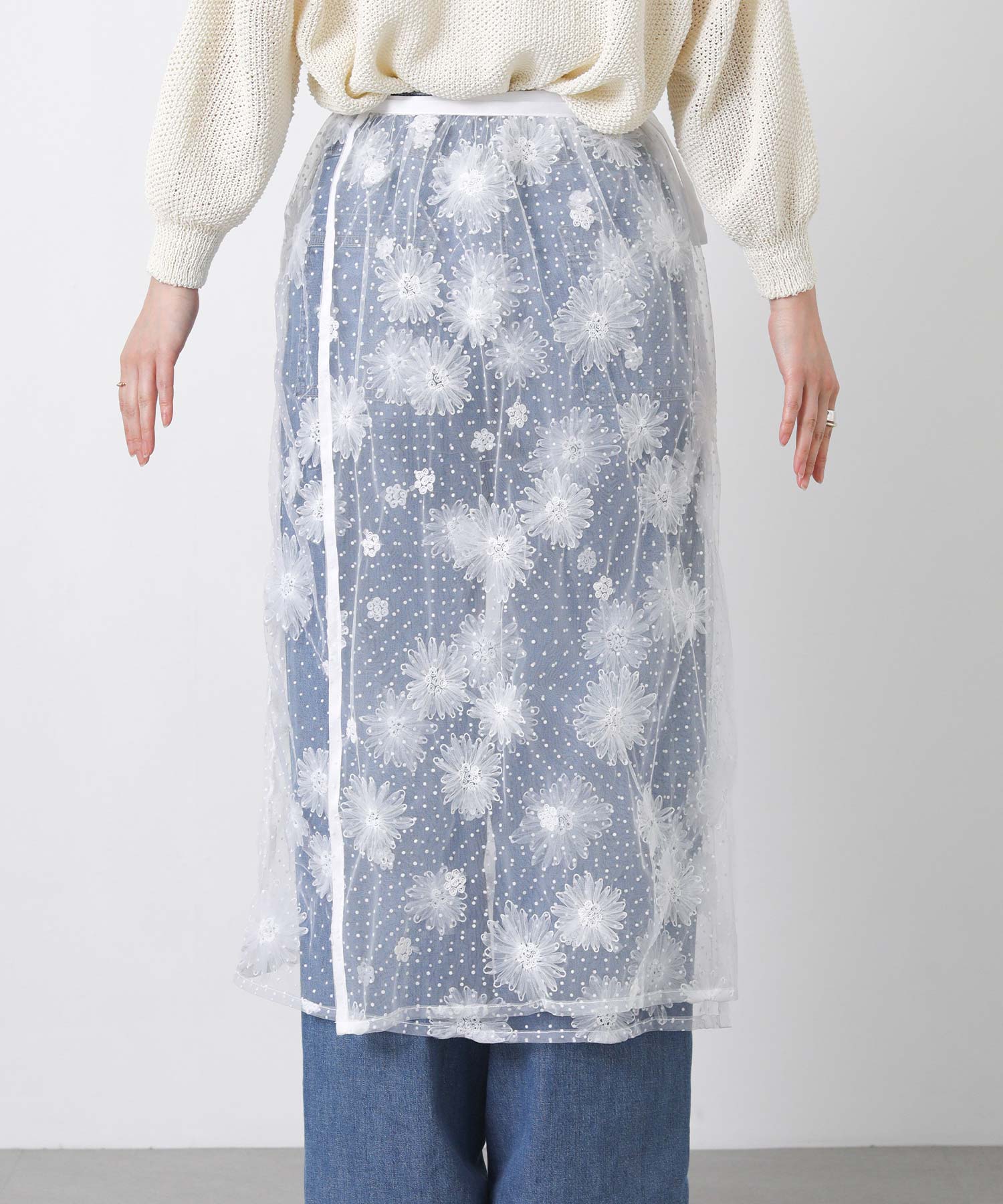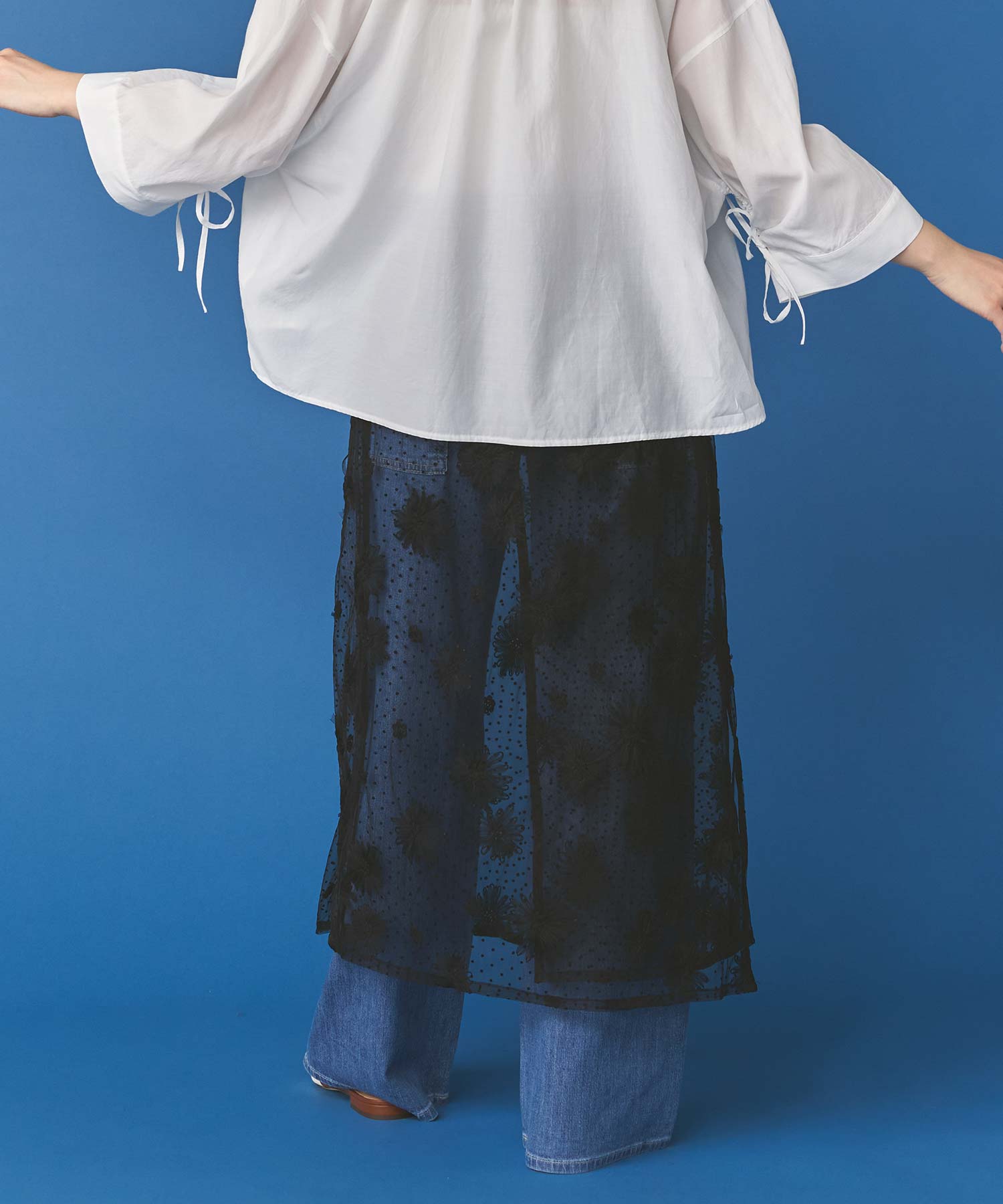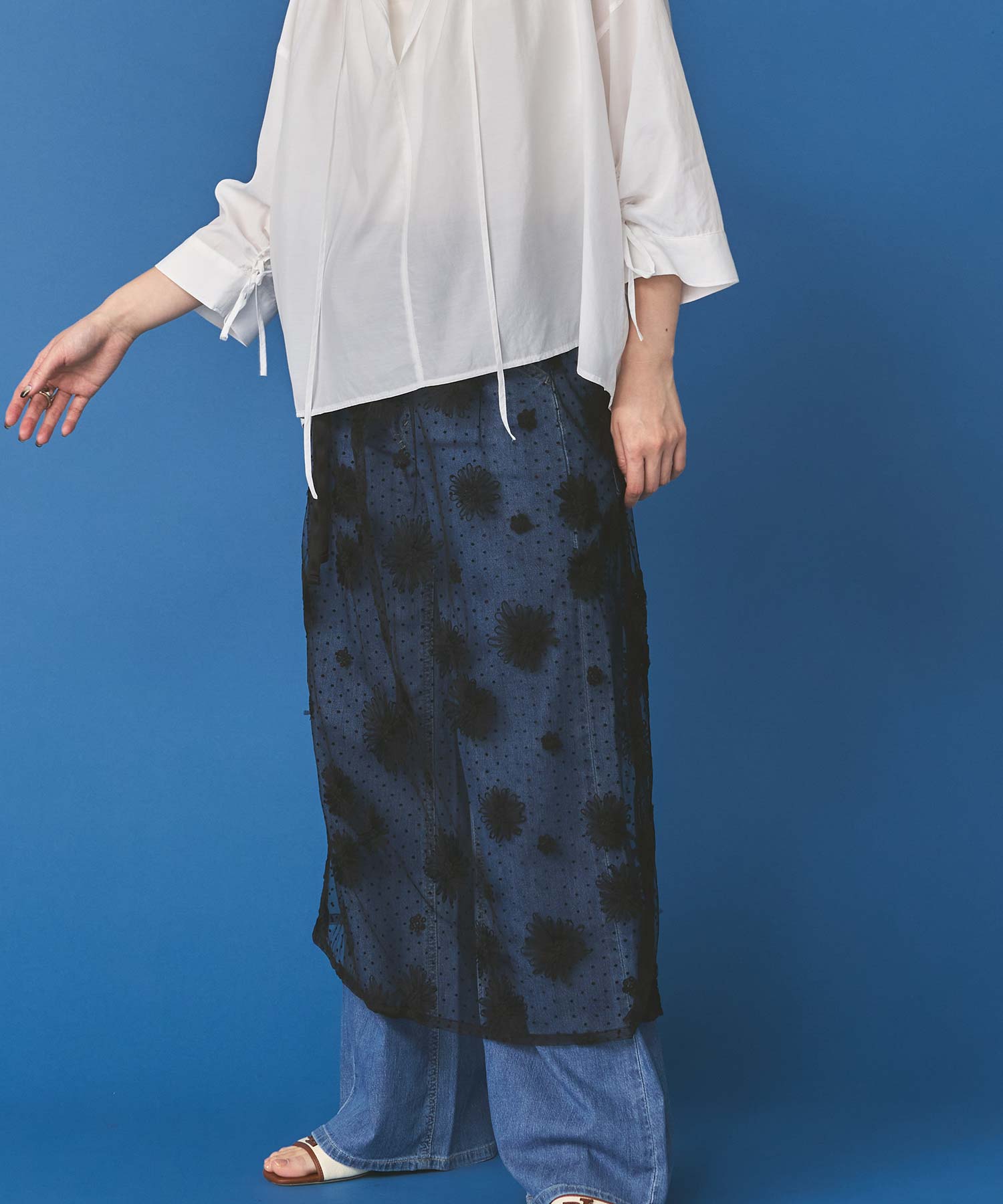 花柄ながら甘くなりすぎないチュール素材を使用し、軽やかで大人っぽい印象に仕上げました。