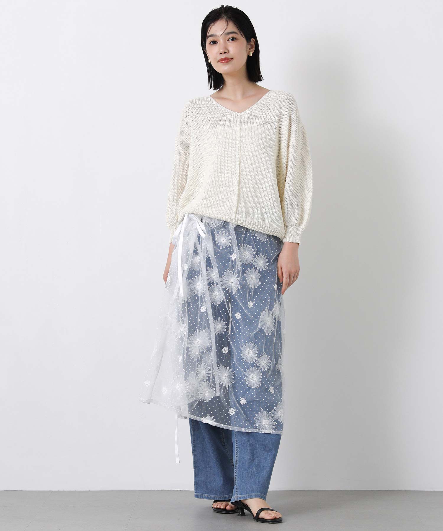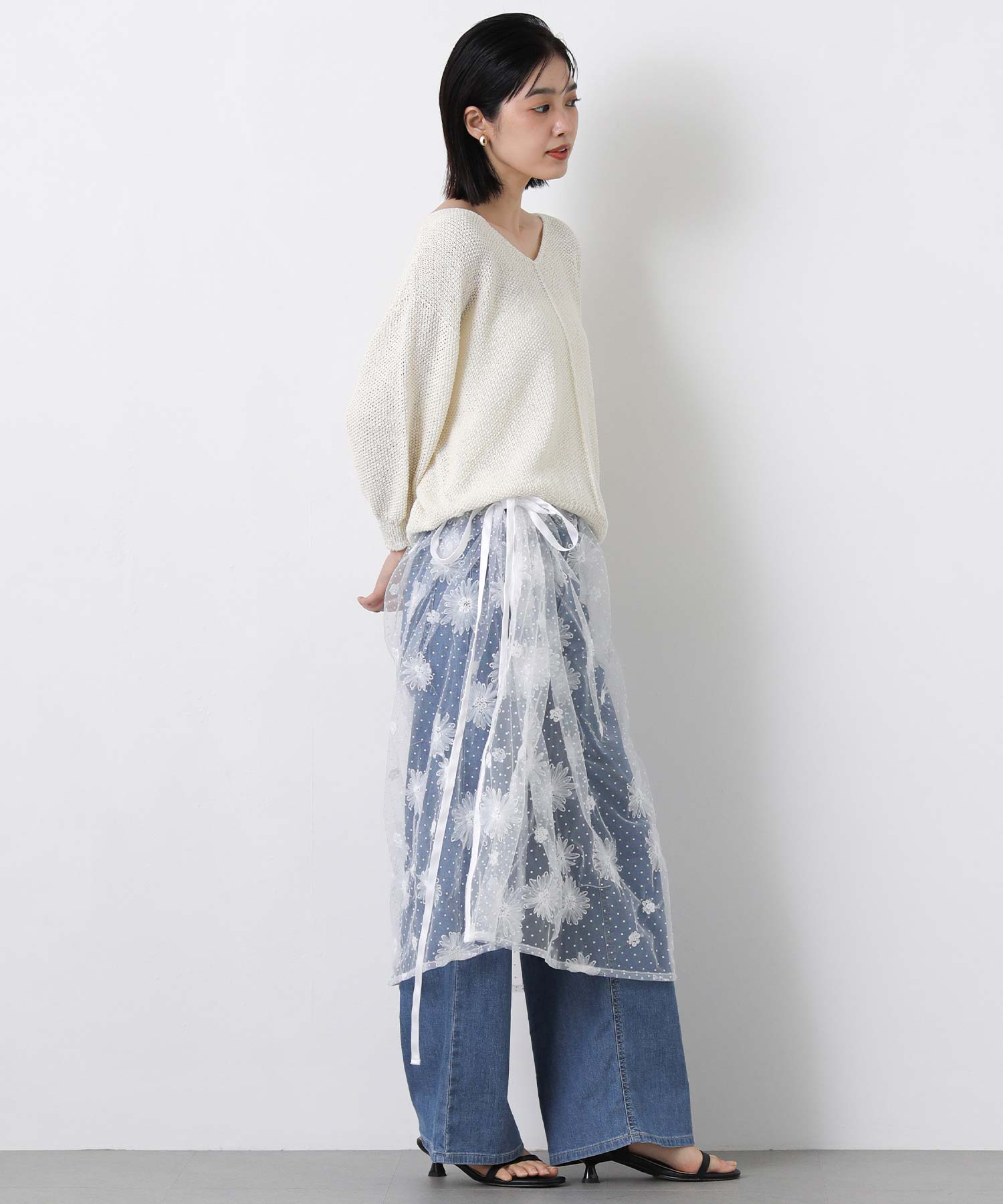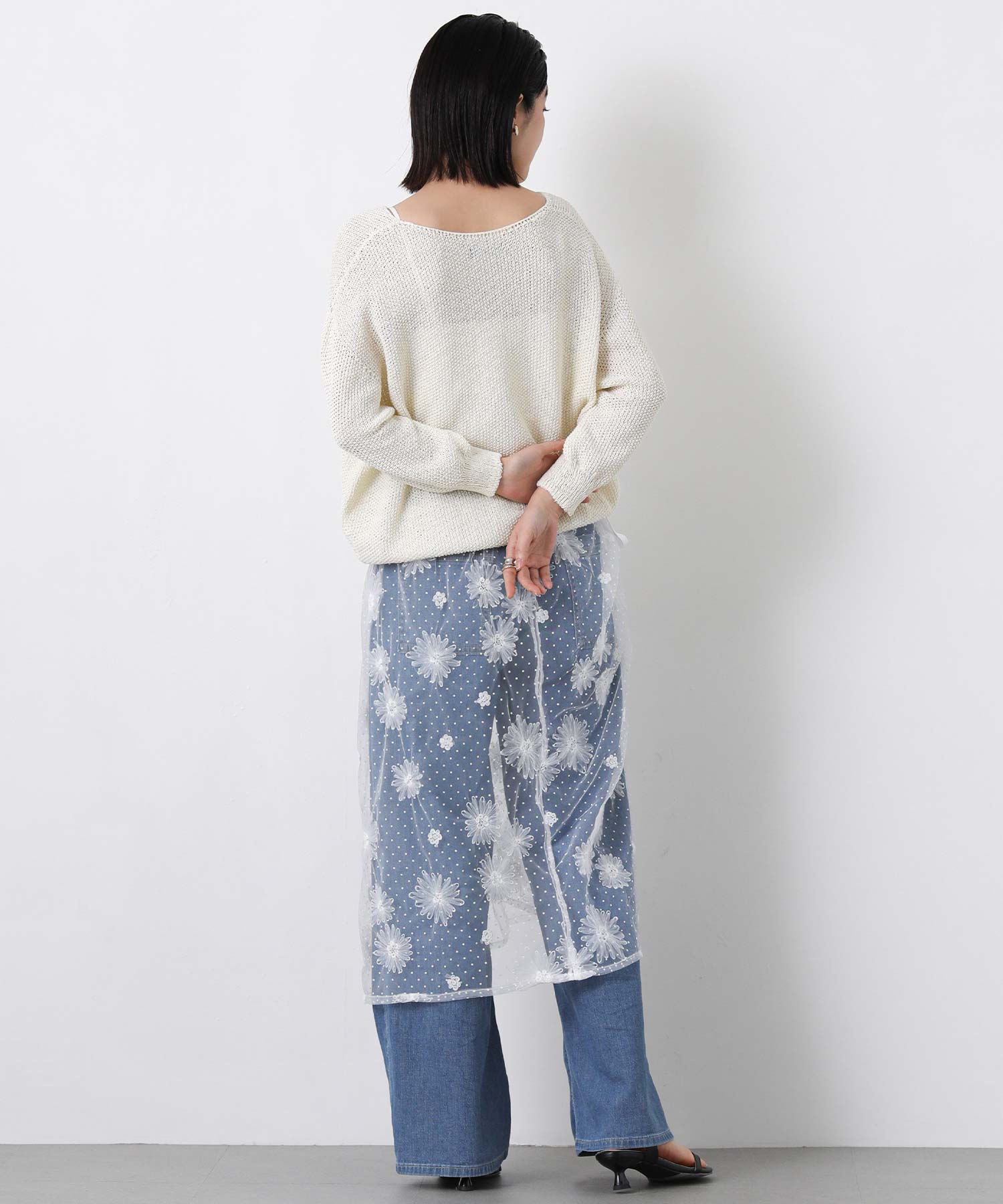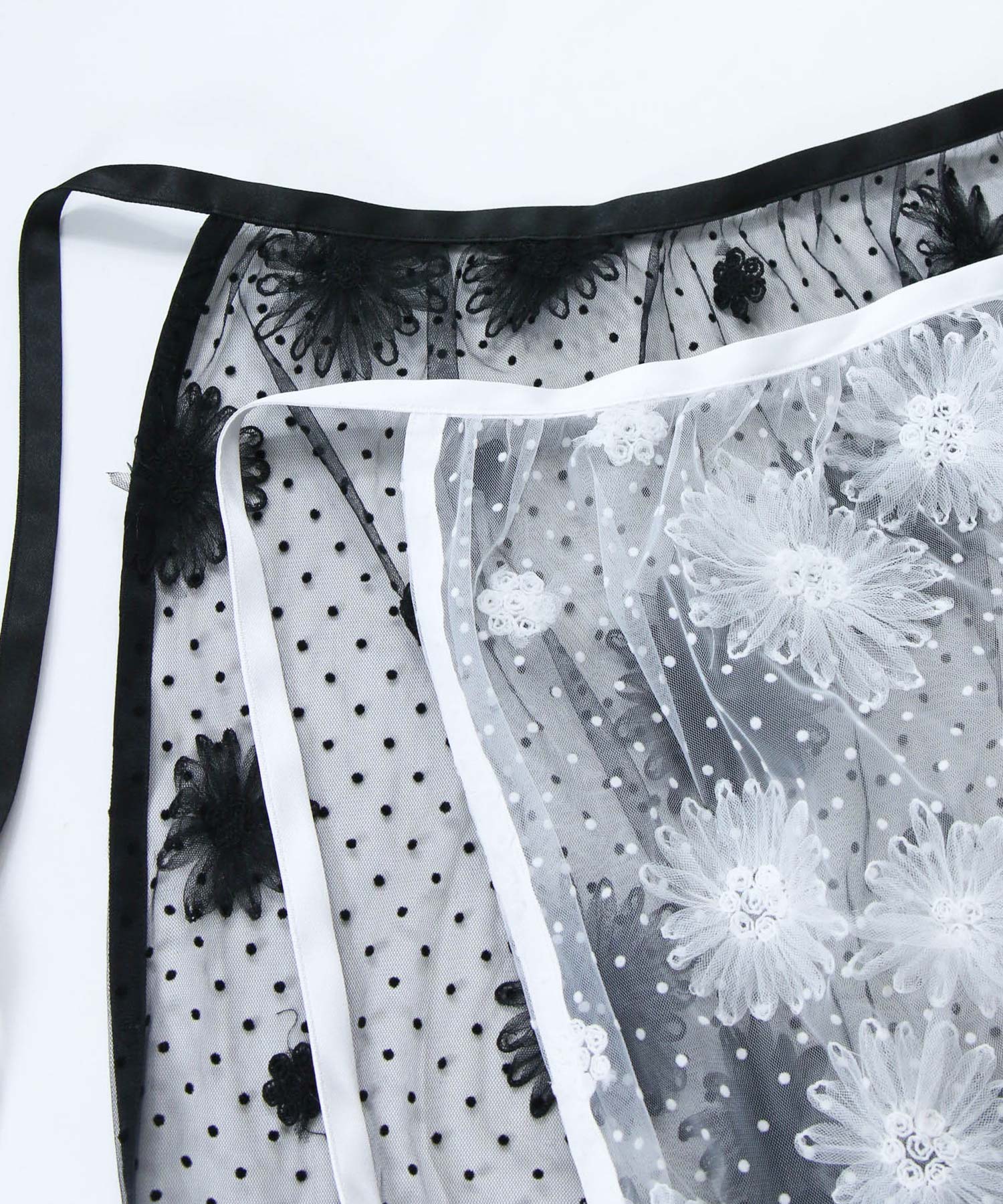 花柄ながら甘くなりすぎないチュール素材を使用し、軽やかで大人っぽい印象に仕上げました。