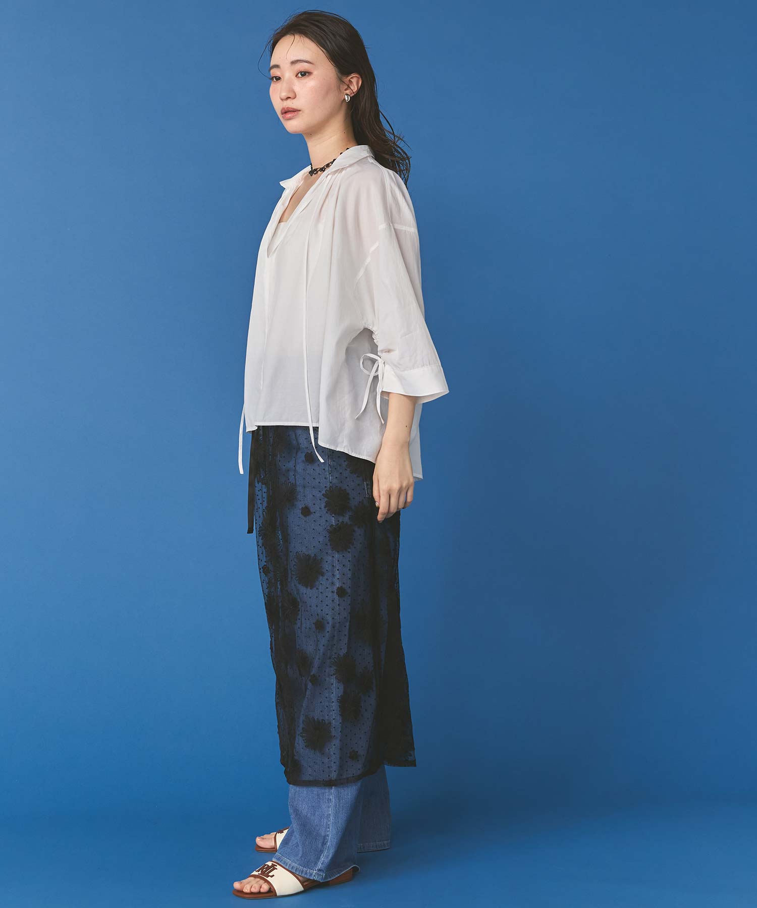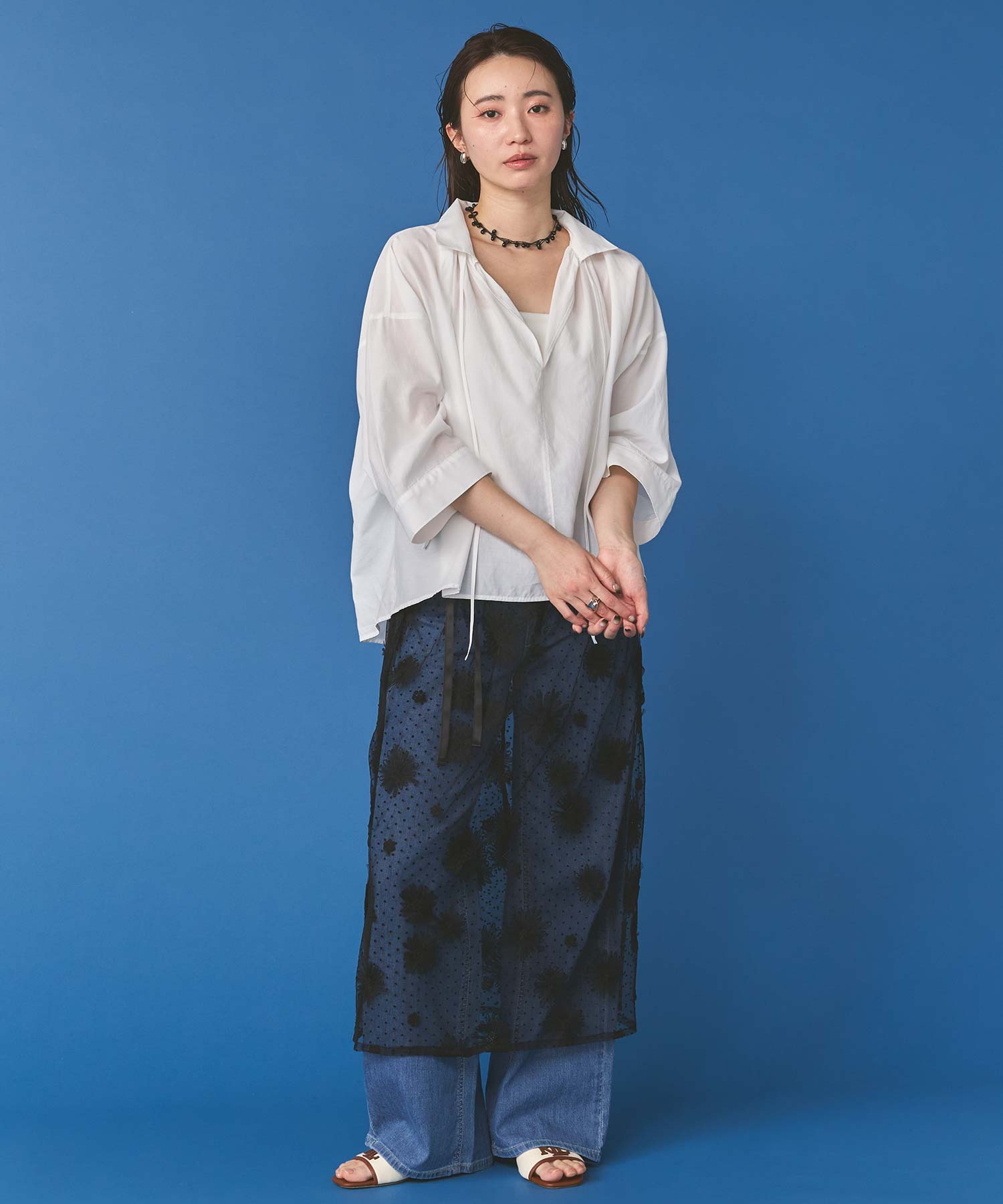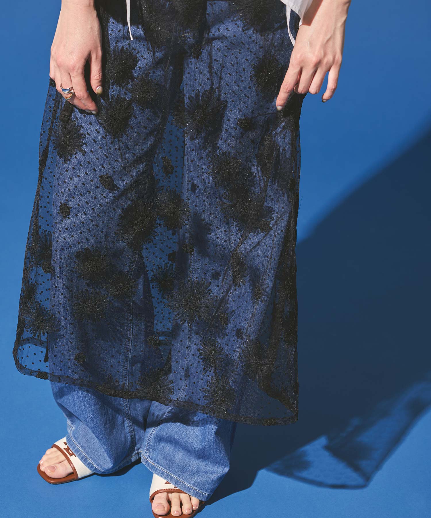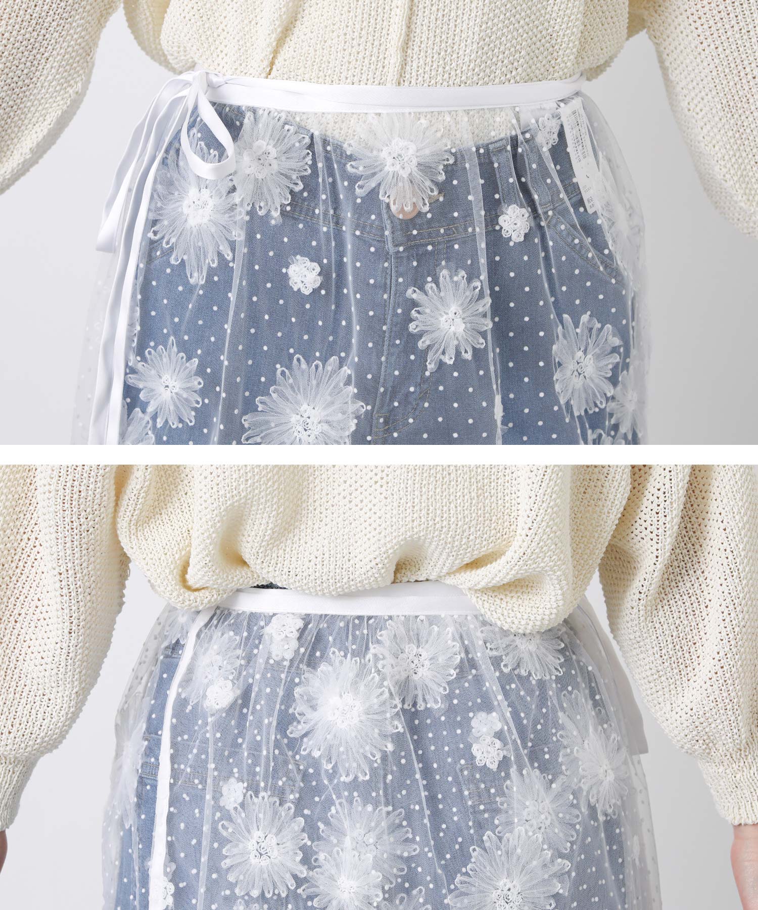 花柄ながら甘くなりすぎないチュール素材を使用し、軽やかで大人っぽい印象に仕上げました。