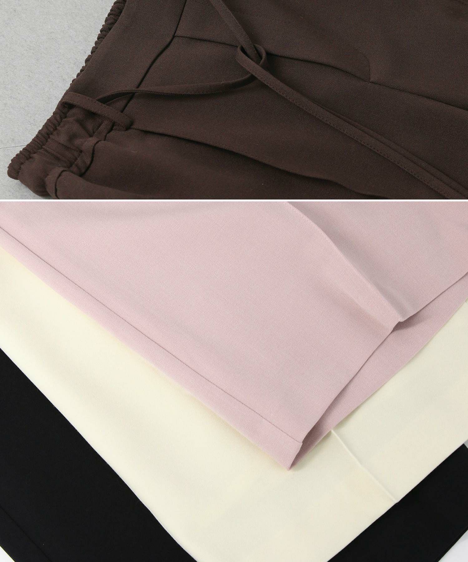 ウエストの細紐ベルトは外側からも内側からも調整できるので、コーデに合わせてアレンジしてください。