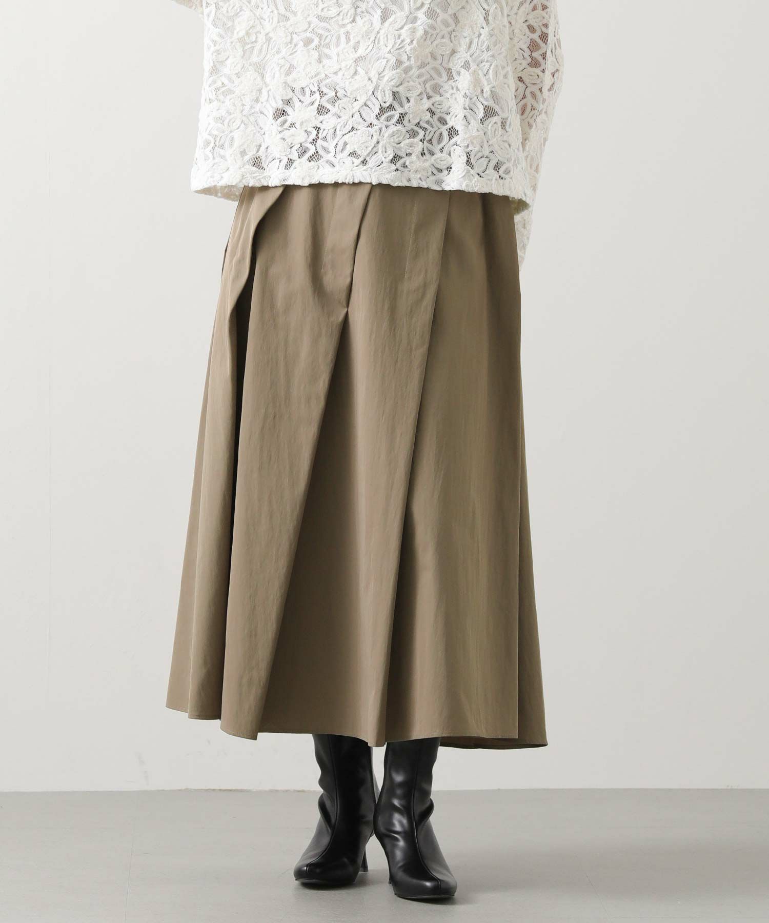 斜めに入ったタックが、ドラマティックなアシメラインを作るスカート。