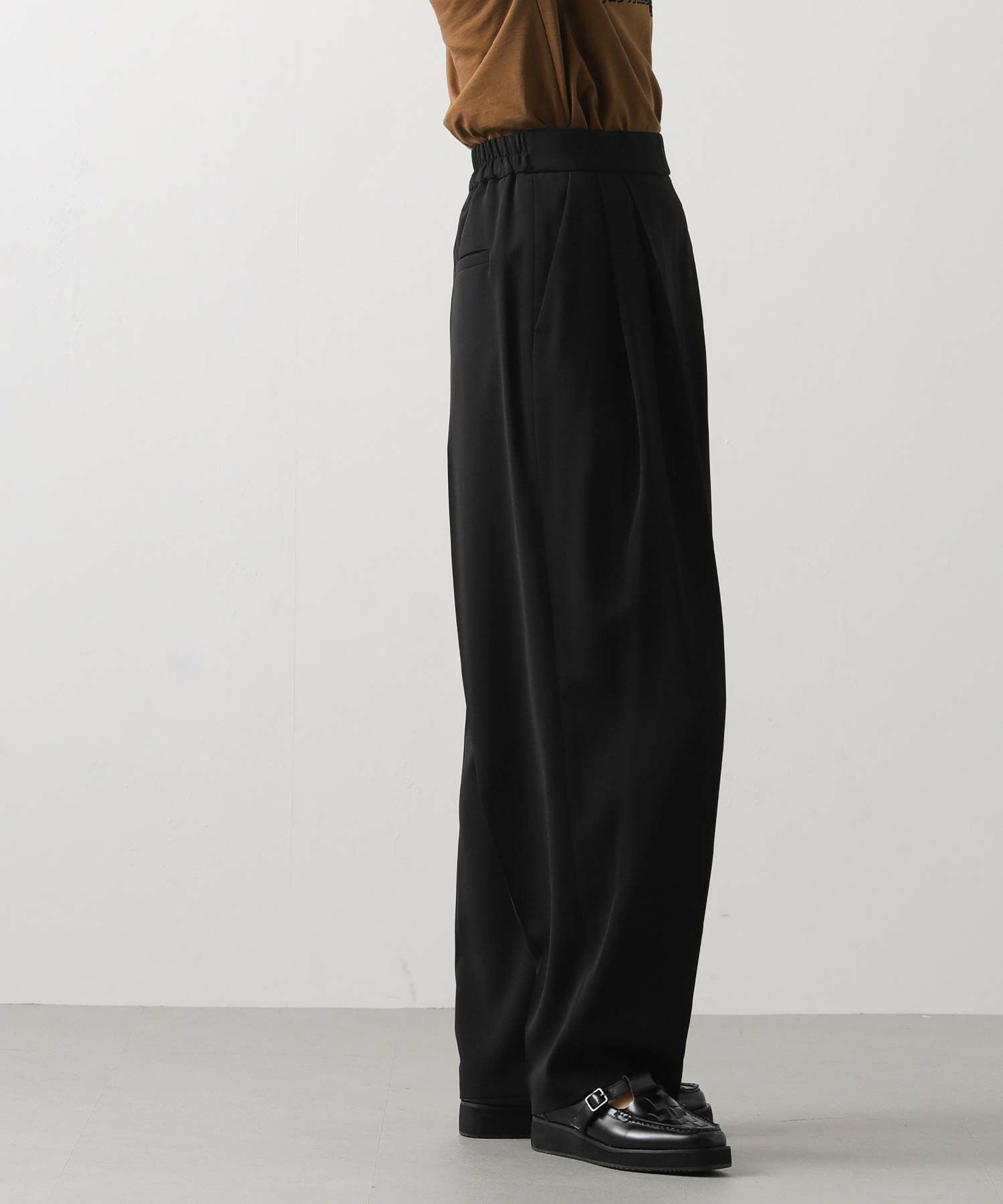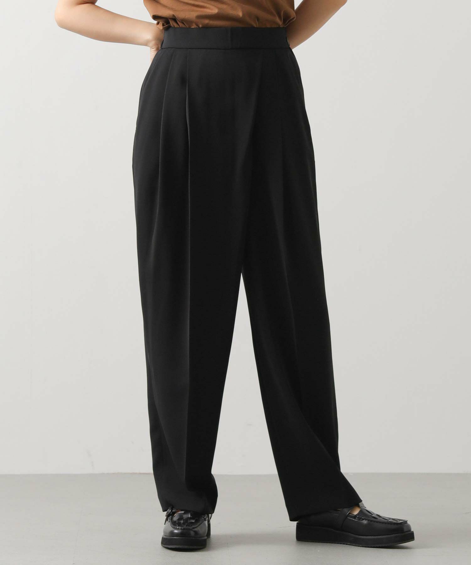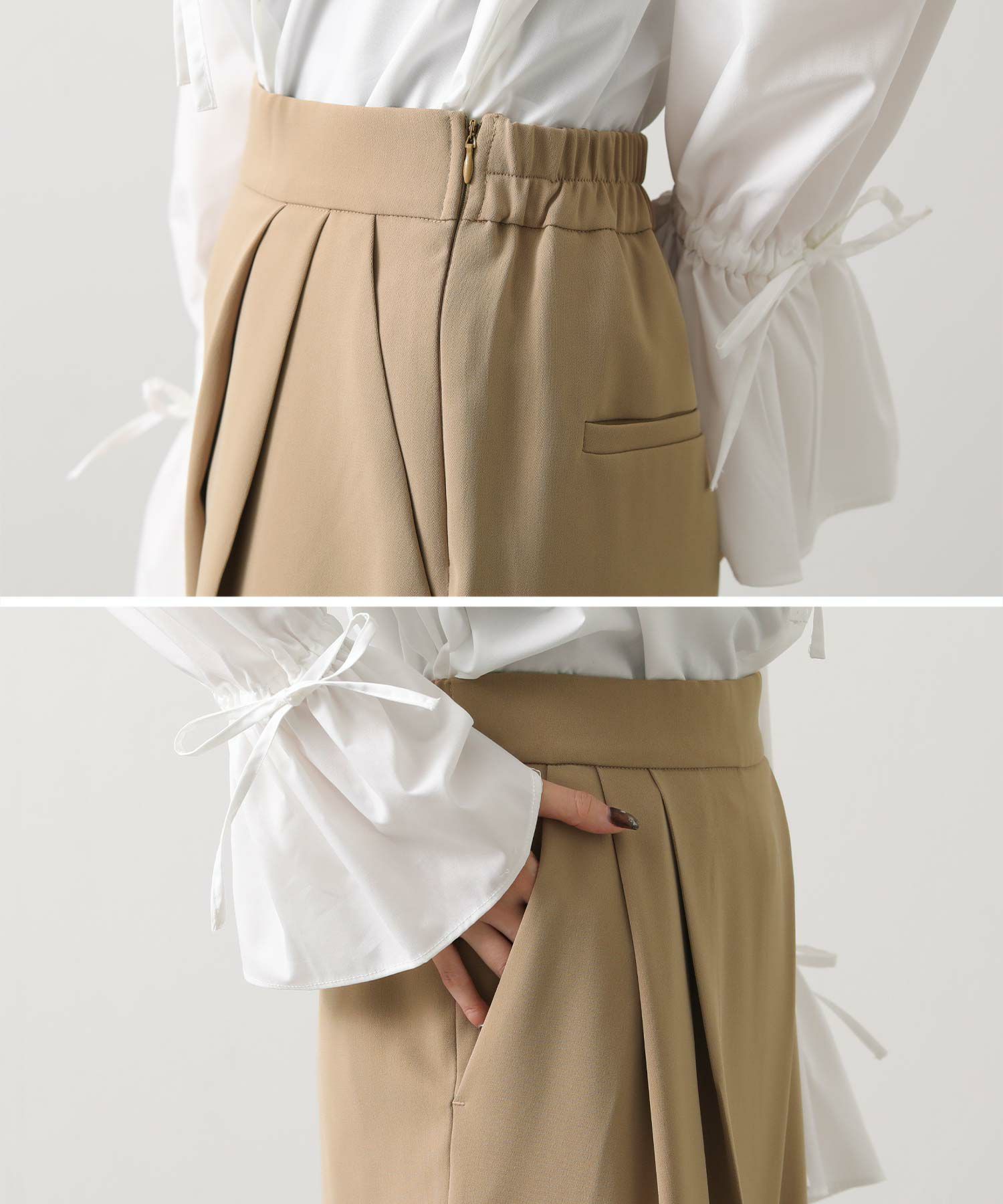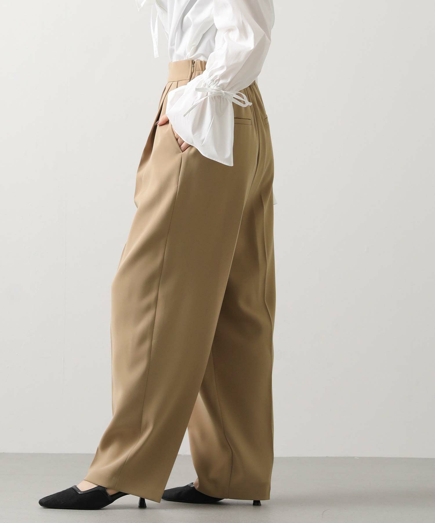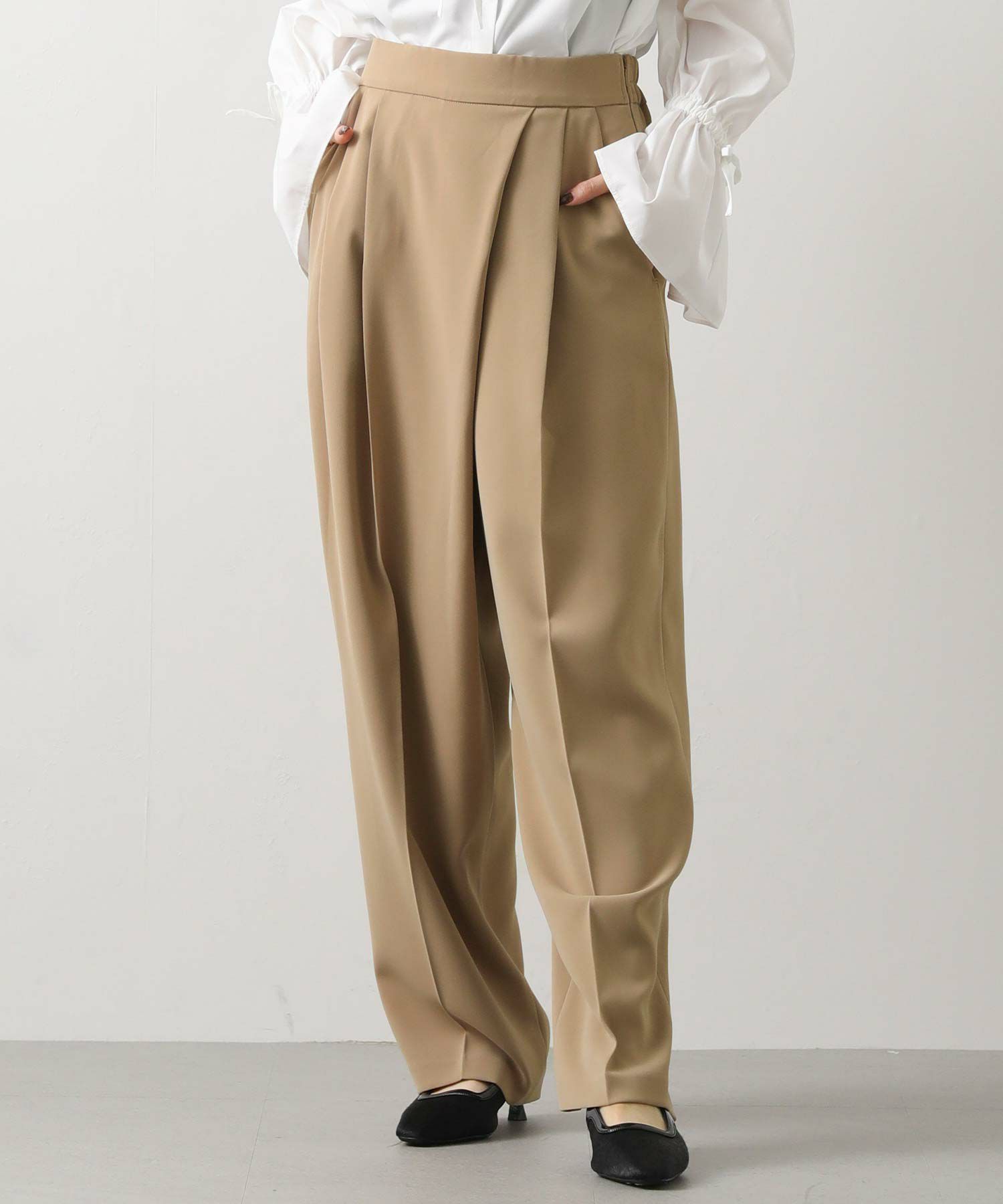 アシメのタックデザインが腰回りをカバーしてくれます。ふくらみととろみのある生地感で、シワになりにくくオンオフ問わずに穿きやすい素材。