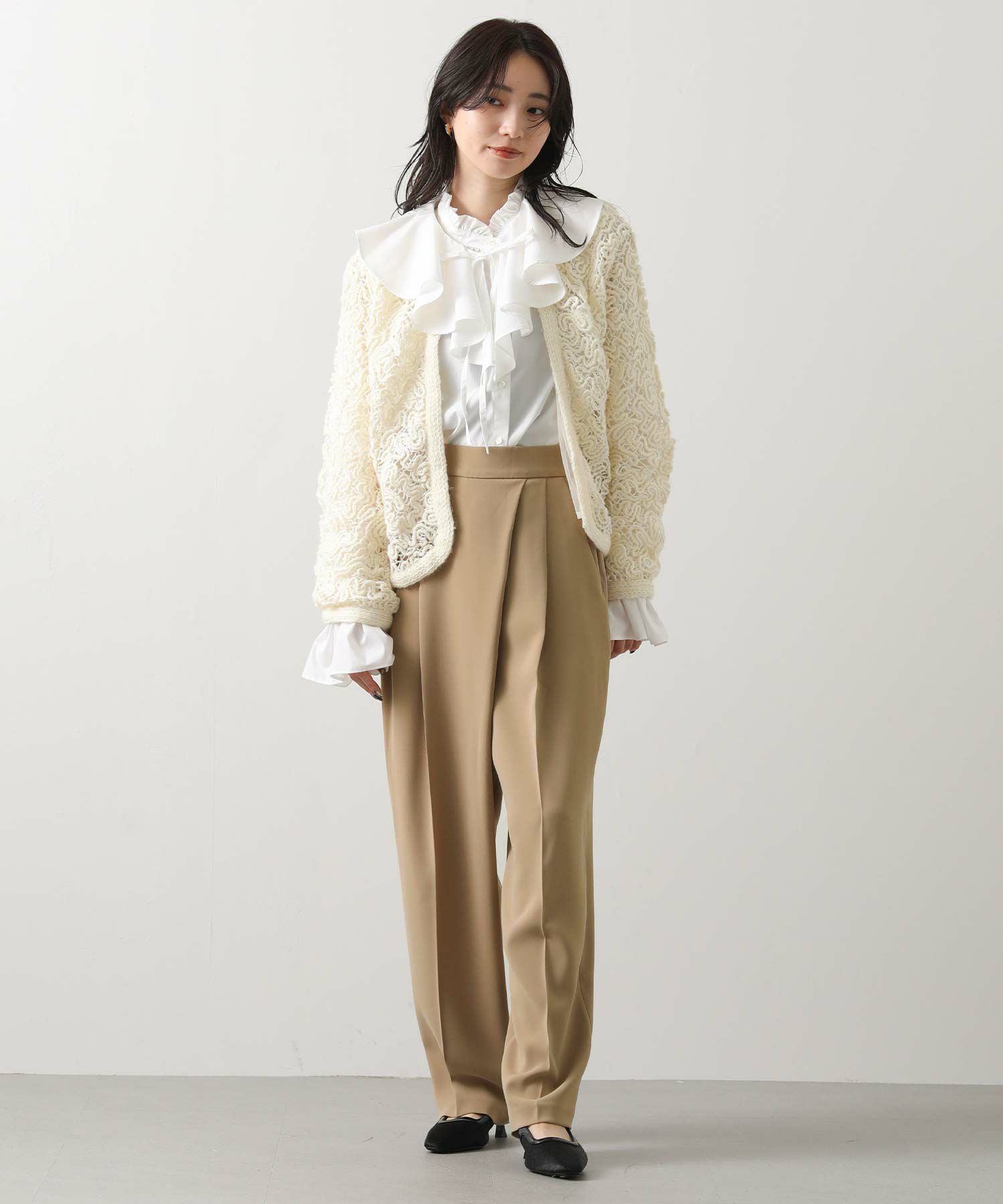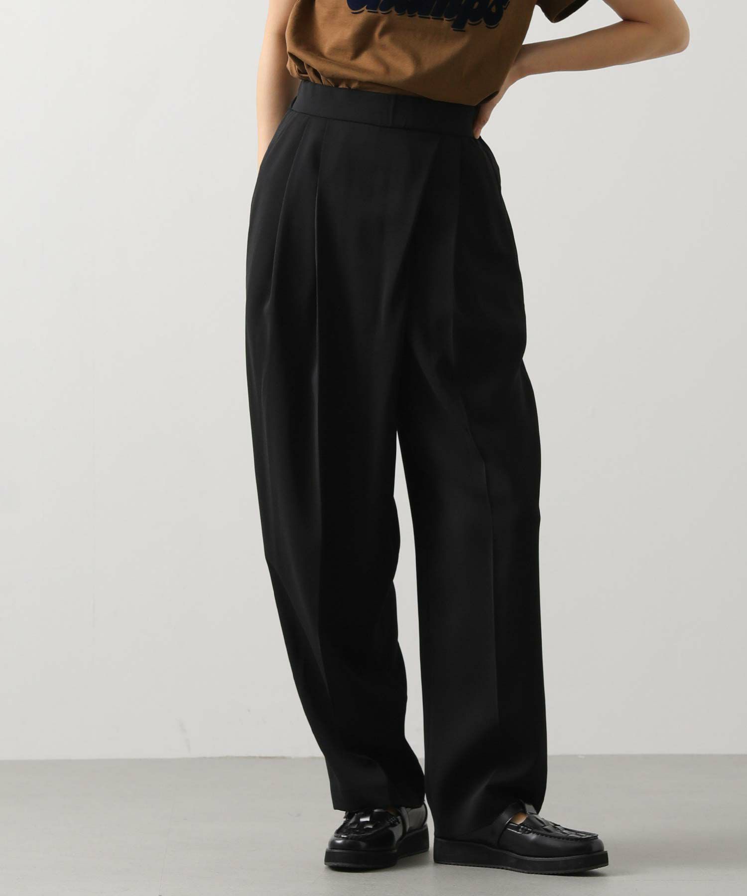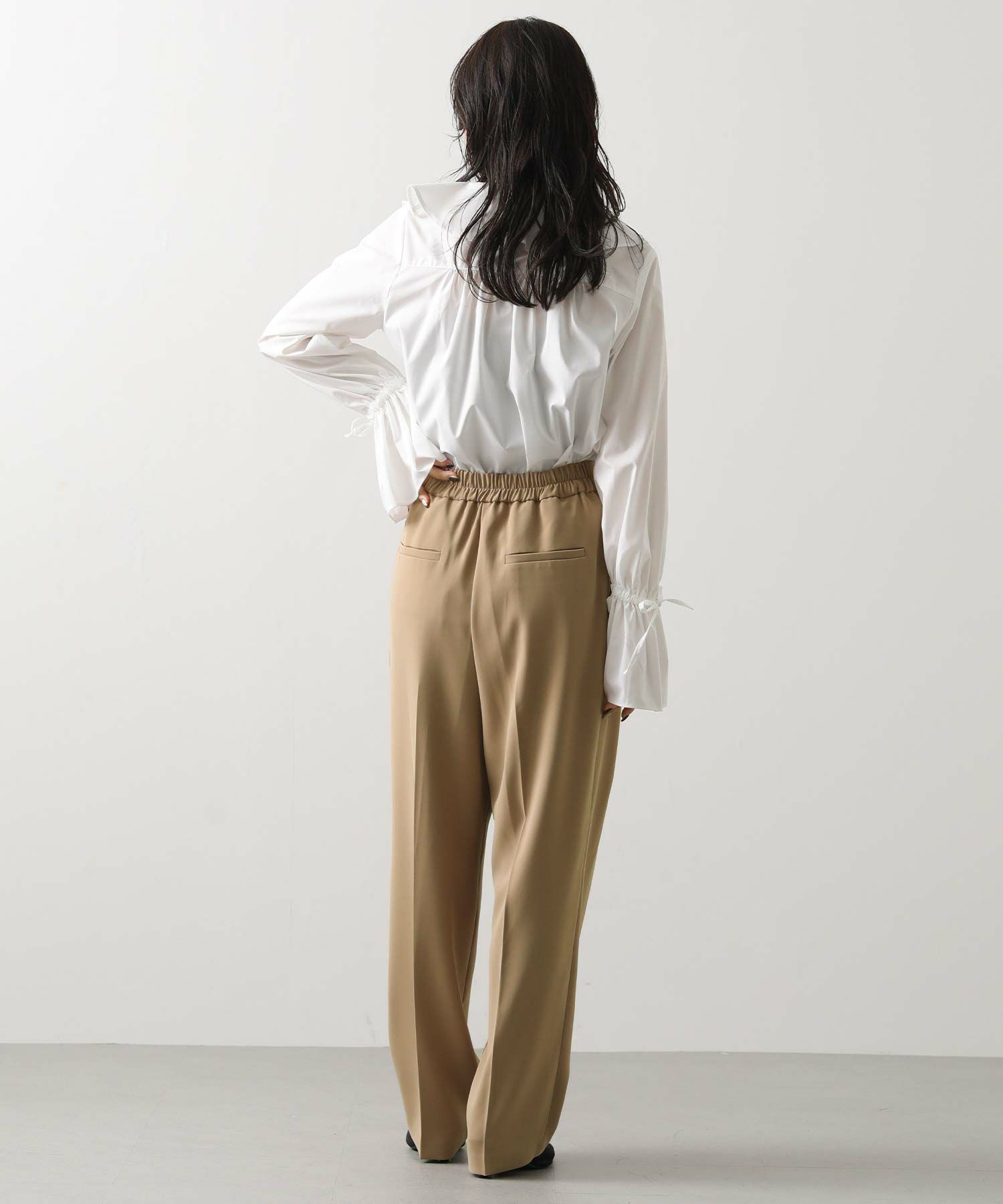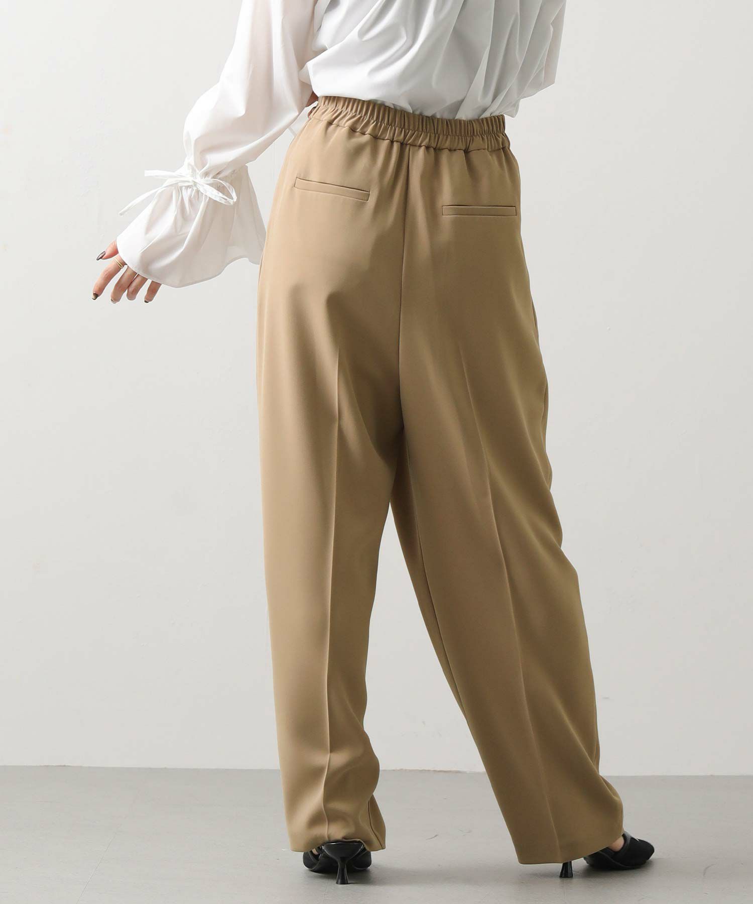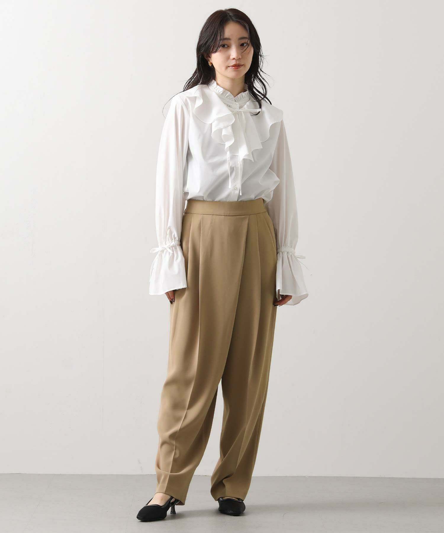 アシメのタックデザインが腰回りをカバーしてくれます。ふくらみととろみのある生地感で、シワになりにくくオンオフ問わずに穿きやすい素材。
