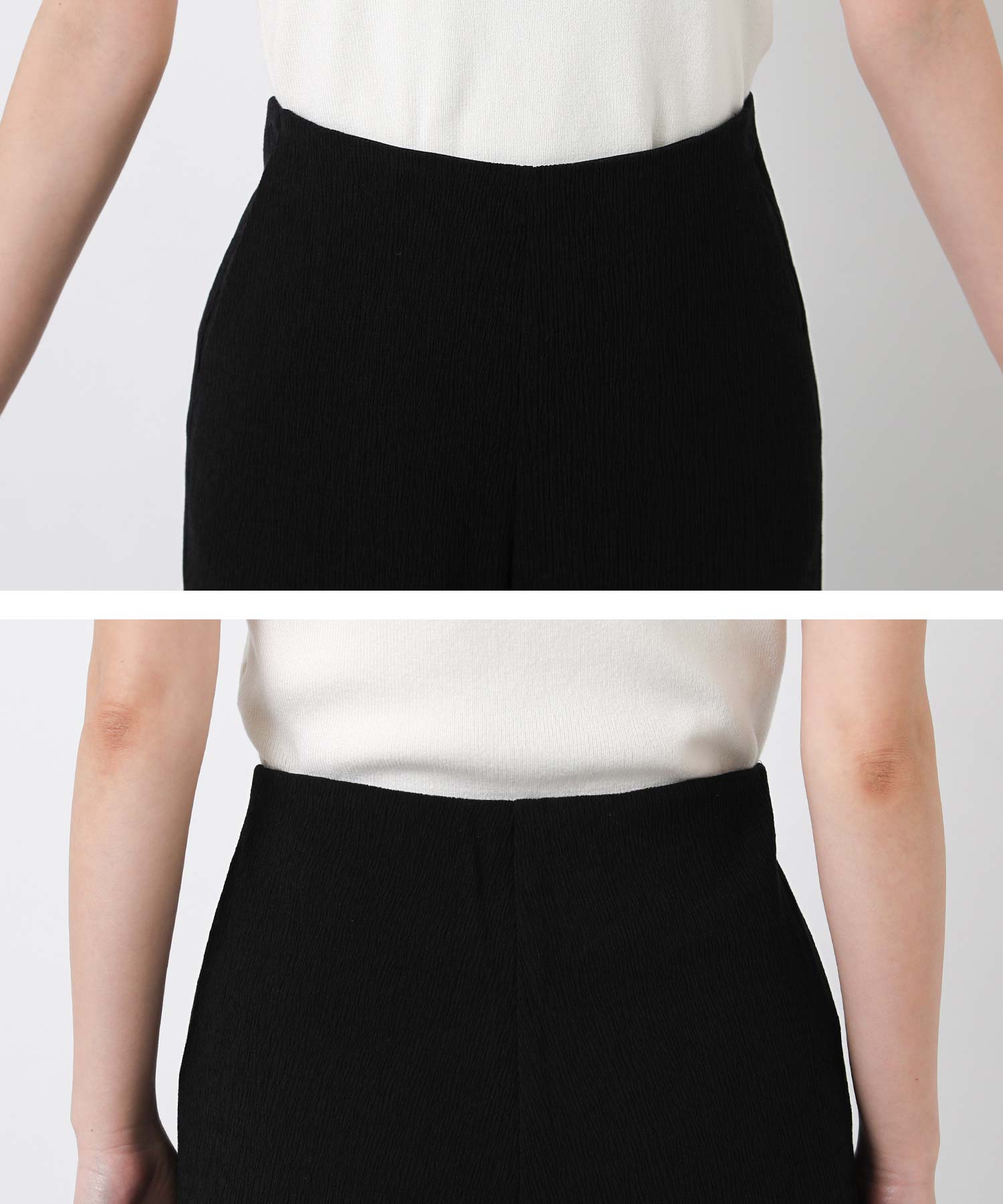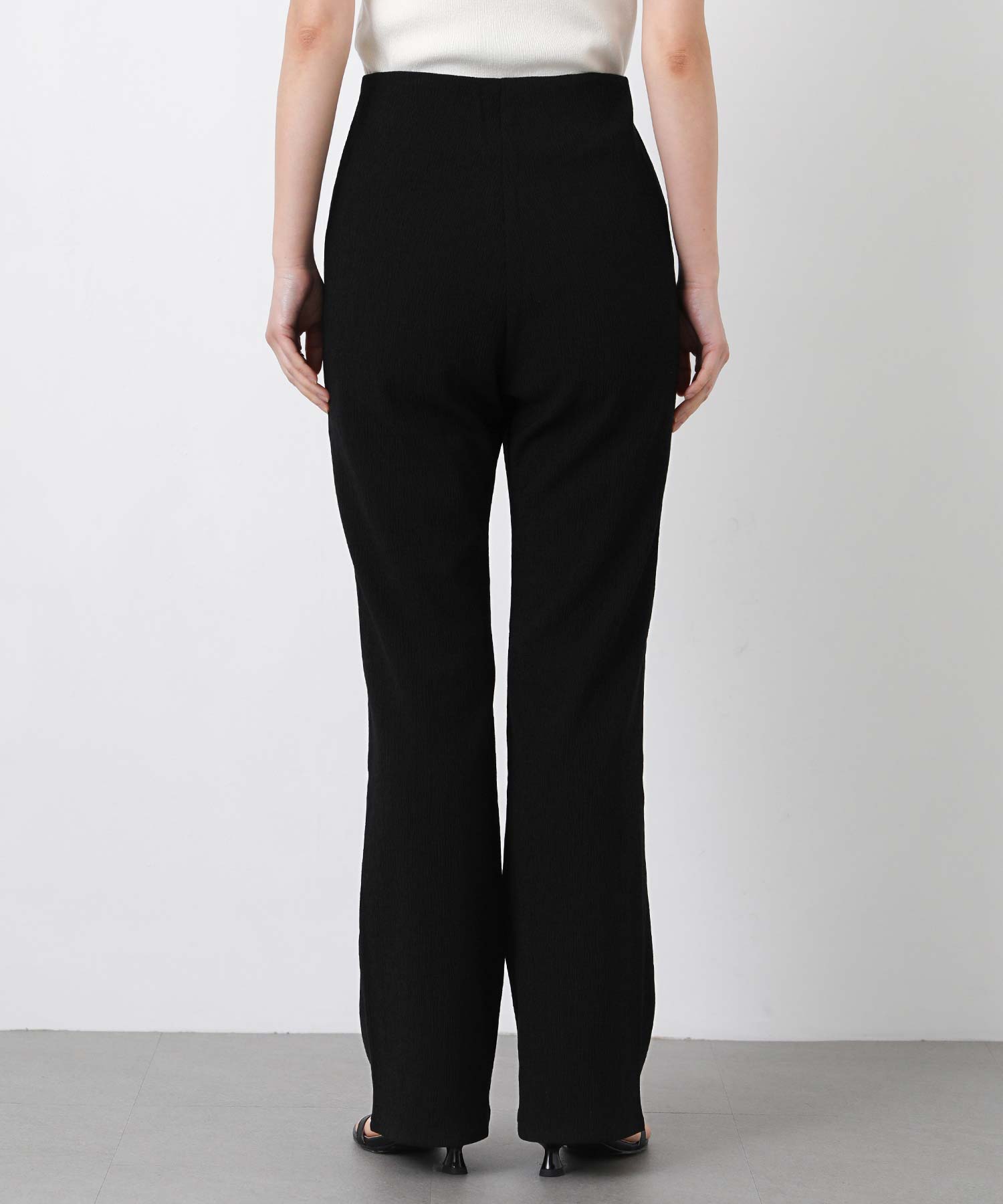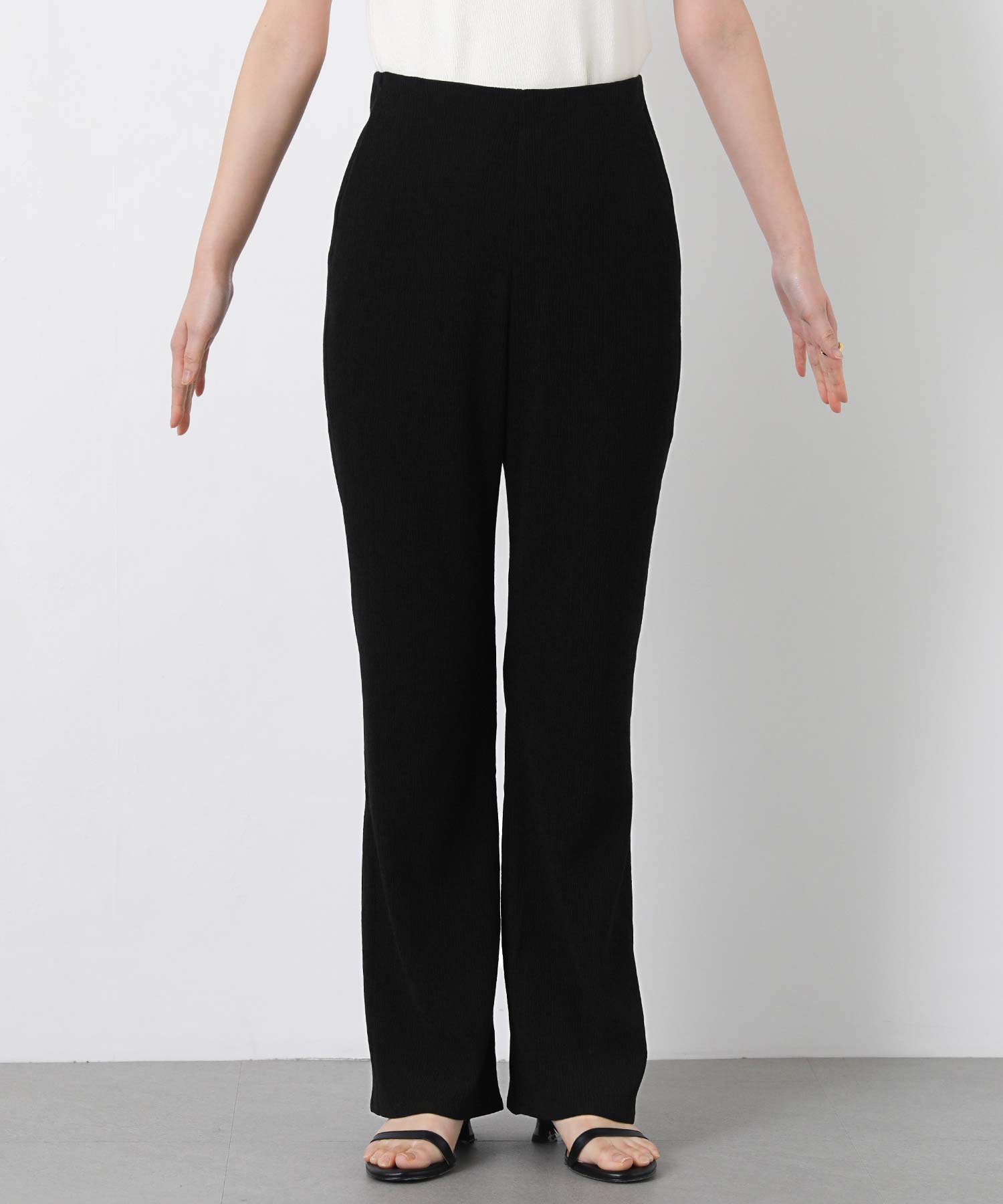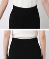 伸縮性に優れた素材と、ぐるりウエストゴムの楽な穿き心地ながら、すとんと落ちる美脚シルエット。