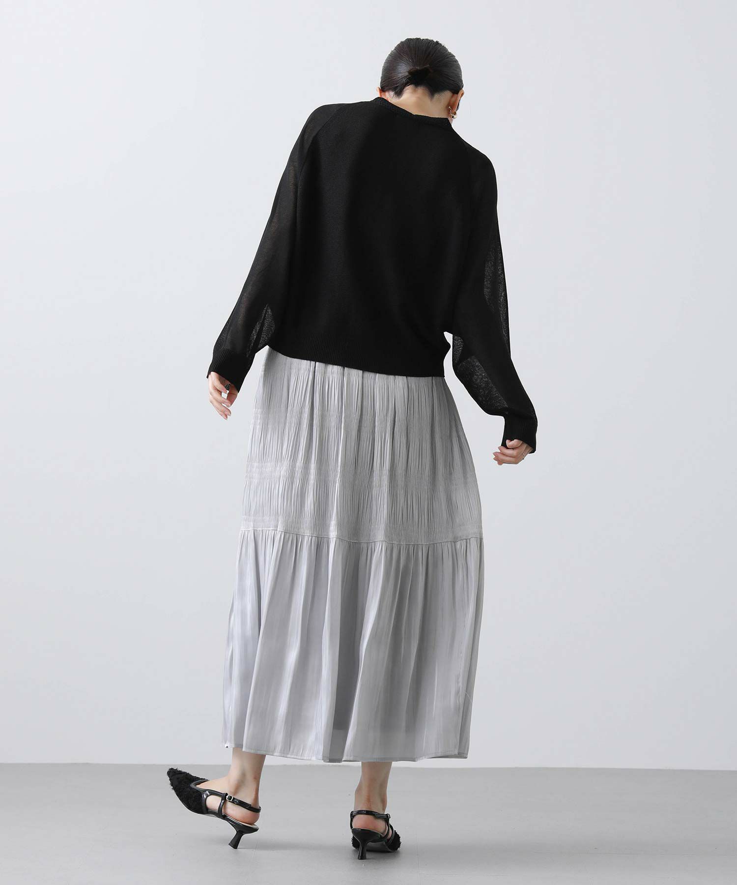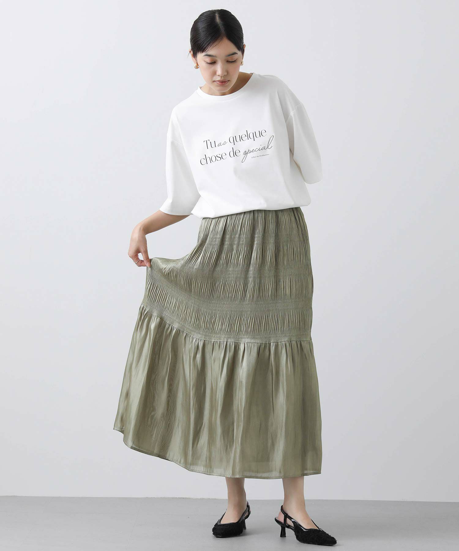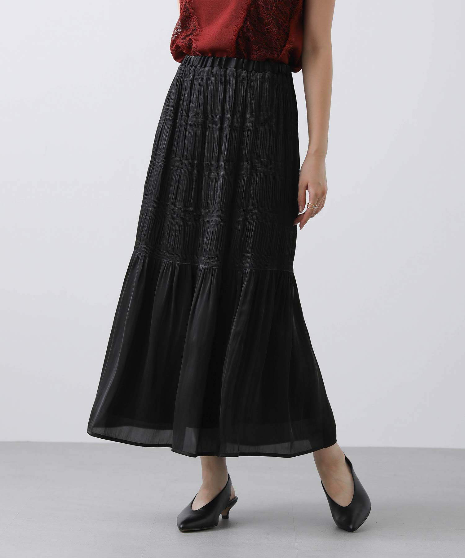 プリーツの幅に変化をつけてティアードのようなシルエットを作りだし、イージーな着心地ながらスッキリ見えするスカートです。