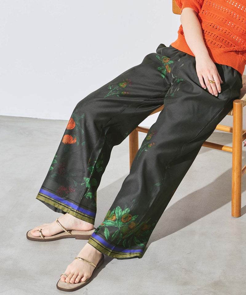 上品に仕上げたオリジナルのフラワープリントが印象的なワイドパンツ。