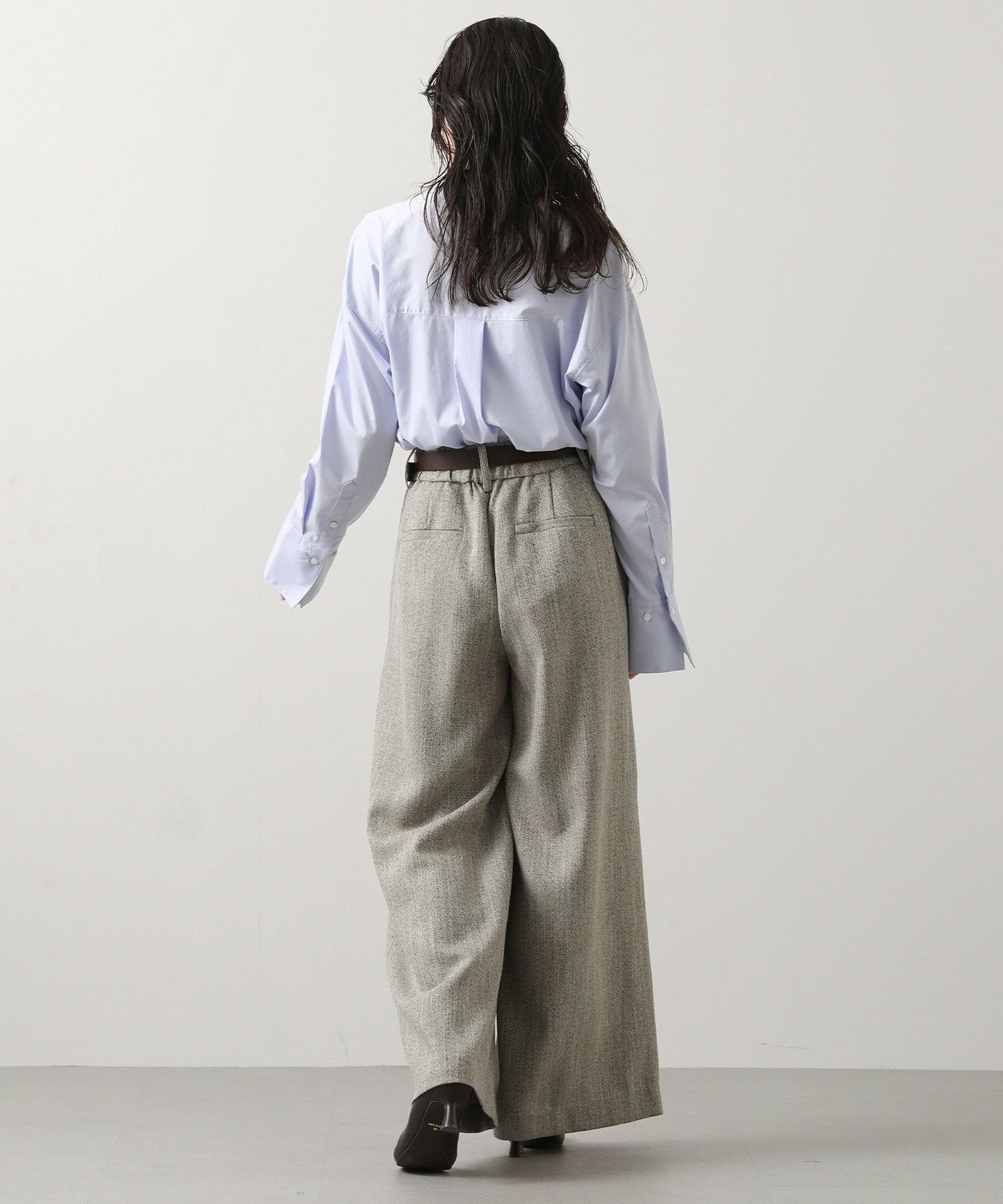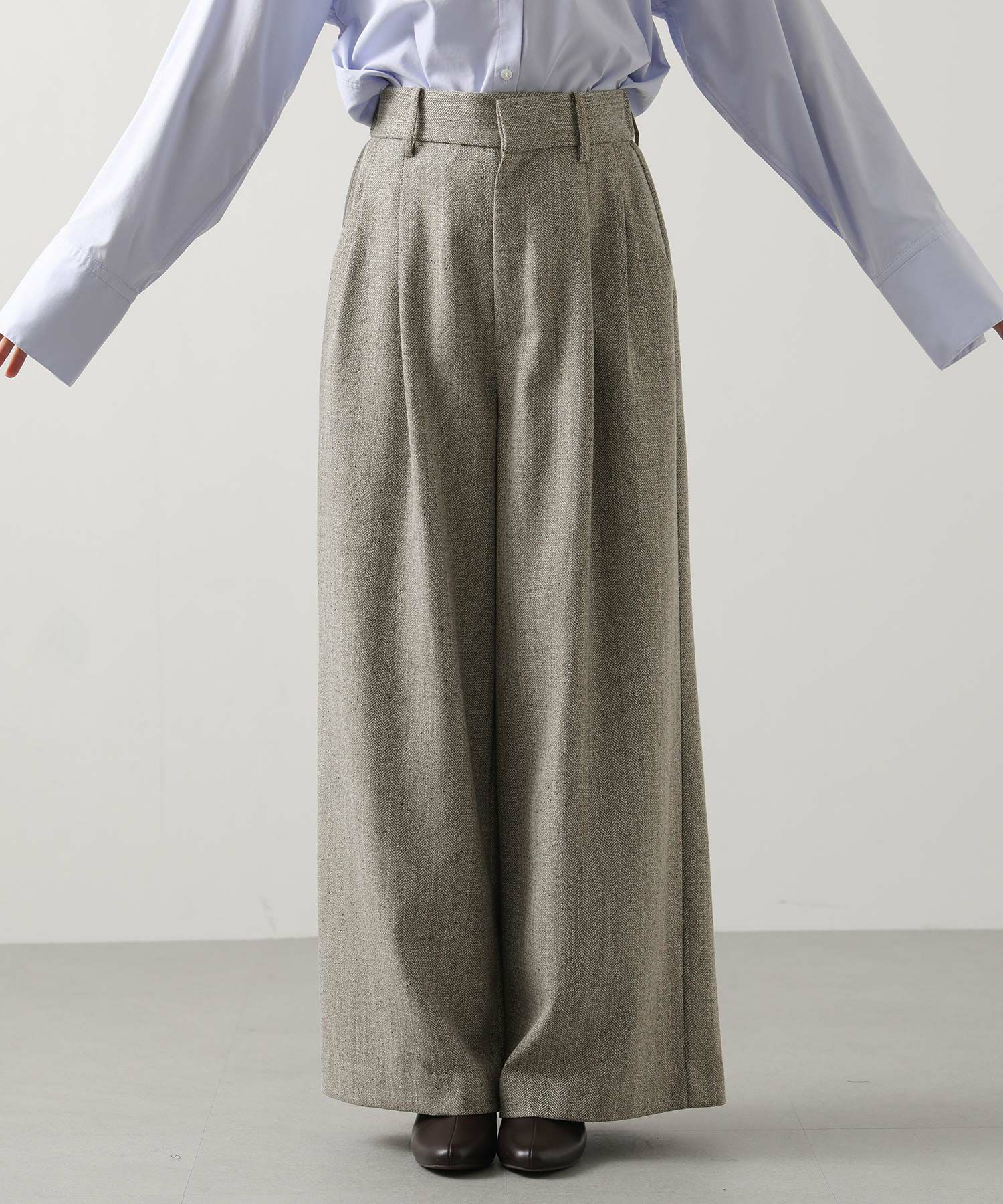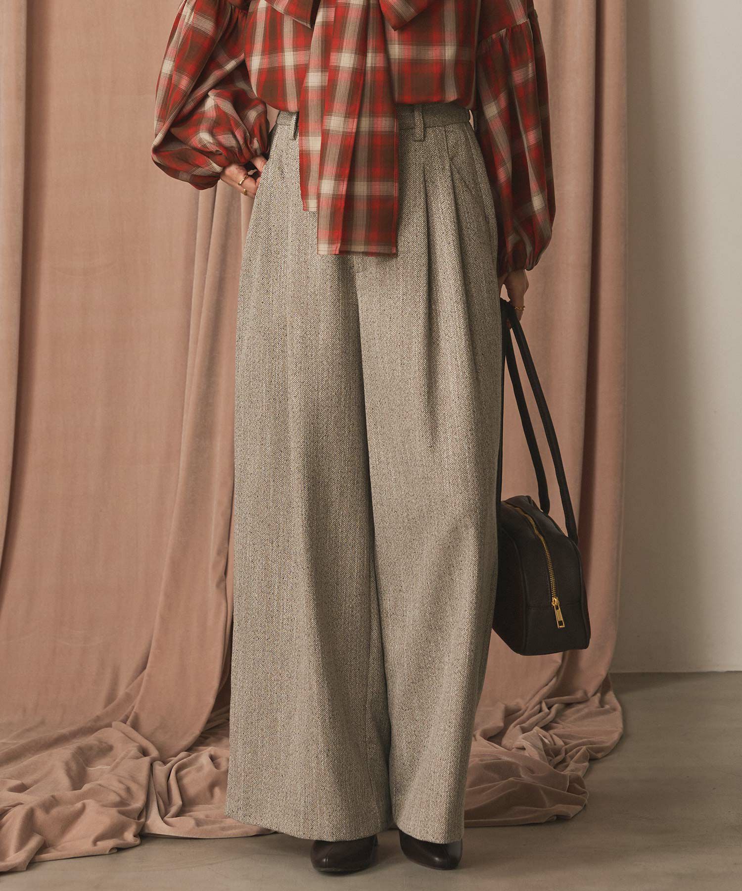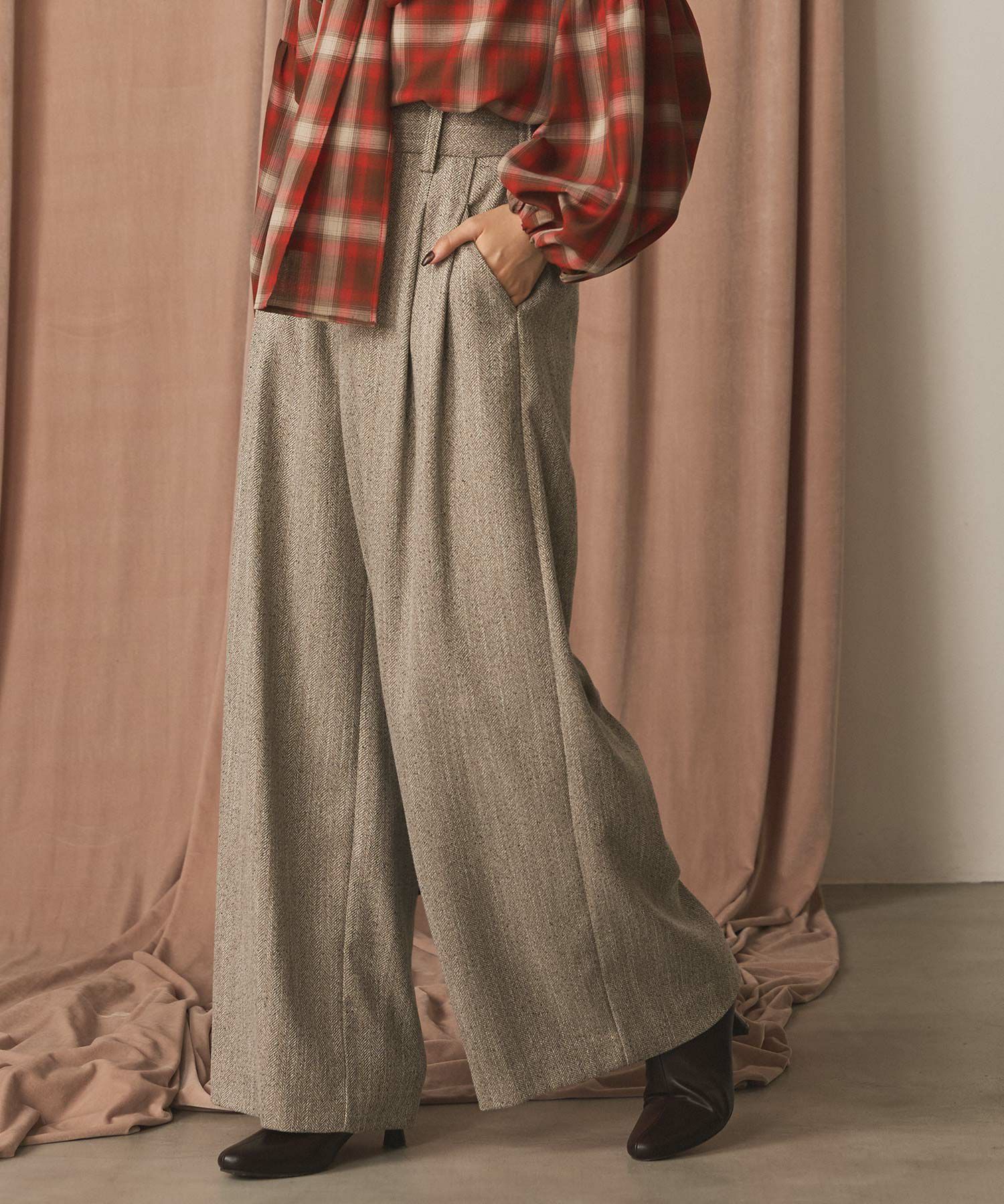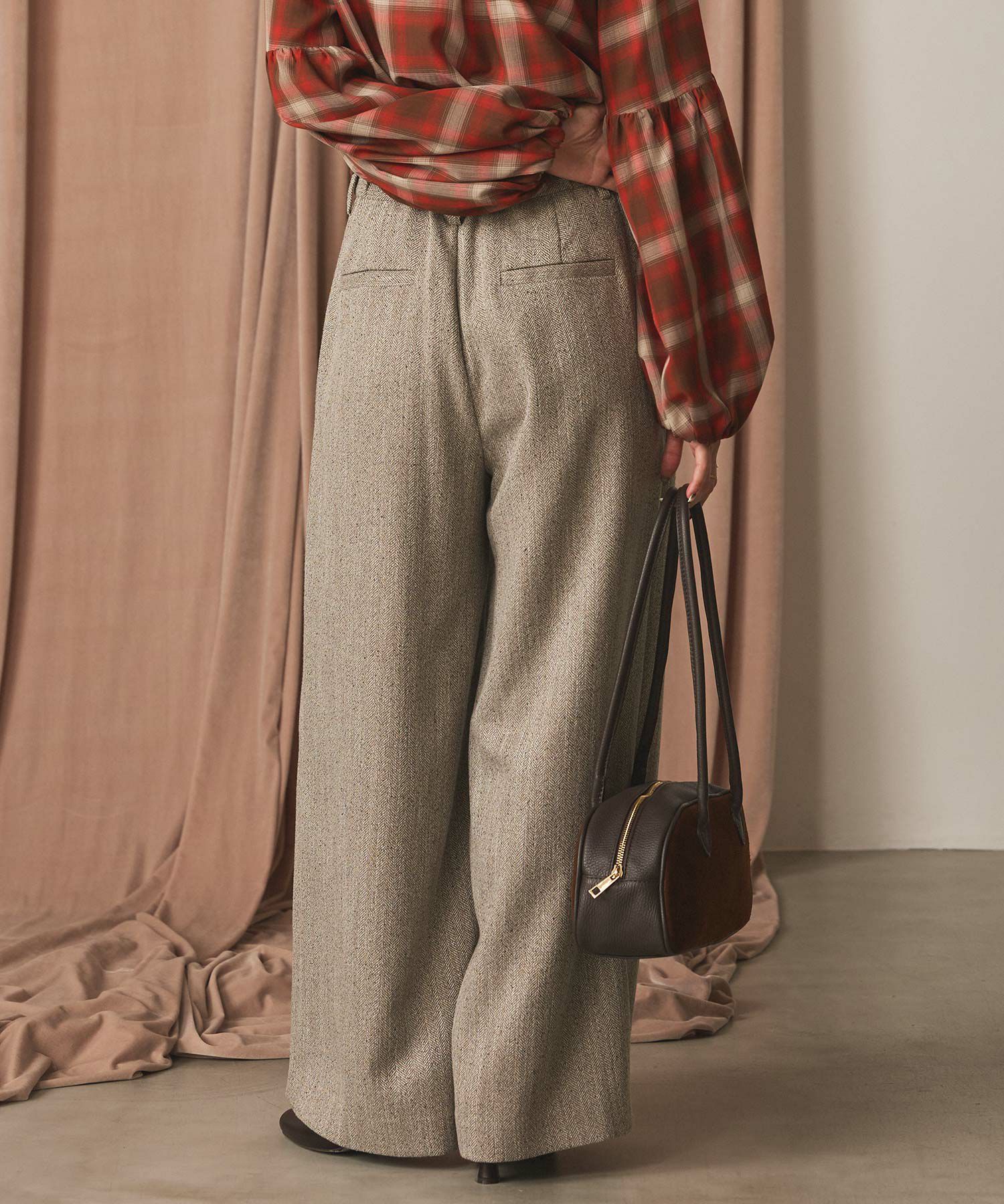 温かみのある表情が魅力的なヘリンボーン地柄のタックパンツ。