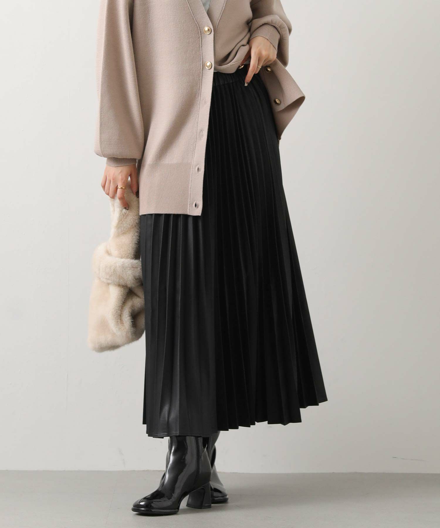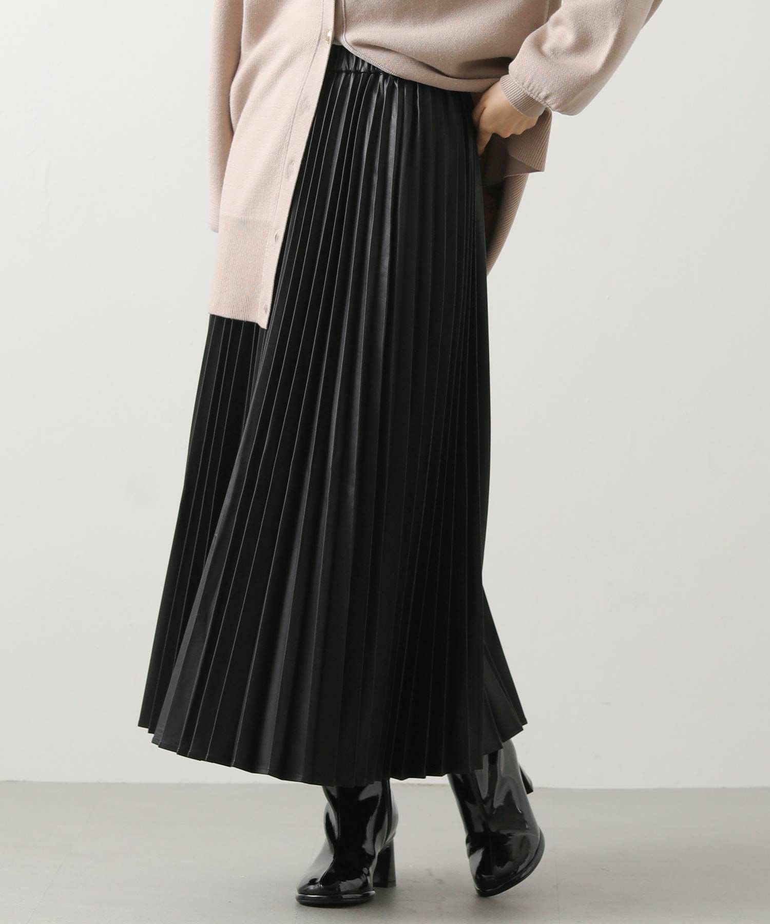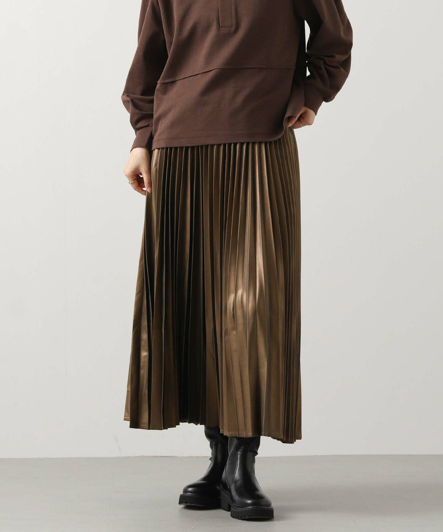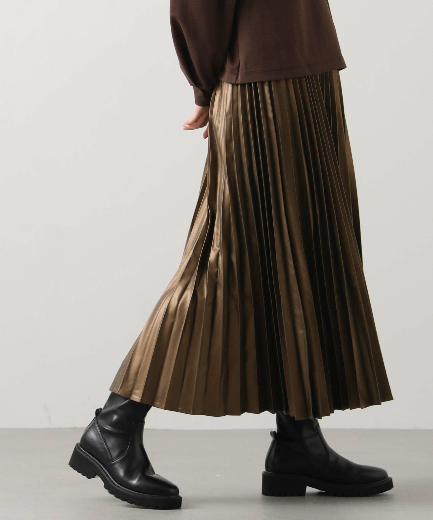 さり気ないツヤ感のあるフェクレザーのモードな雰囲気とプリーツの掛け合わせで、甘くなりがちなプリーツスカートをマニッシュにアップデート。