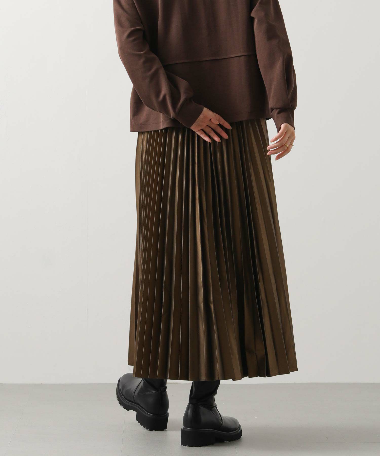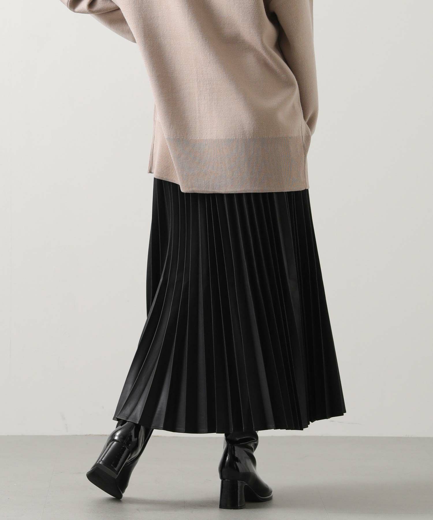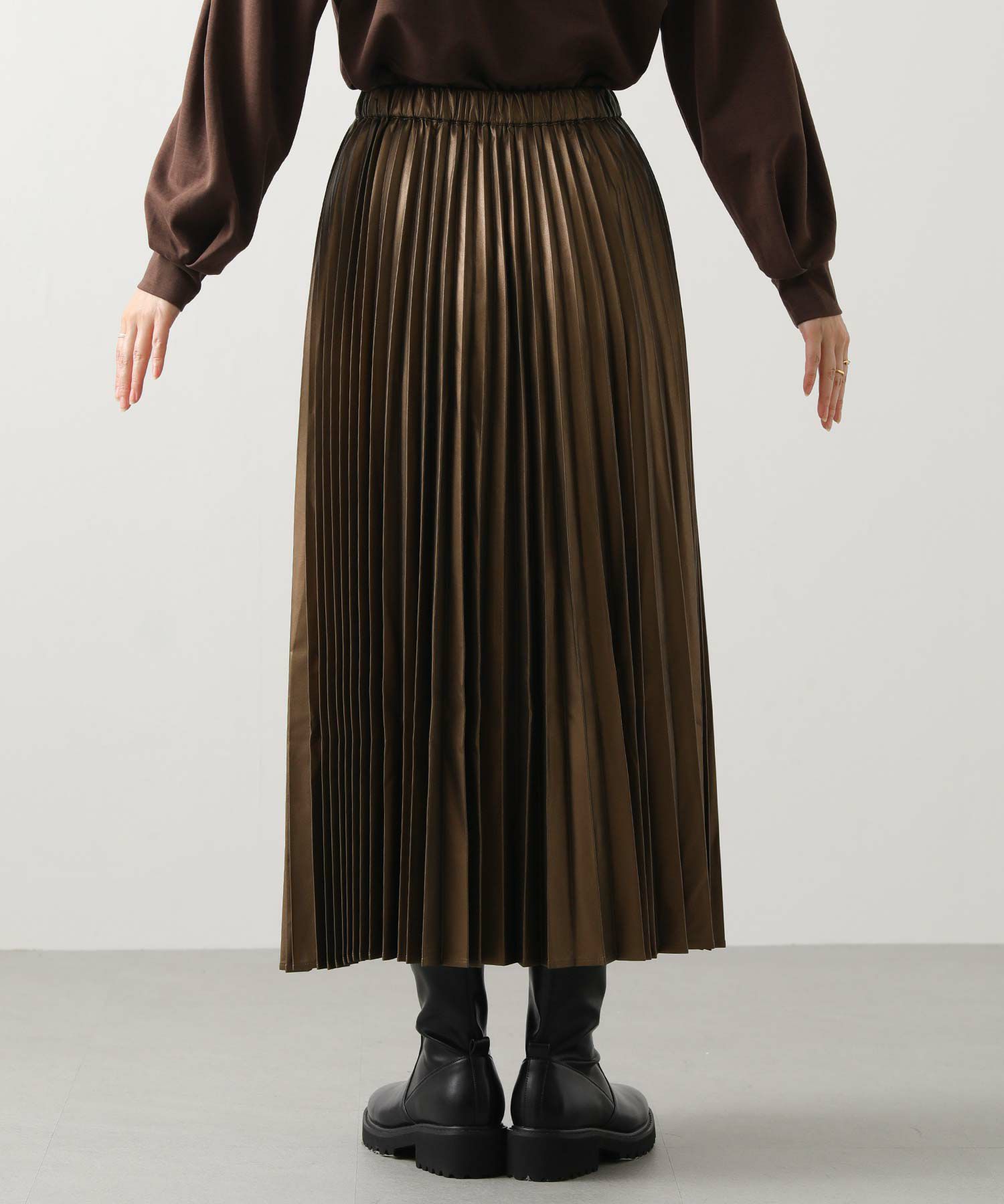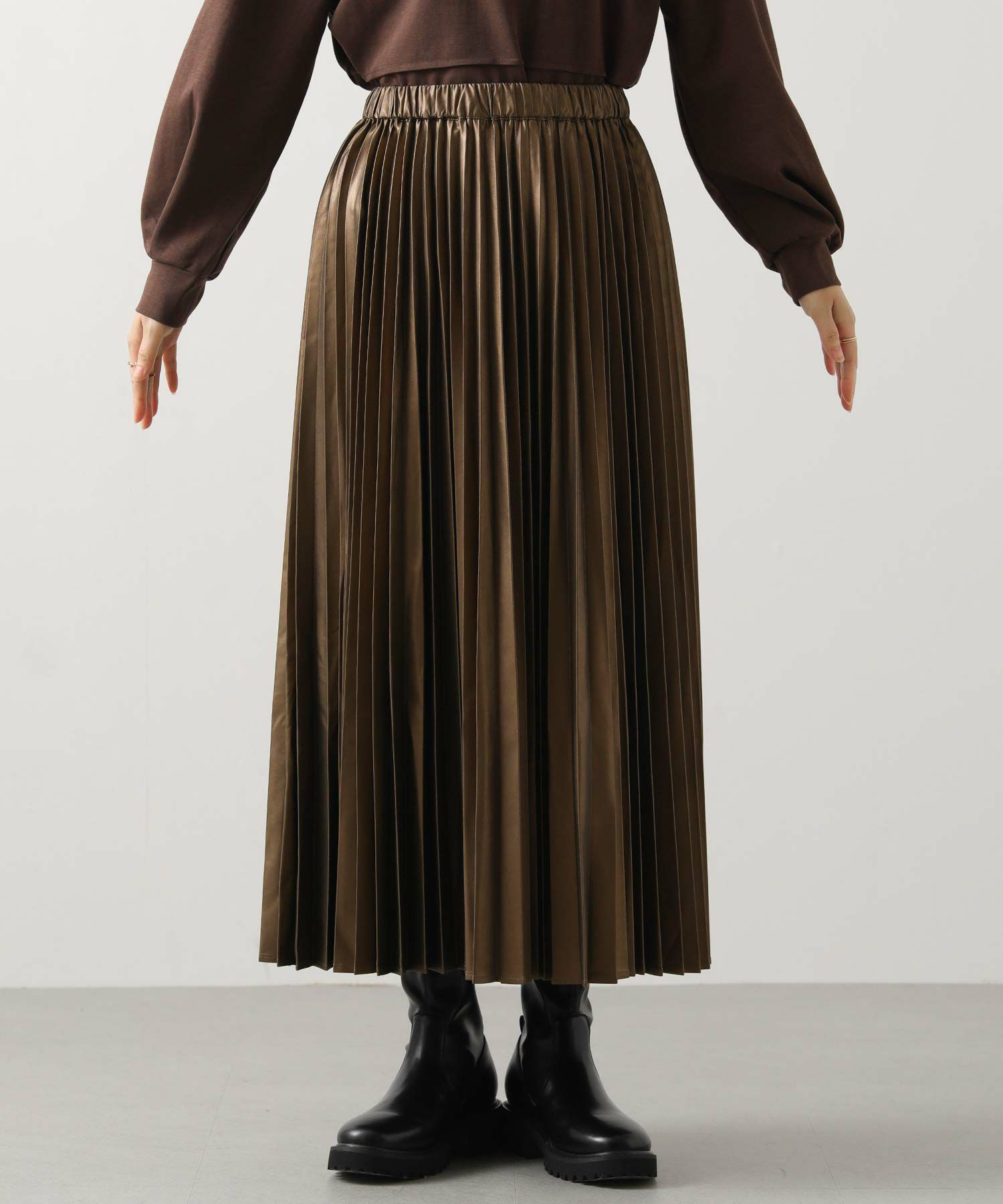 さり気ないツヤ感のあるフェクレザーのモードな雰囲気とプリーツの掛け合わせで、甘くなりがちなプリーツスカートをマニッシュにアップデート。