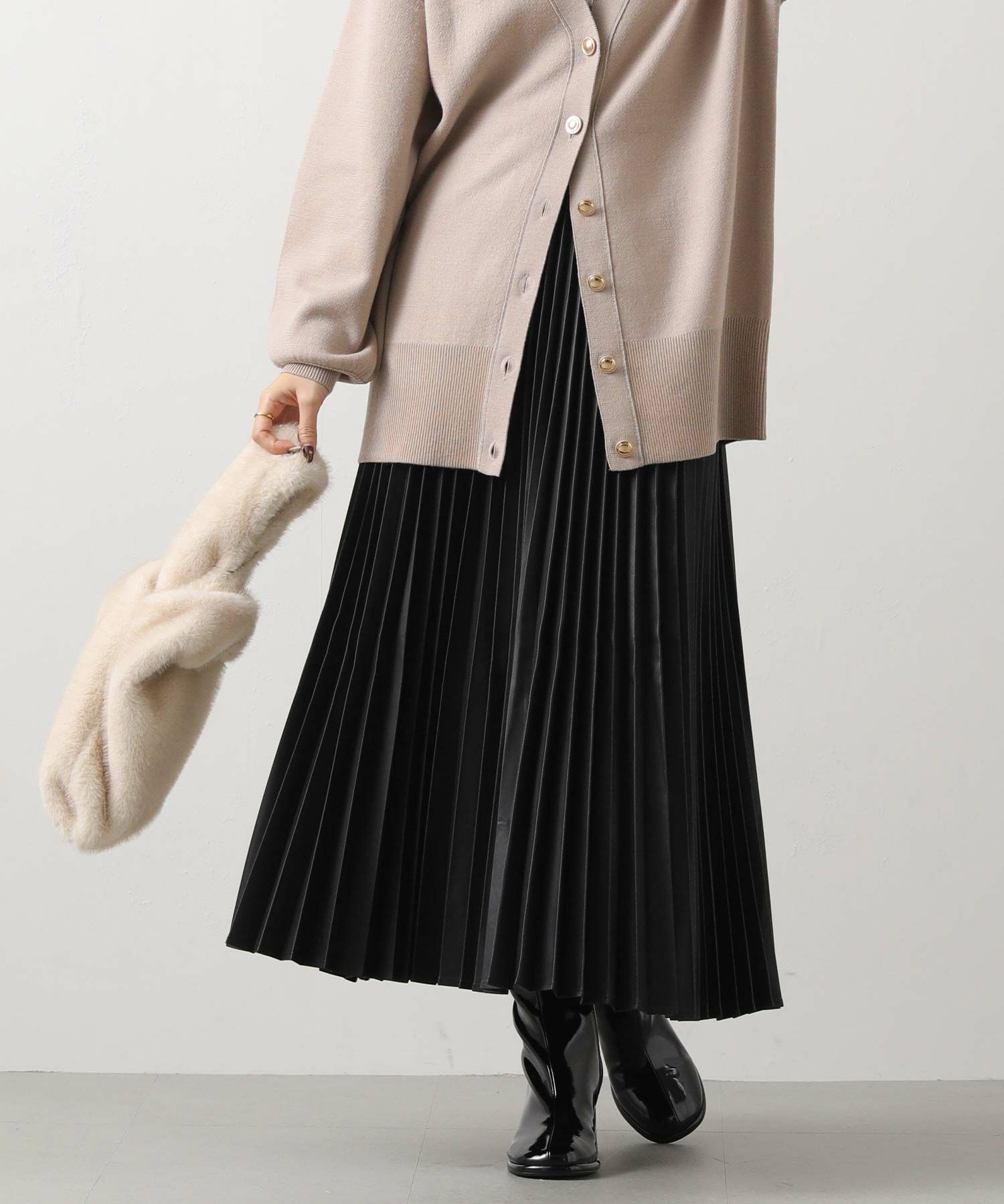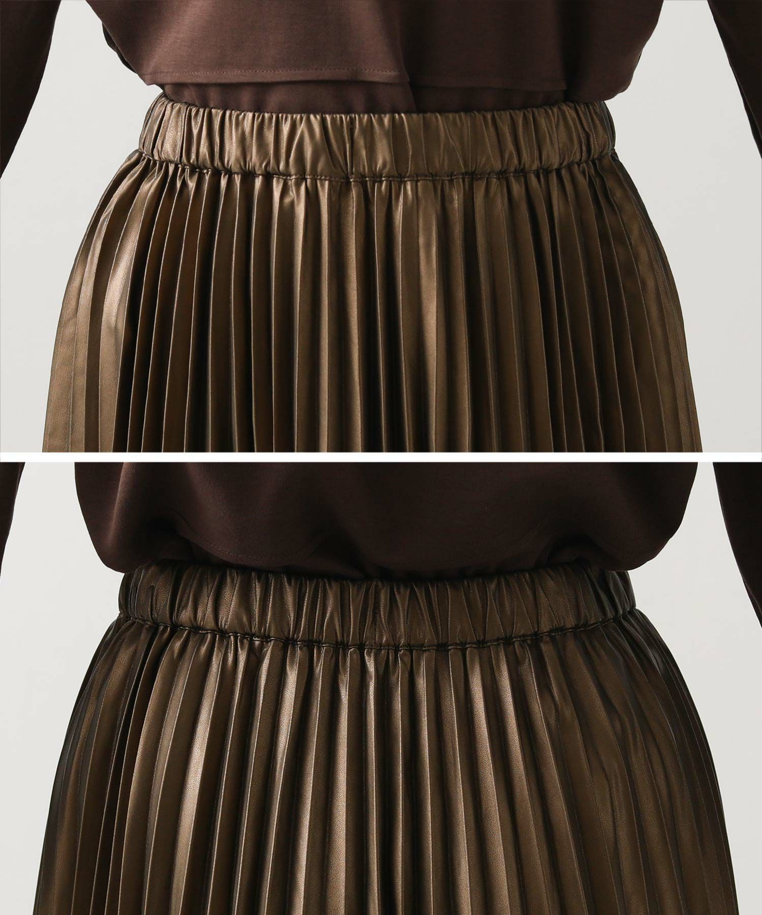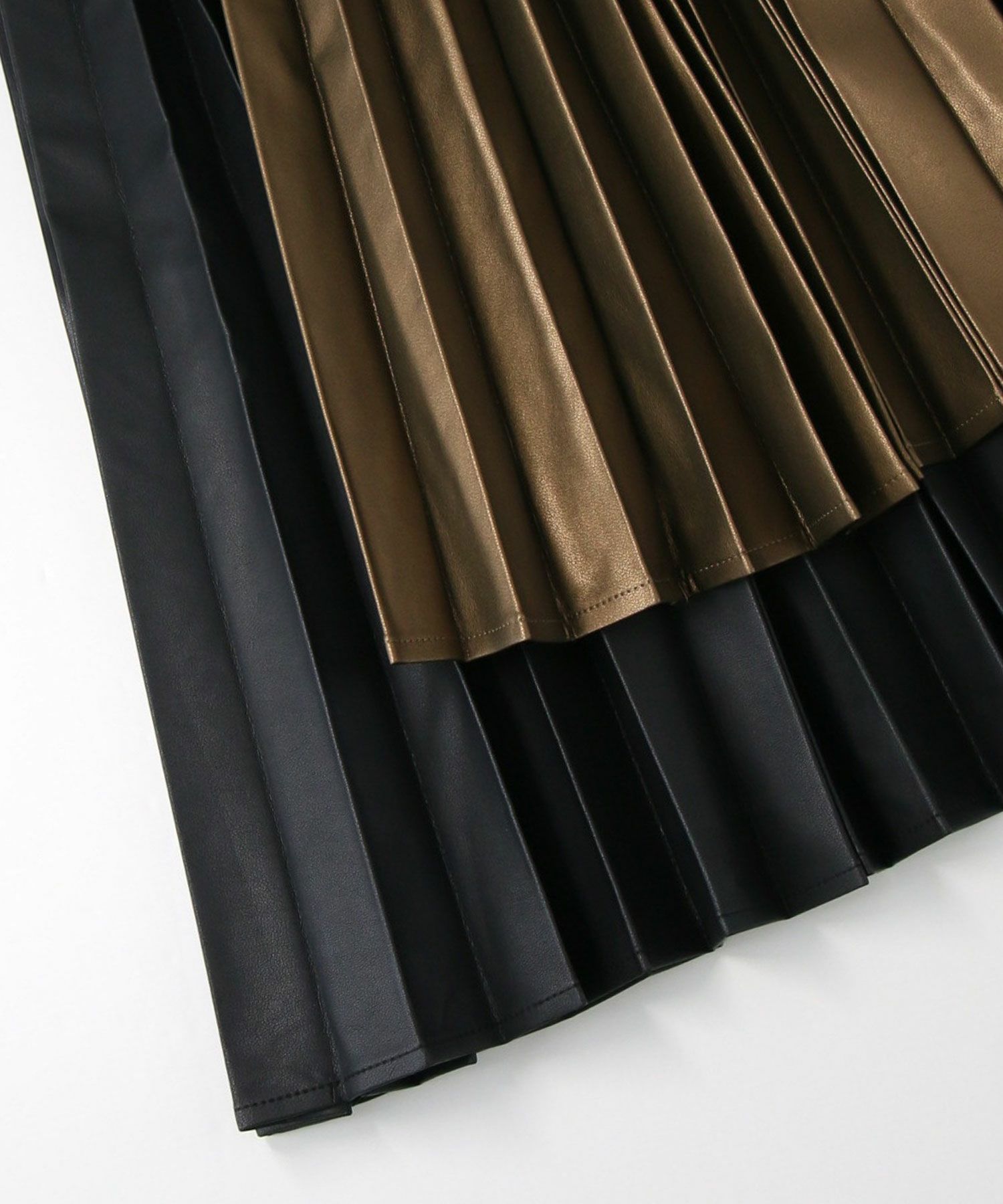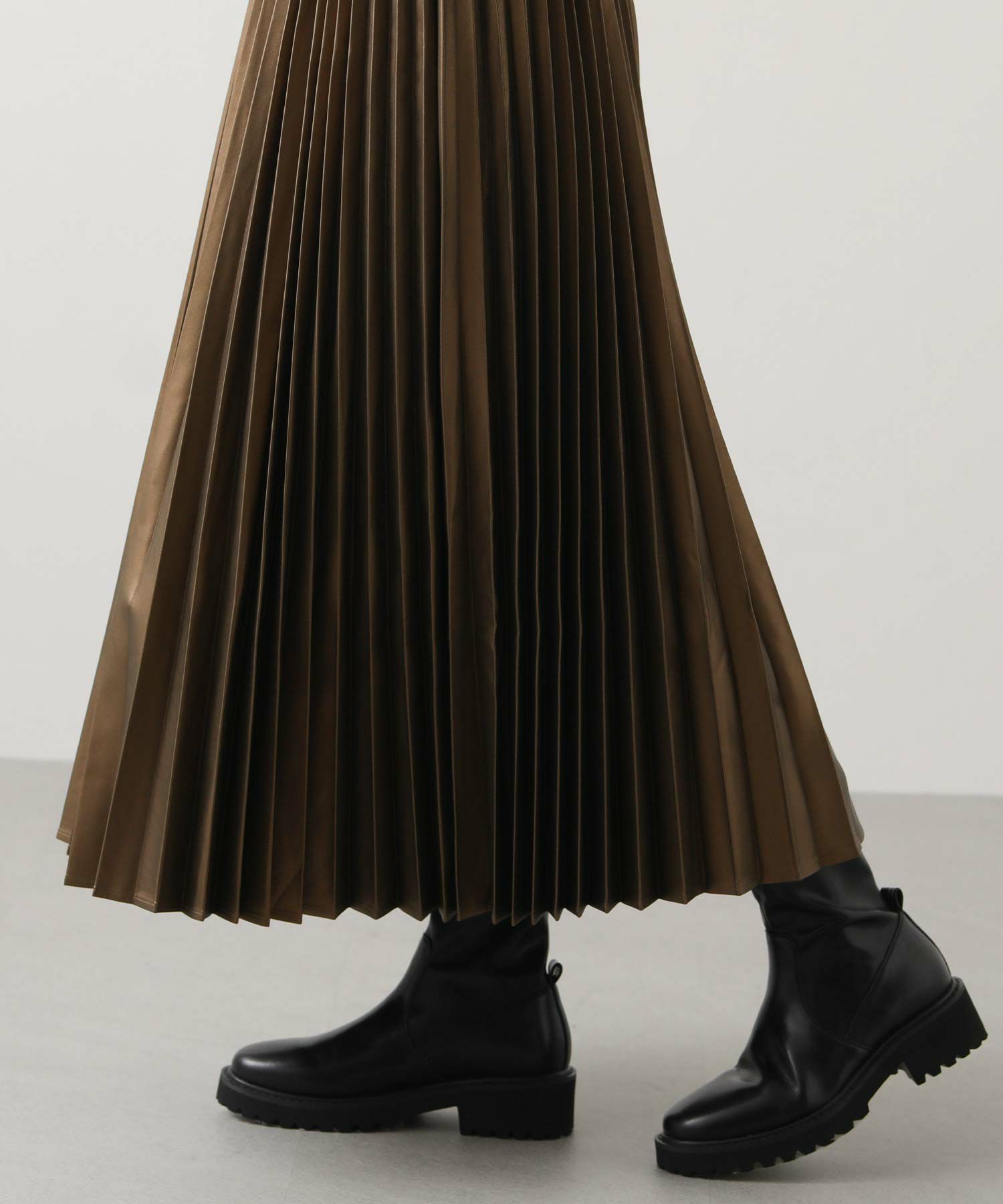 さり気ないツヤ感のあるフェクレザーのモードな雰囲気とプリーツの掛け合わせで、甘くなりがちなプリーツスカートをマニッシュにアップデート。