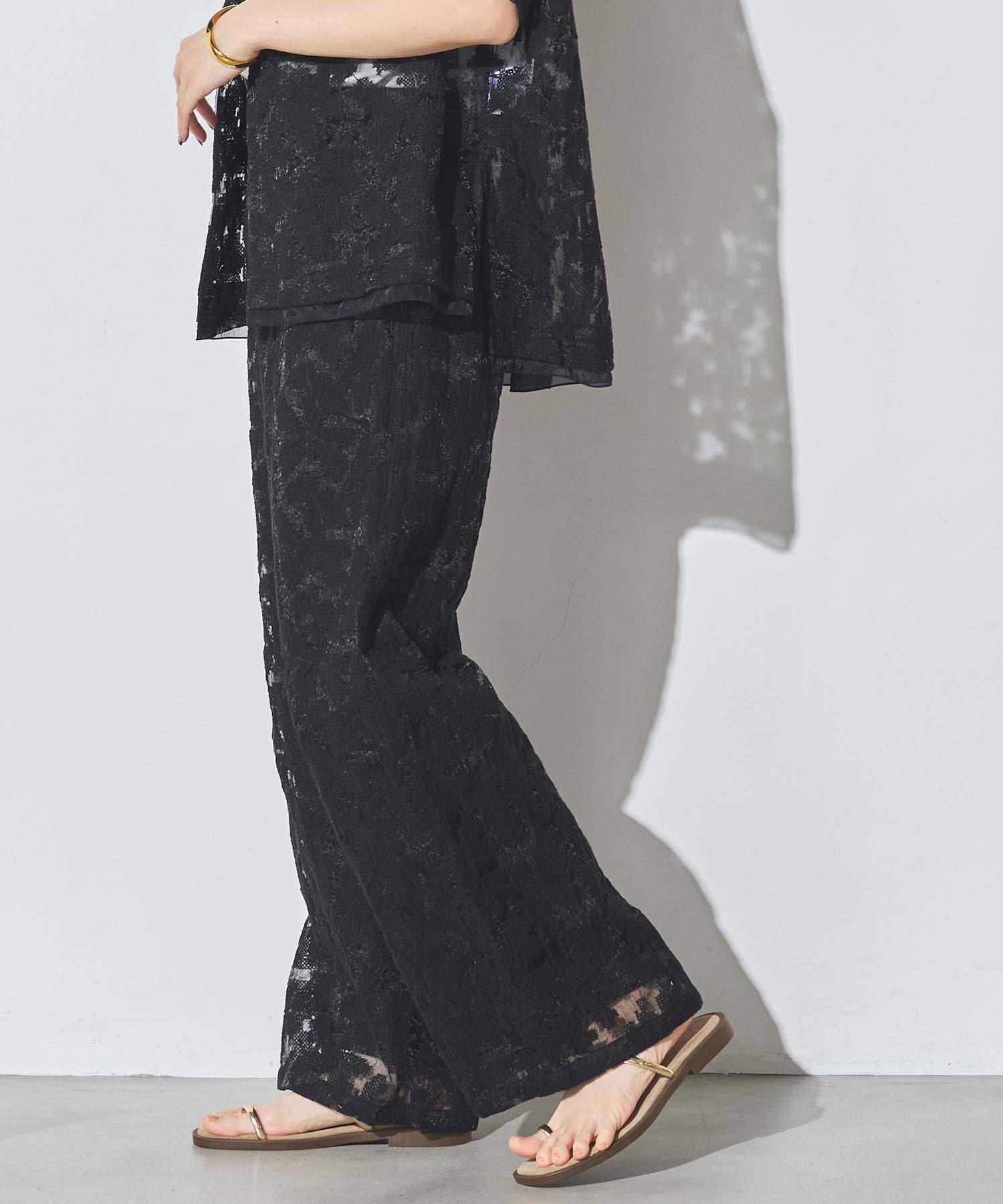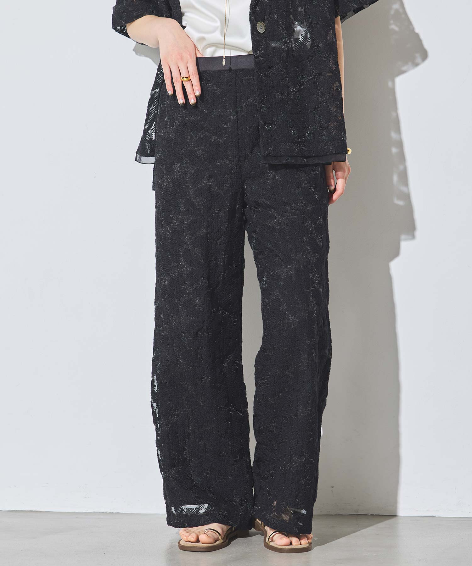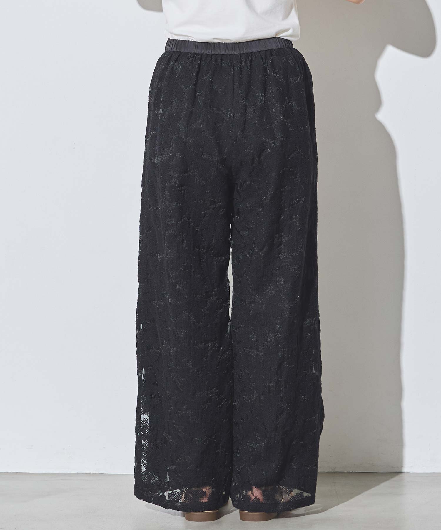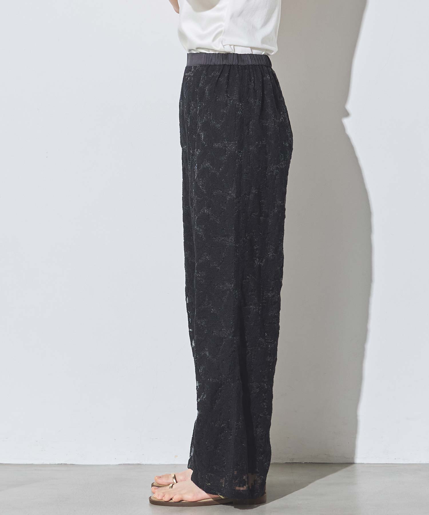 オーガンジーの透け感で重たくなり過ぎず、旬な抜け感を引き立ててくれるレースパンツ。