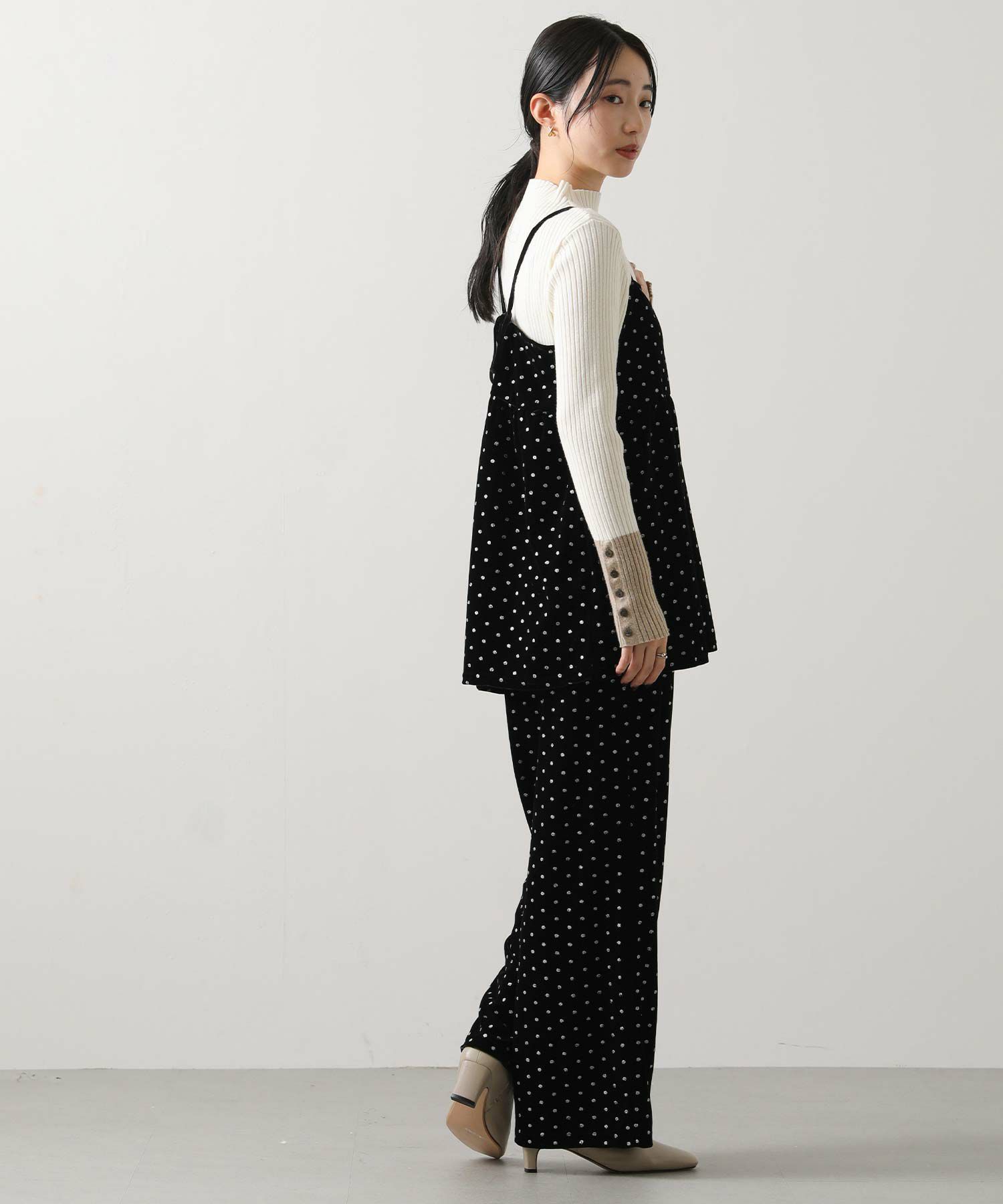 同素材のラメドットベロアキャミ(OD266418001)とセットアップで着るのもオススメ。