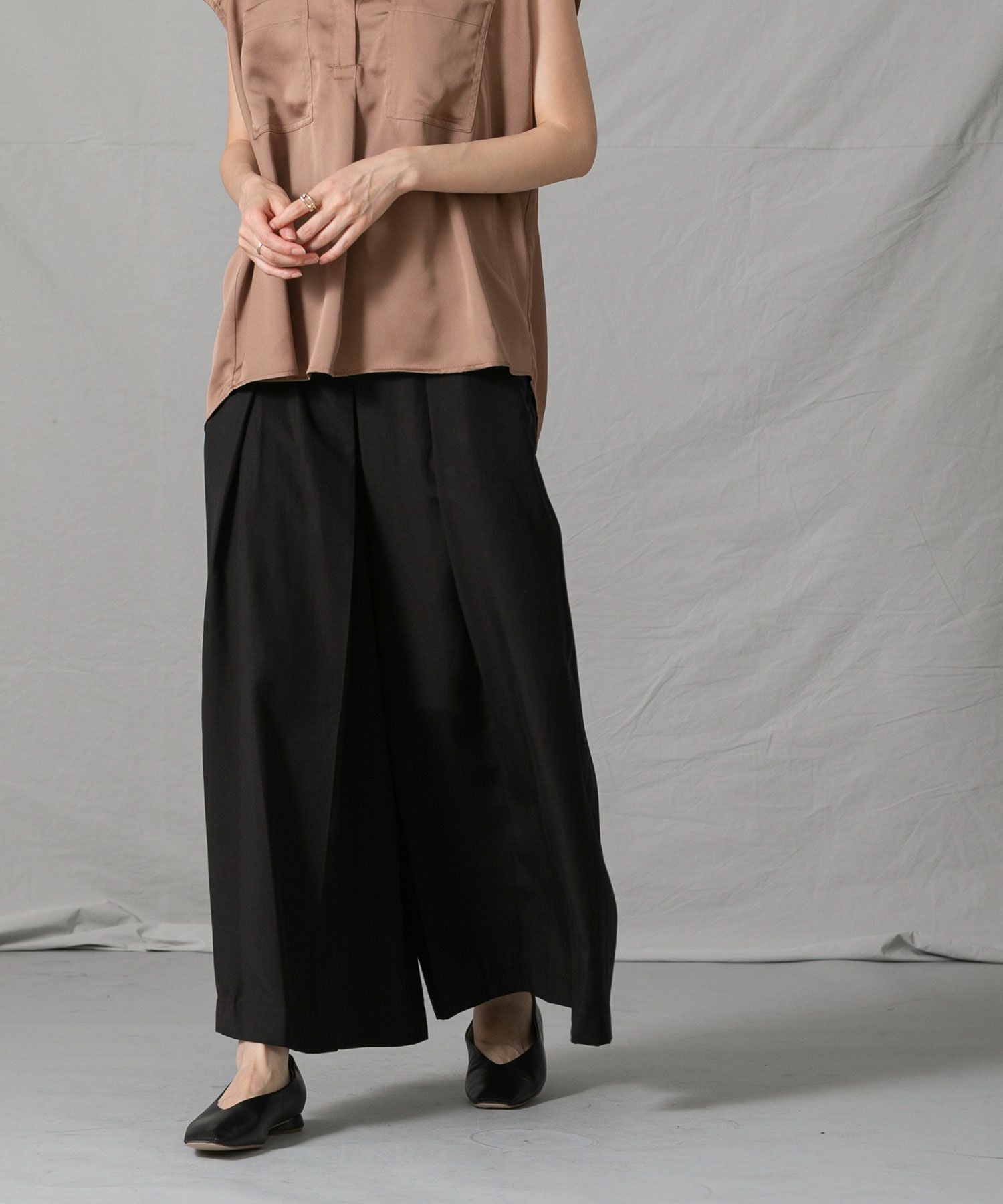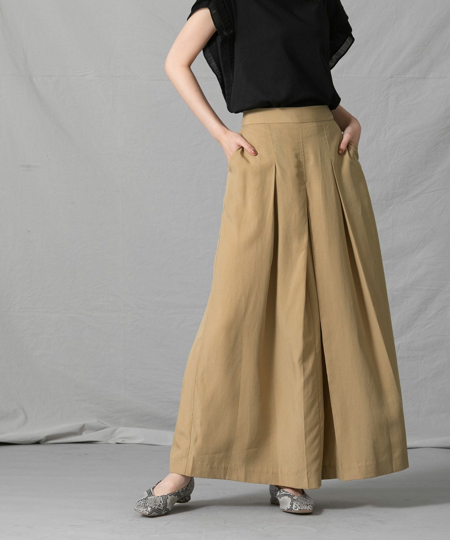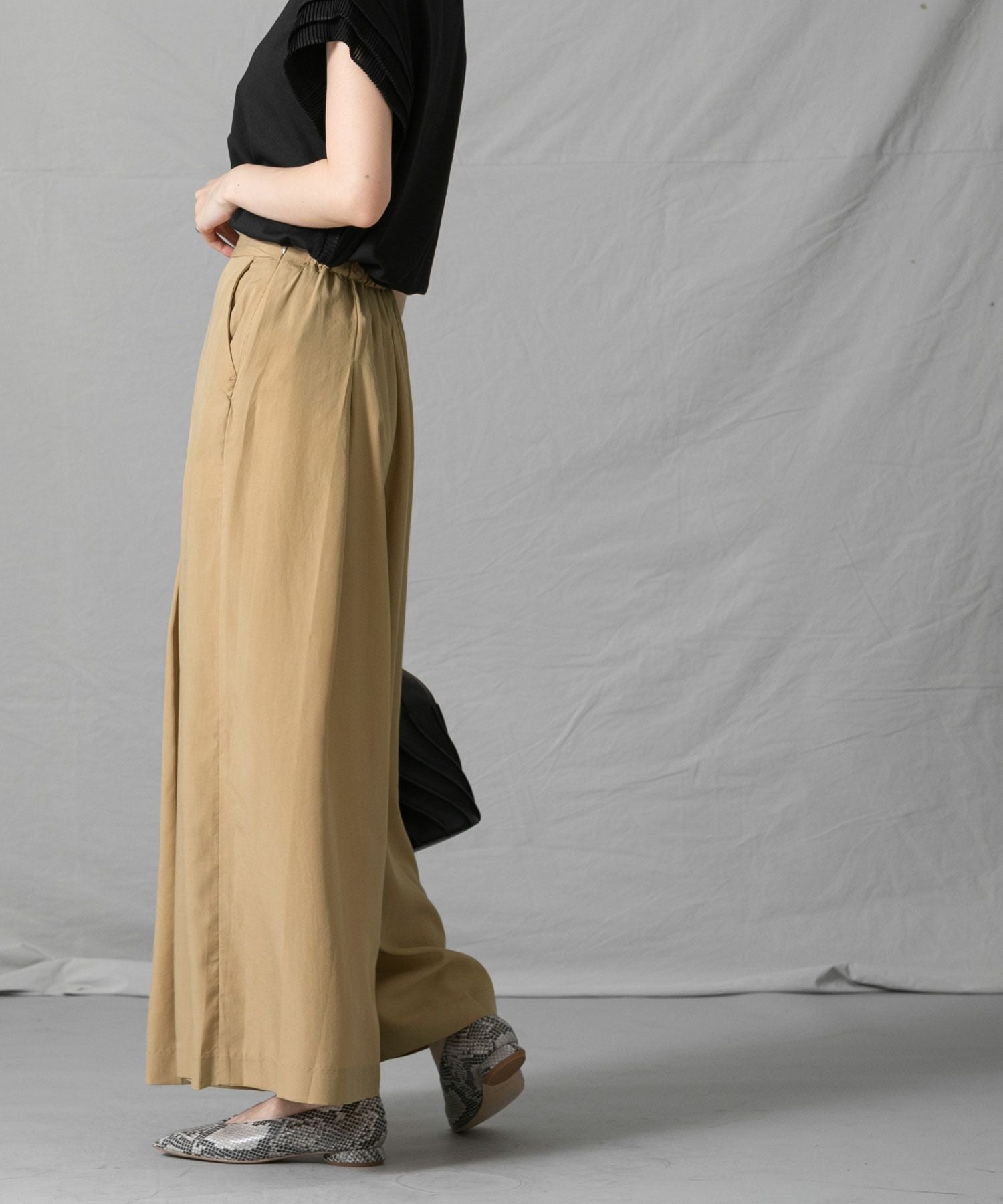 柔らかく落ち感のある生地を使用したワイドパンツをセレクトしました。
