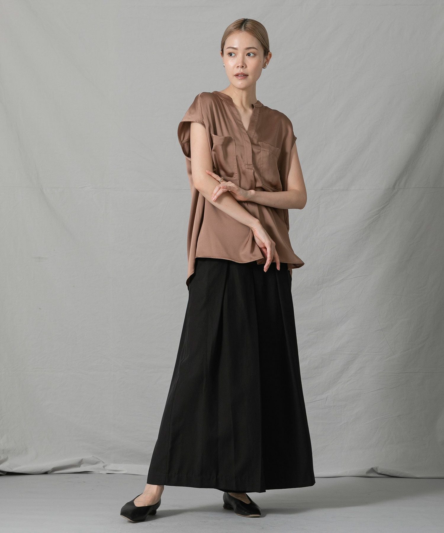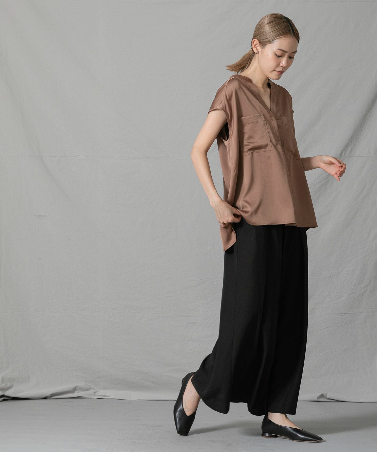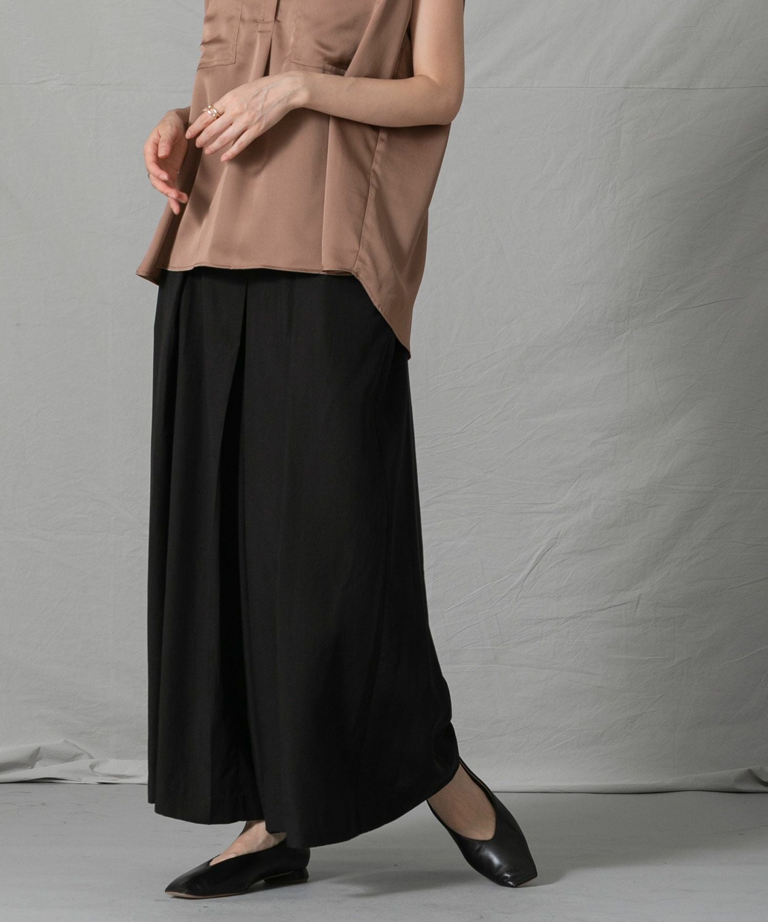 柔らかく落ち感のある生地を使用したワイドパンツをセレクトしました。