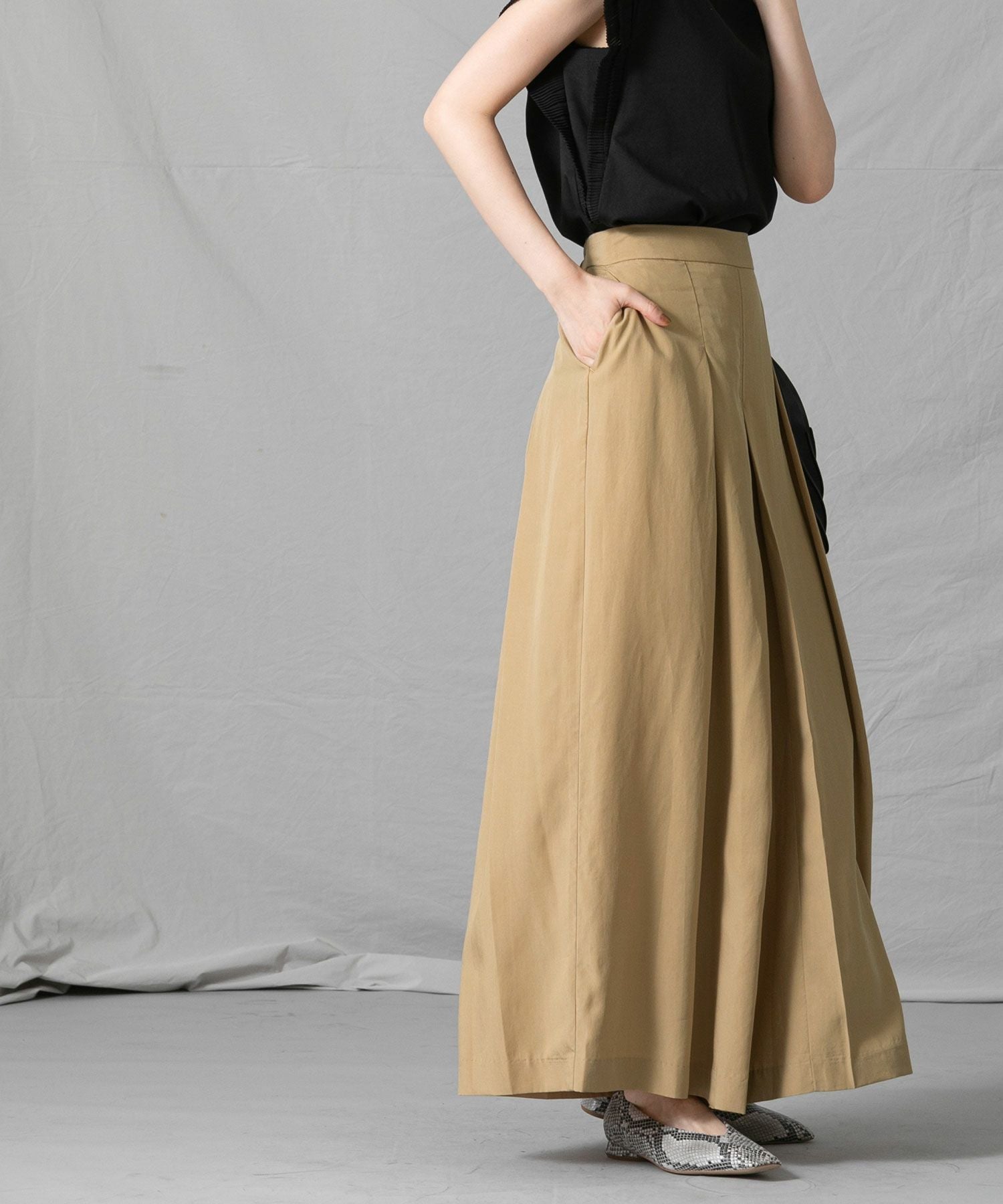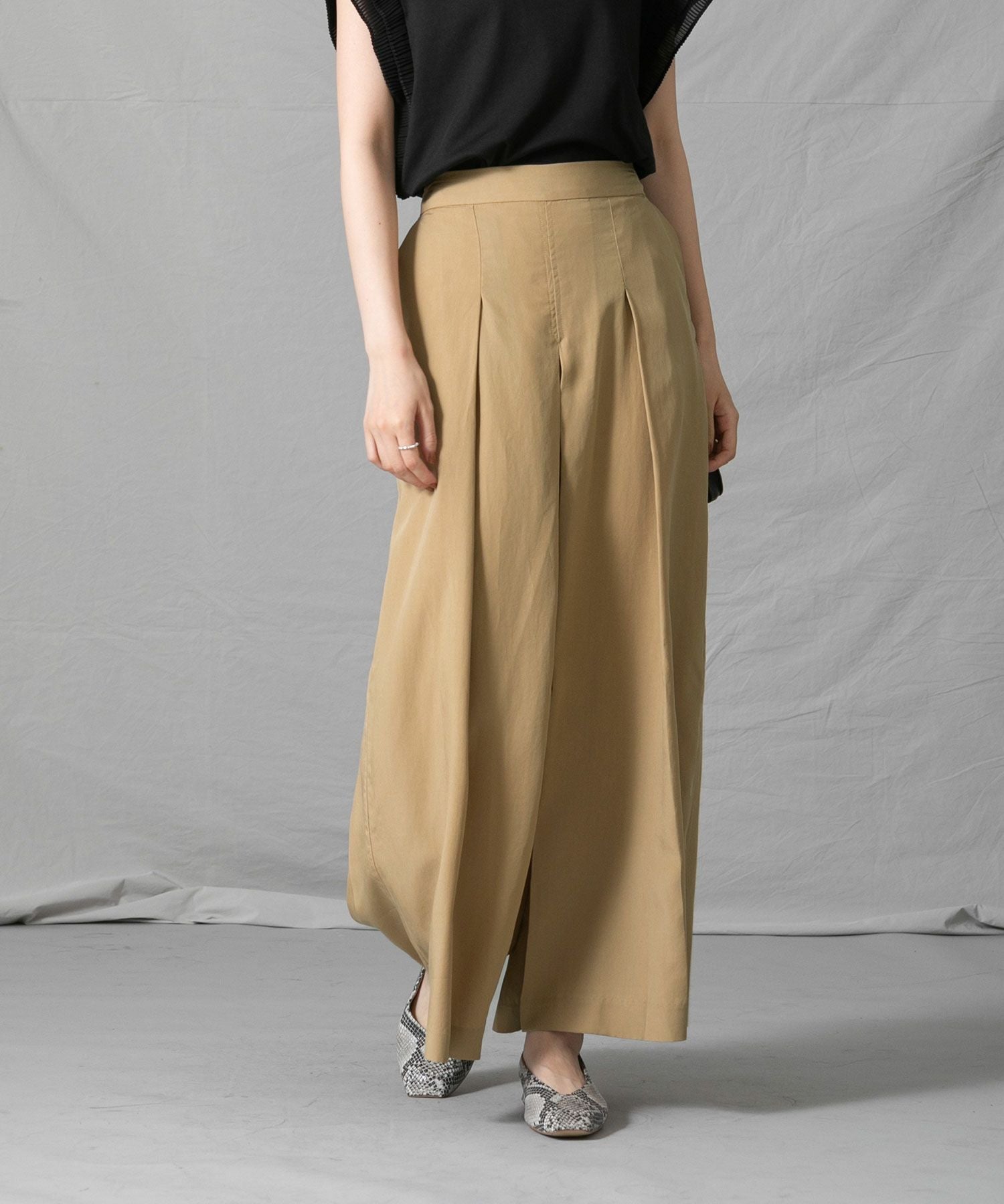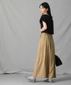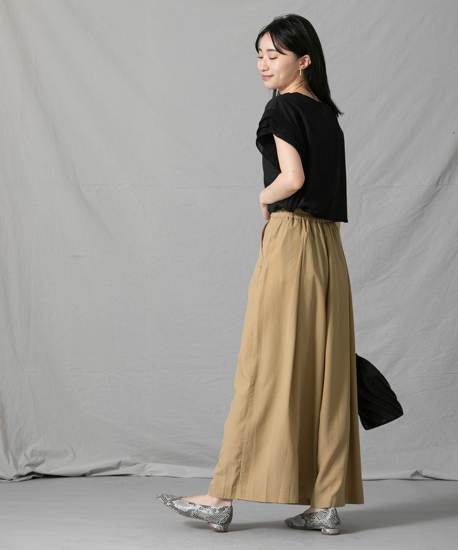 分量感のあるシルエットですが、テンセル生地の落ち感ですっきり見えします。後ろがゴムになっているので、見た目の印象よりもリラックスした穿き心地なのも嬉しいポイント◎