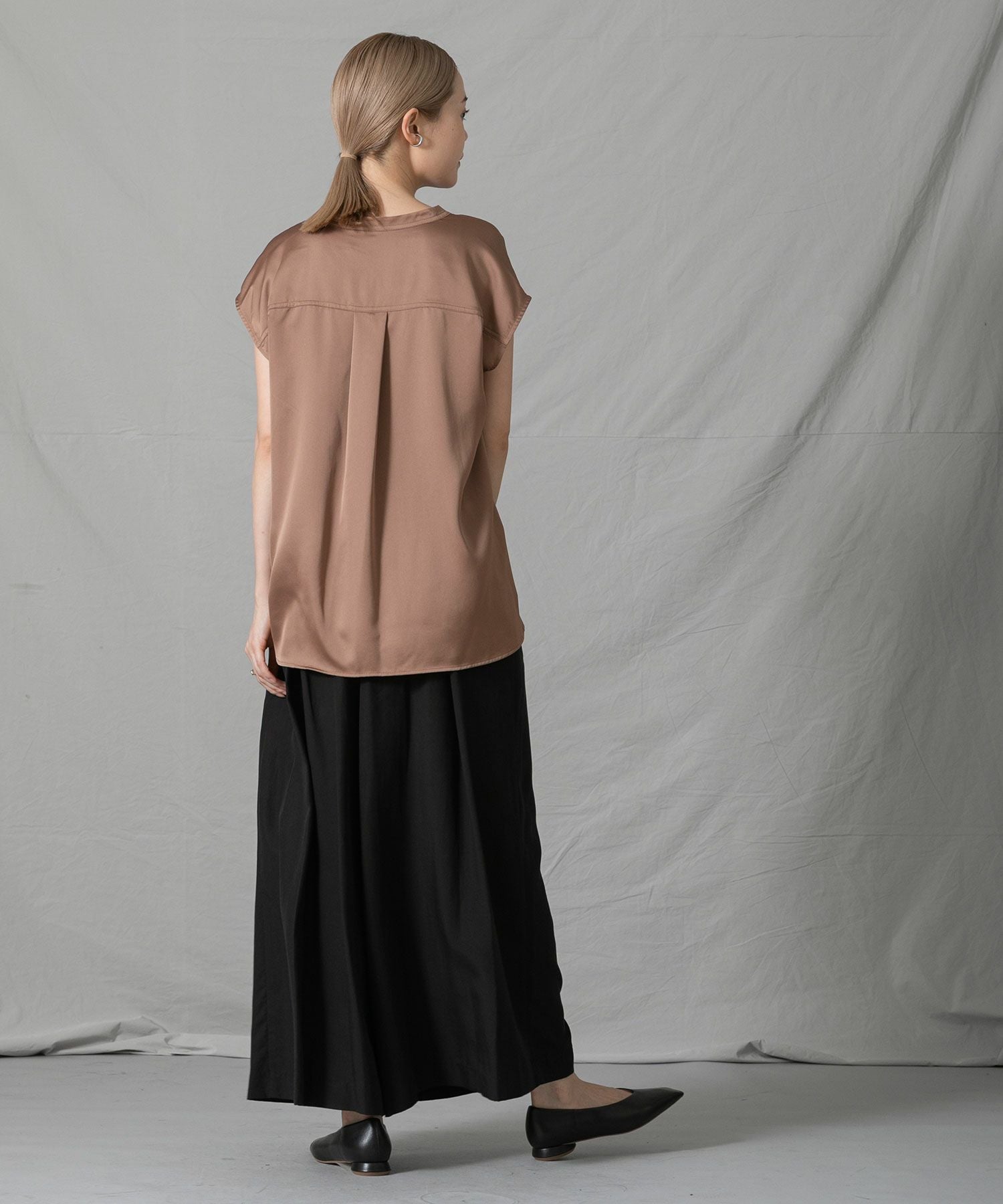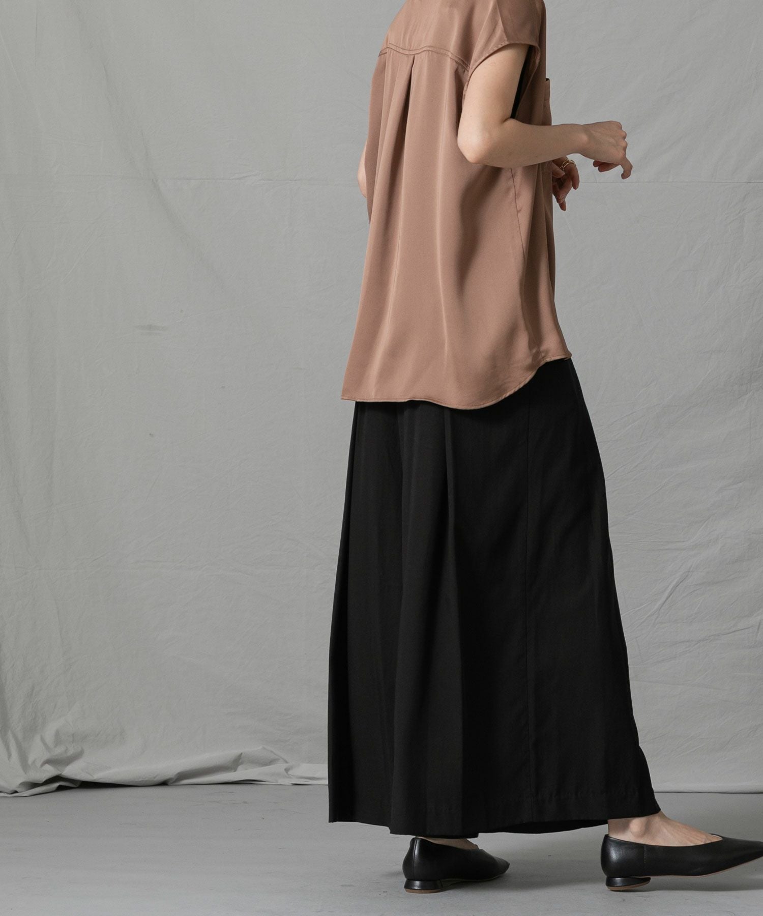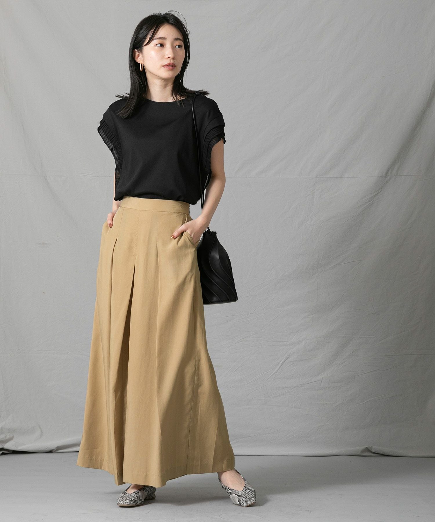 分量感のあるシルエットですが、テンセル生地の落ち感ですっきり見えします。後ろがゴムになっているので、見た目の印象よりもリラックスした穿き心地なのも嬉しいポイント◎