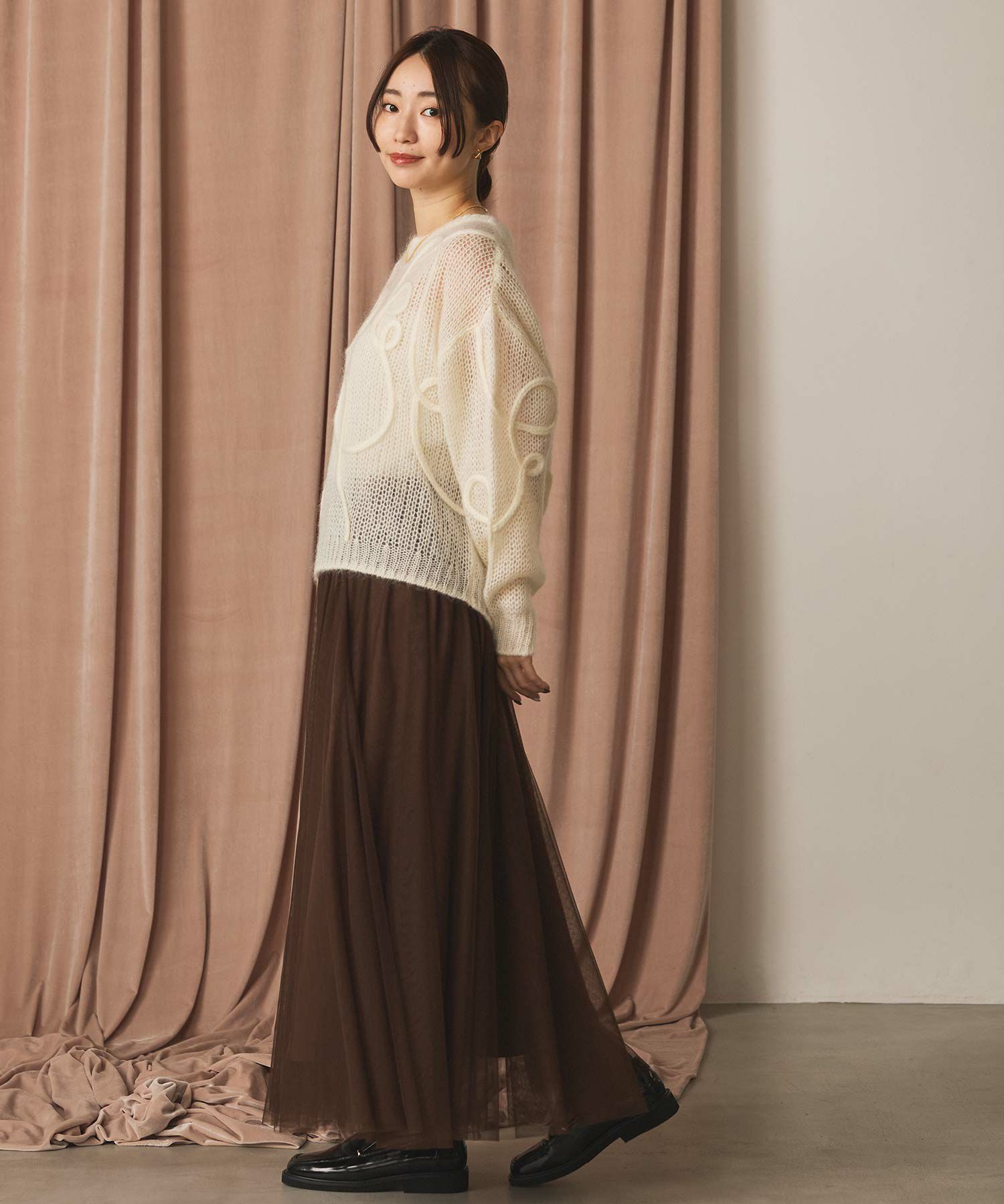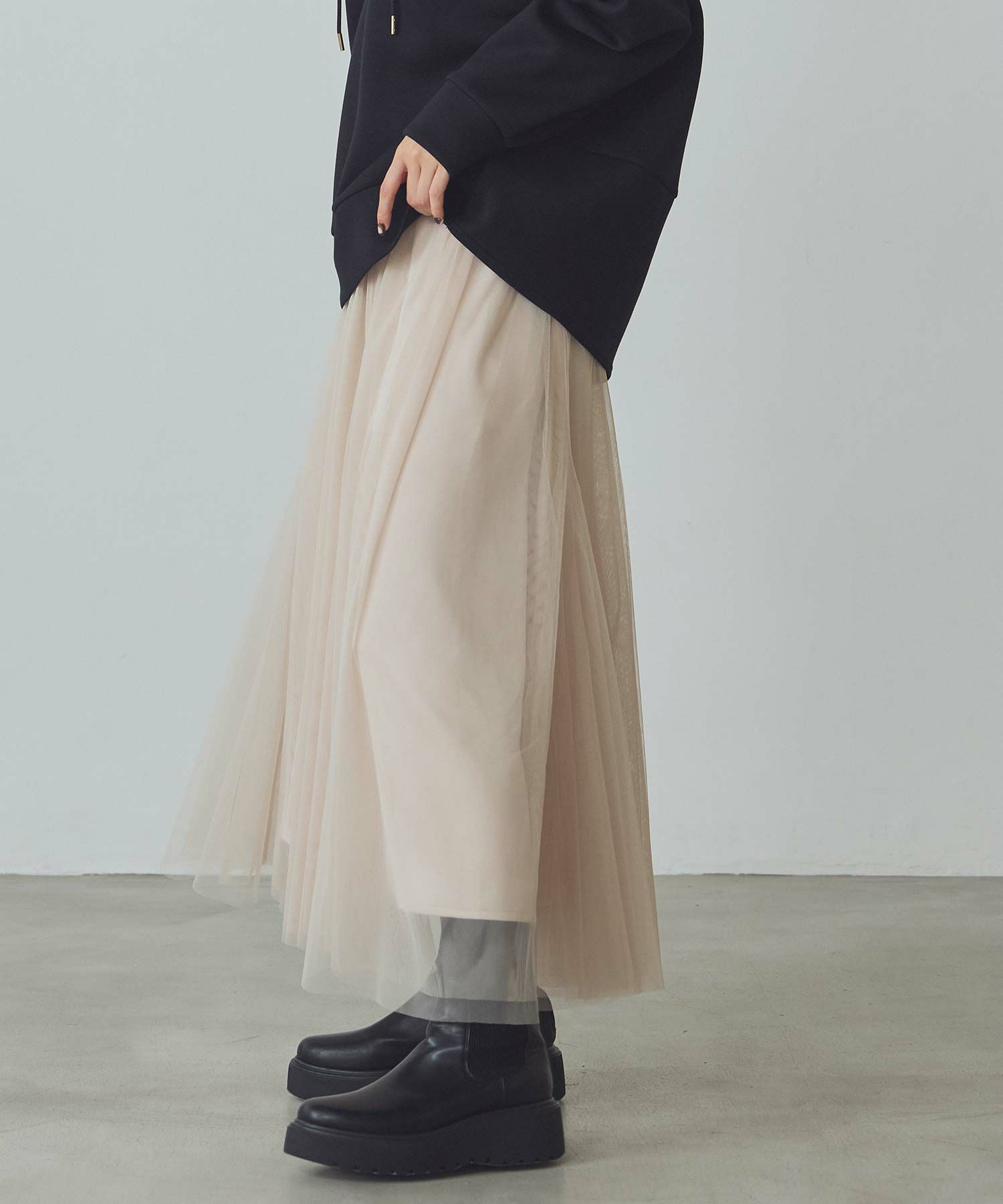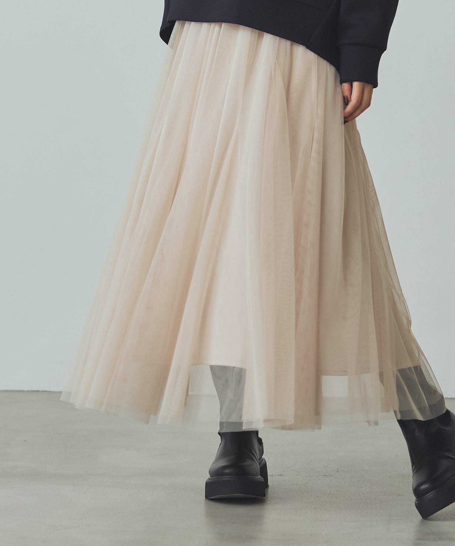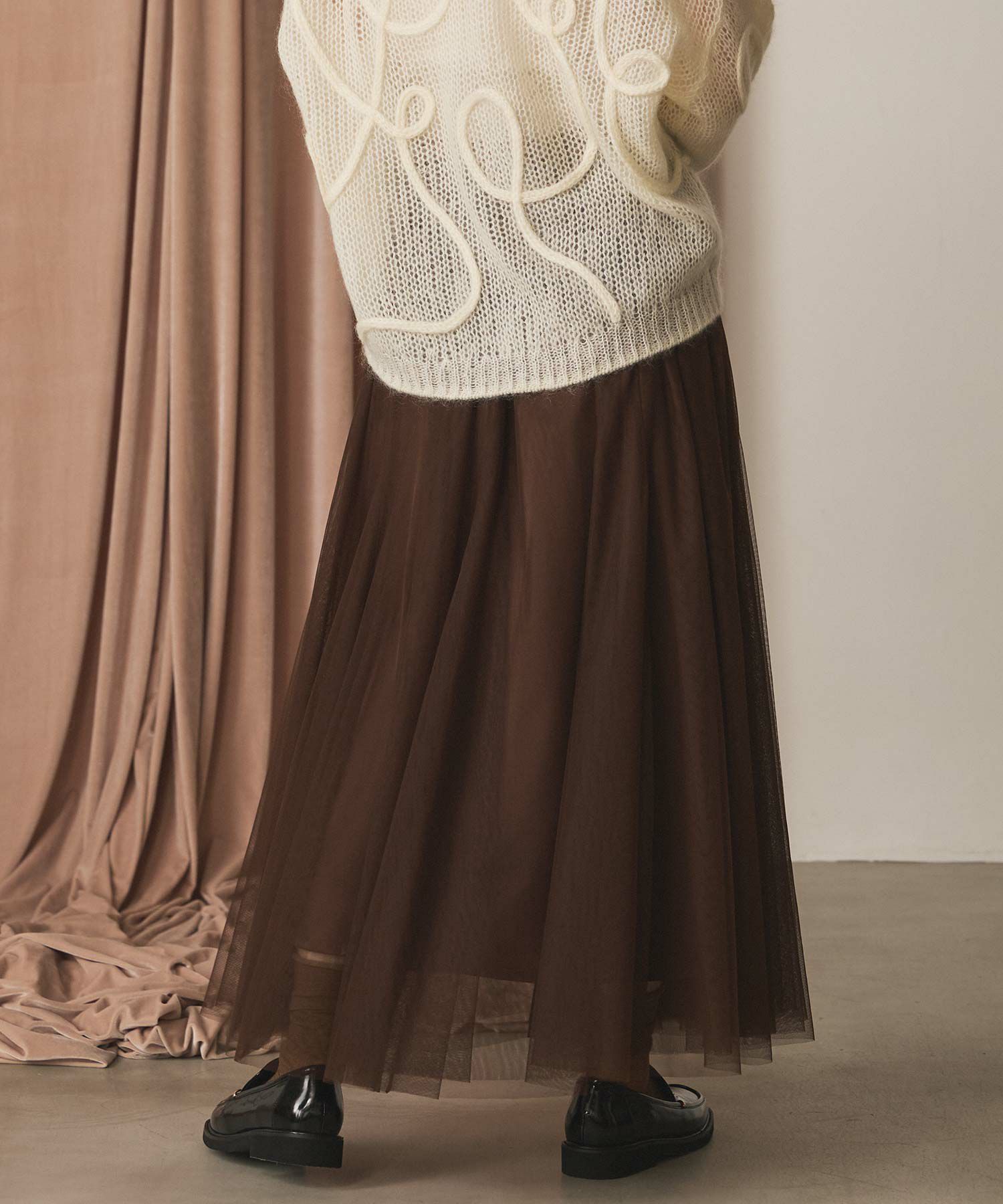 ふうわりと程よく広がるチュール素材を使用したボリュームのあるスカート。