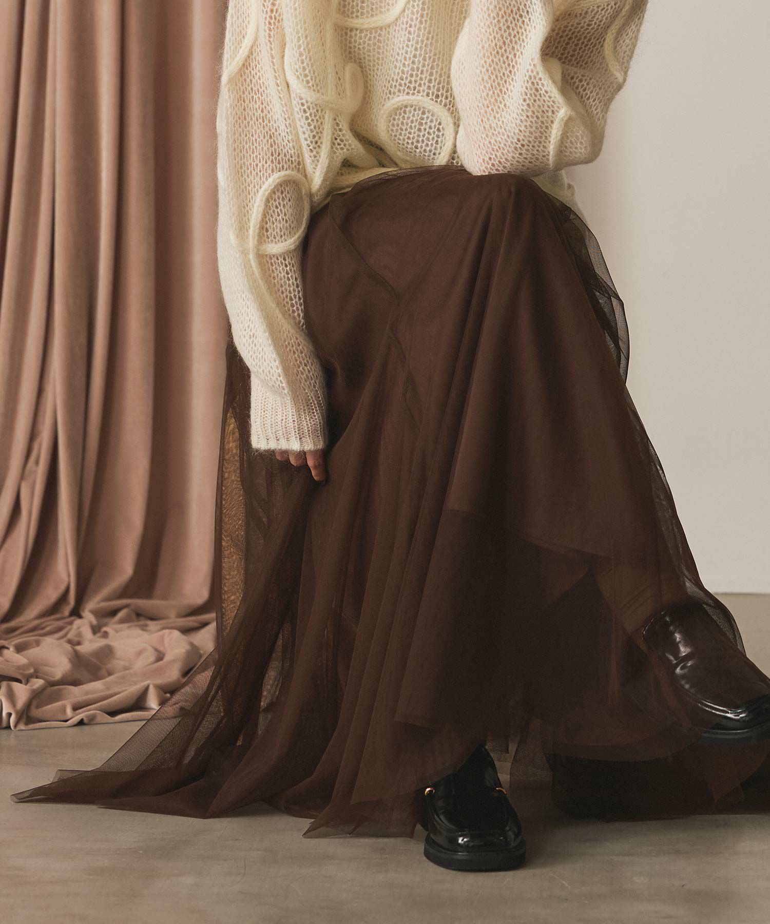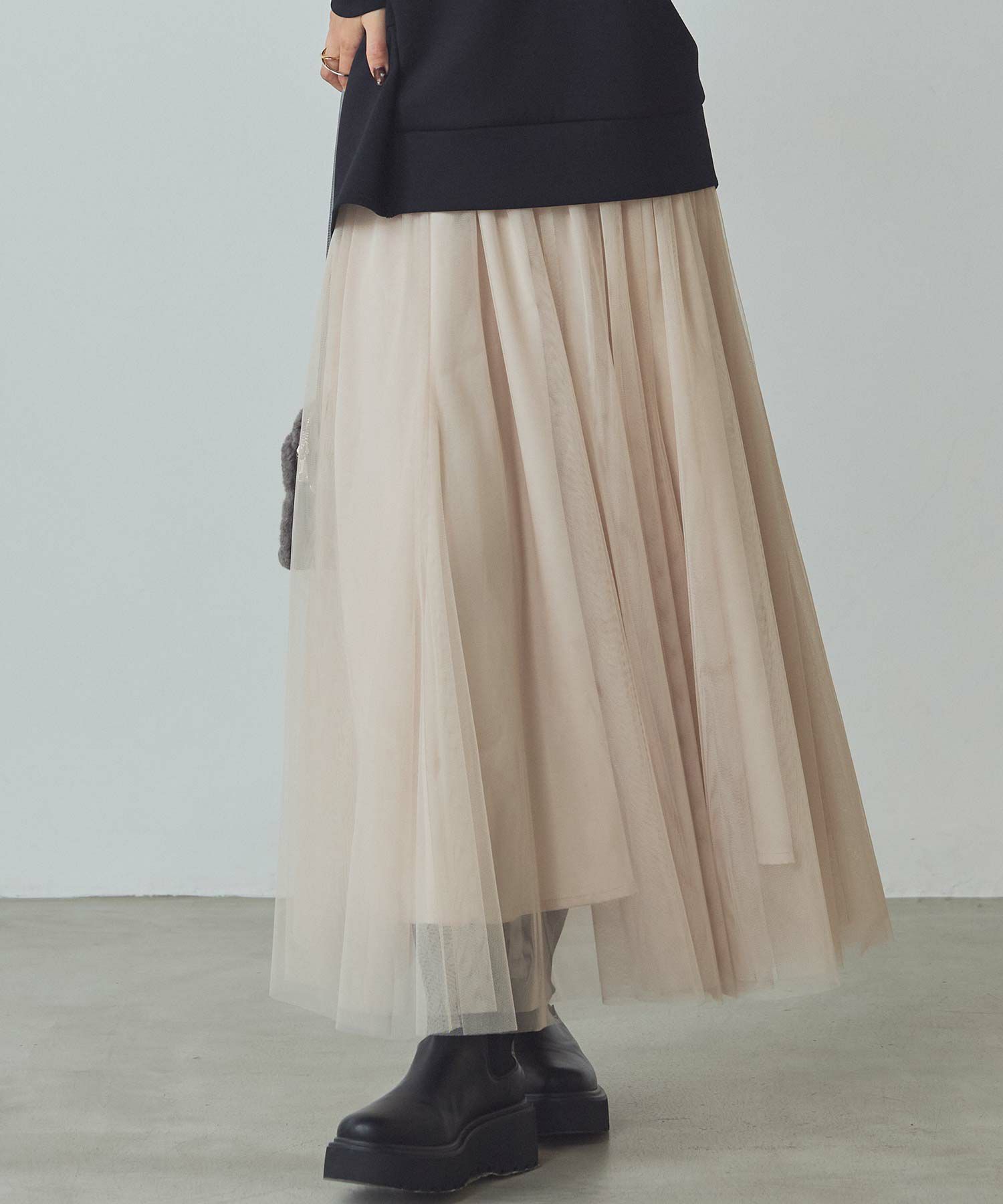 ふうわりと程よく広がるチュール素材を使用したボリュームのあるスカート。