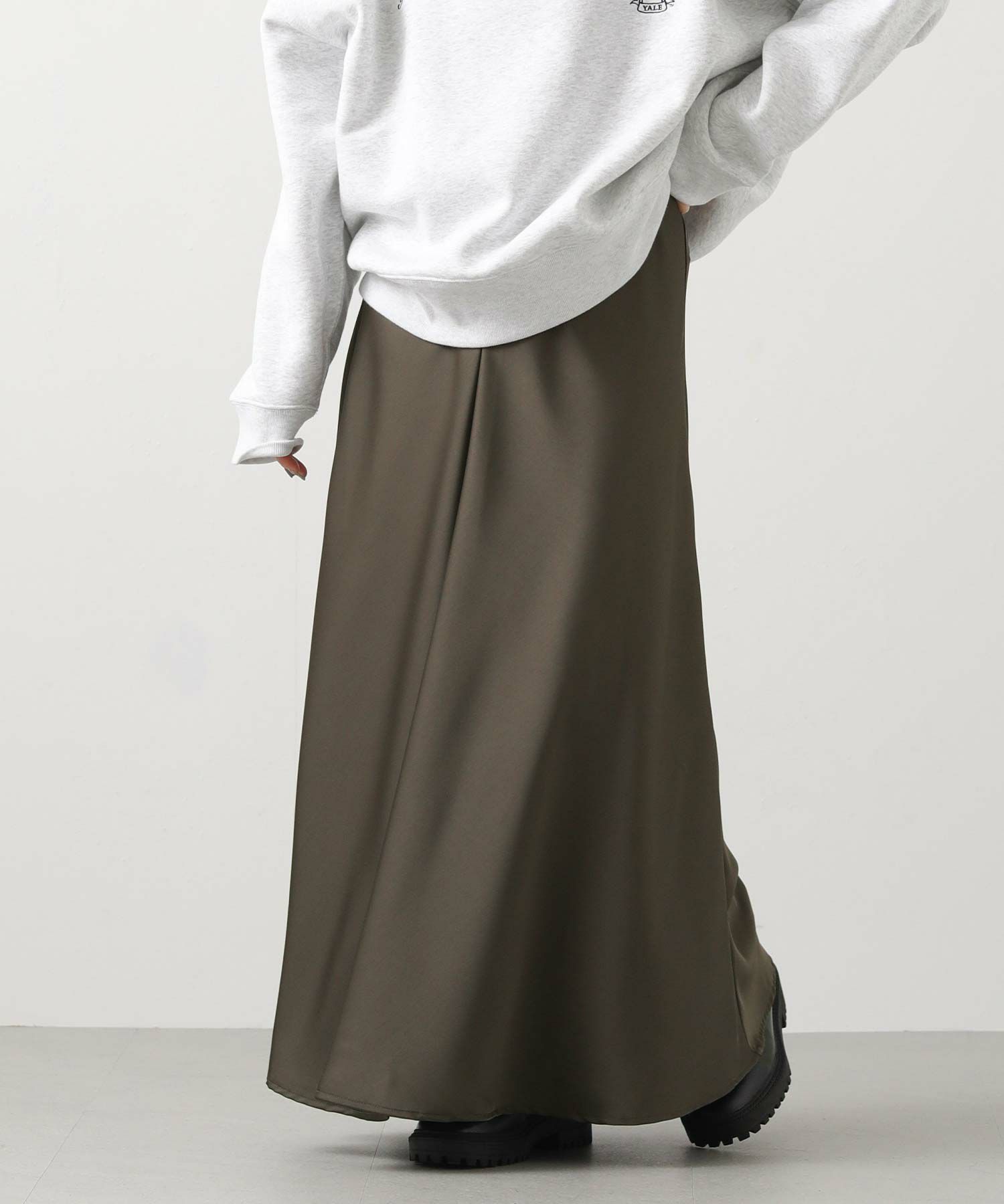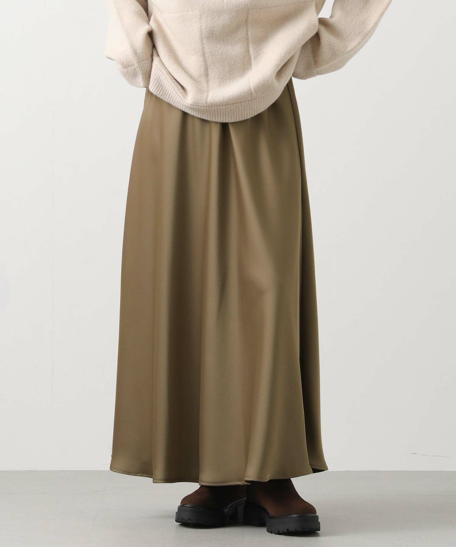 きれいなフレアシルエットの出るサテン生地スカート。