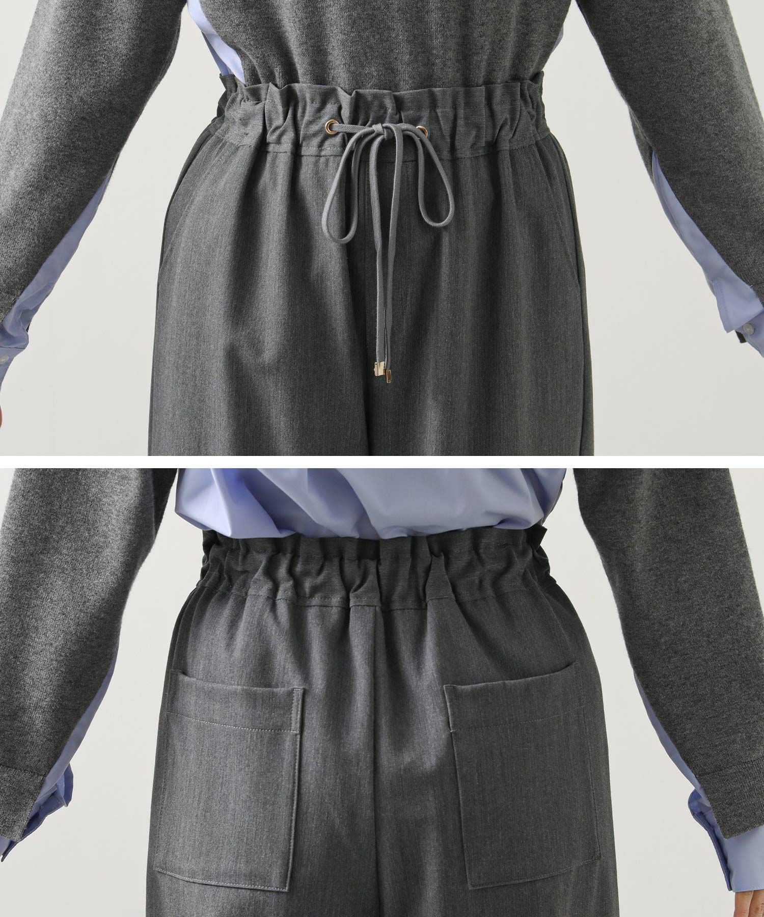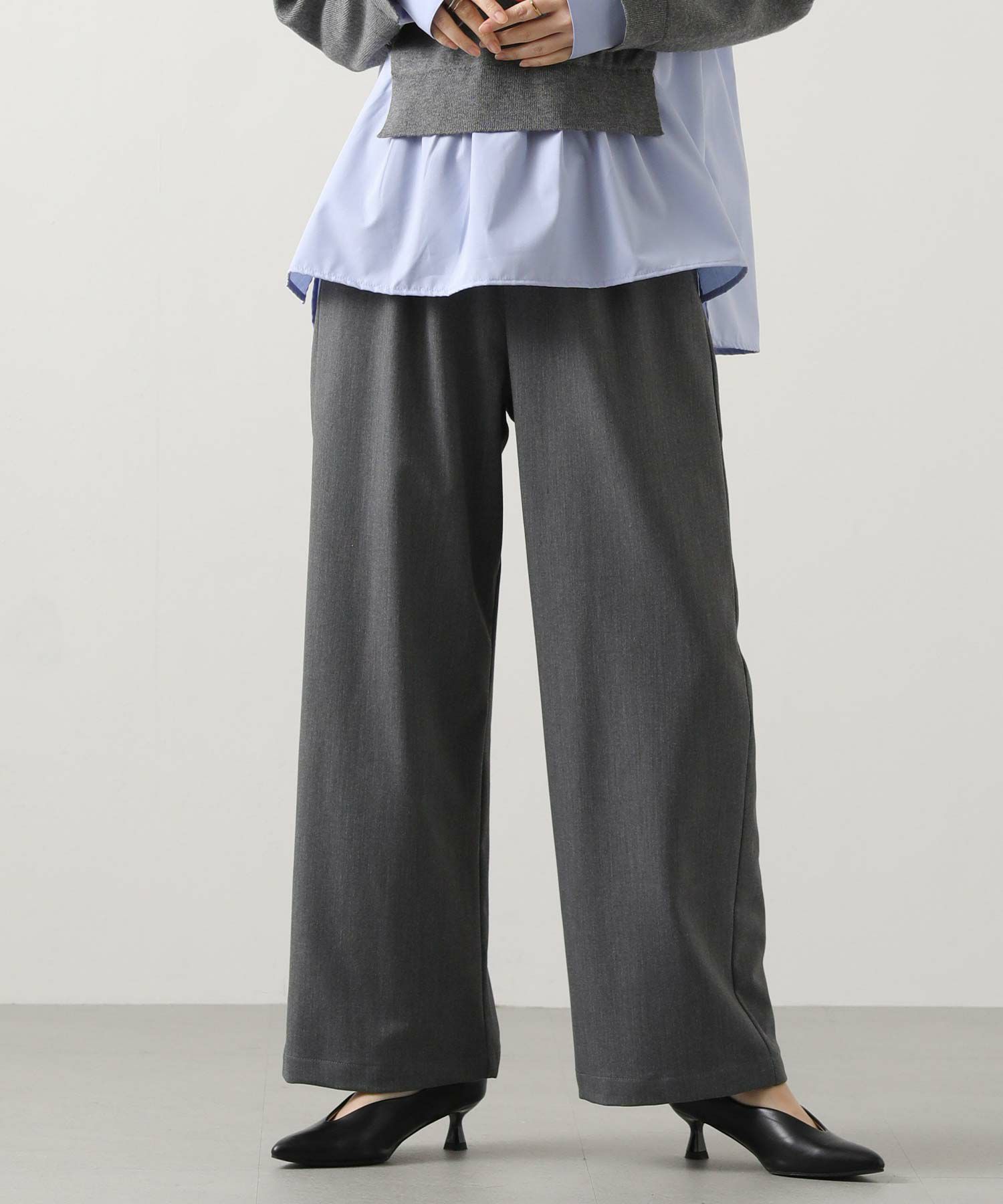 ウエスト総ゴムのイージーパンツながらきちんと見えする素材感なので、普段使いからオフィスでも着られるアイテム。